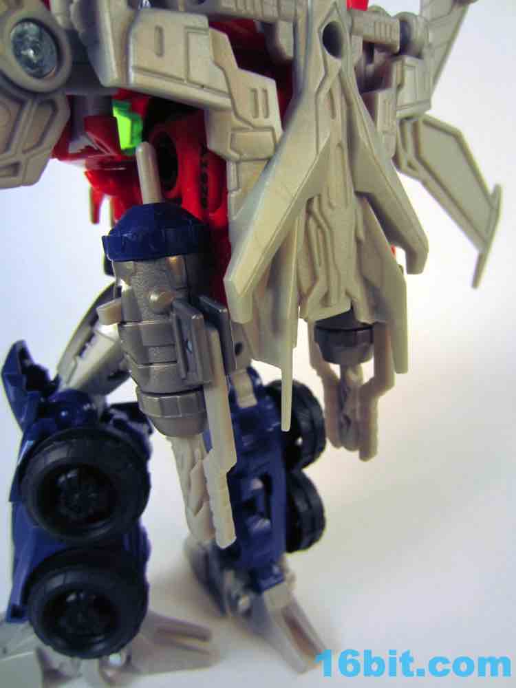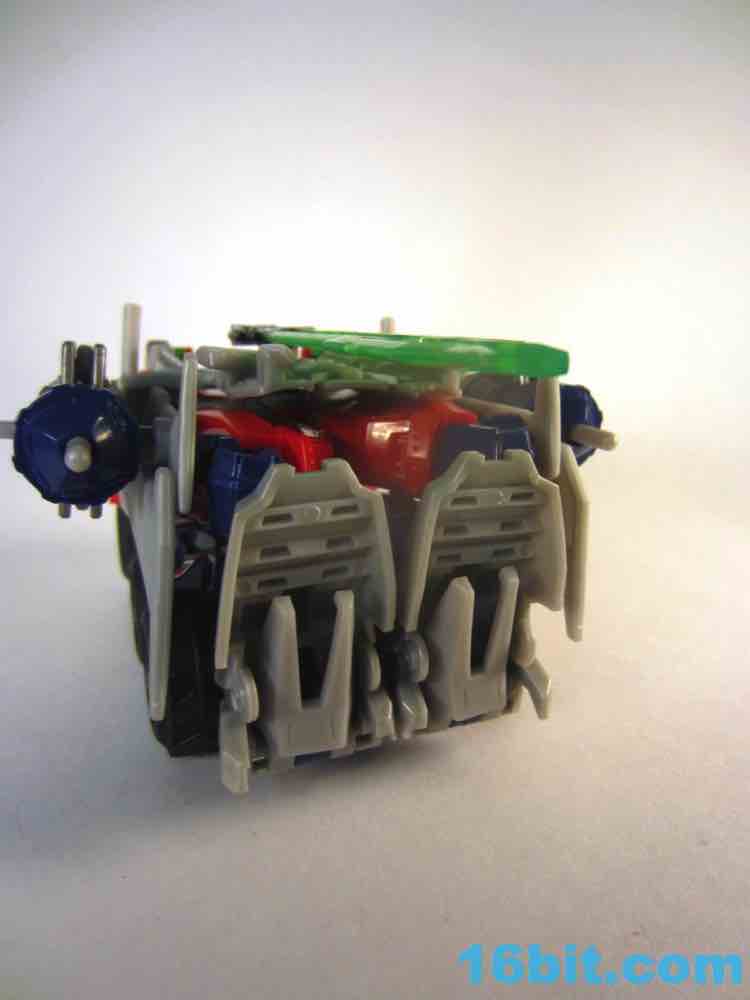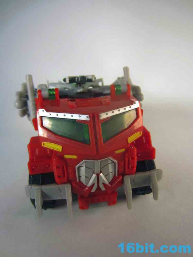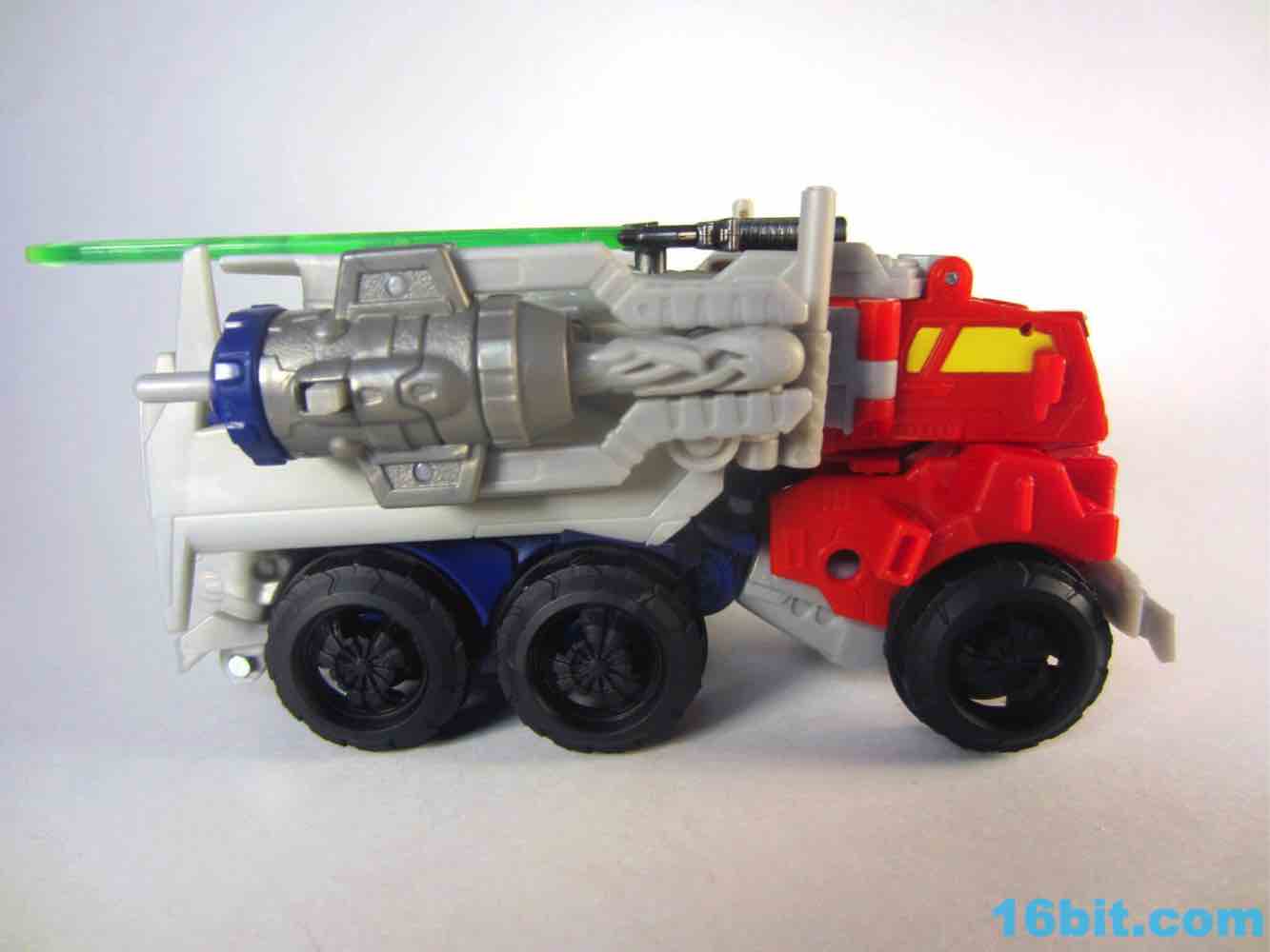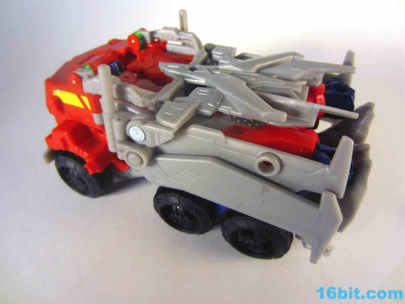 I was pretty pleased to see the jet pack fold over the cab mode nicely, with the coloring resembling the original 1984 toy's trailer a little bit. The vehicle doesn't have a lot going for it other than freely-rolling wheels, which, in all honesty, is actually a pretty big deal. Most Transformers toys don't quite have the clearance to roll around, which should be inexcusable for a toy car. It's nicely designed and not overly huge. It would be nice if it did something else, but well, there's a lot going on here as it is.