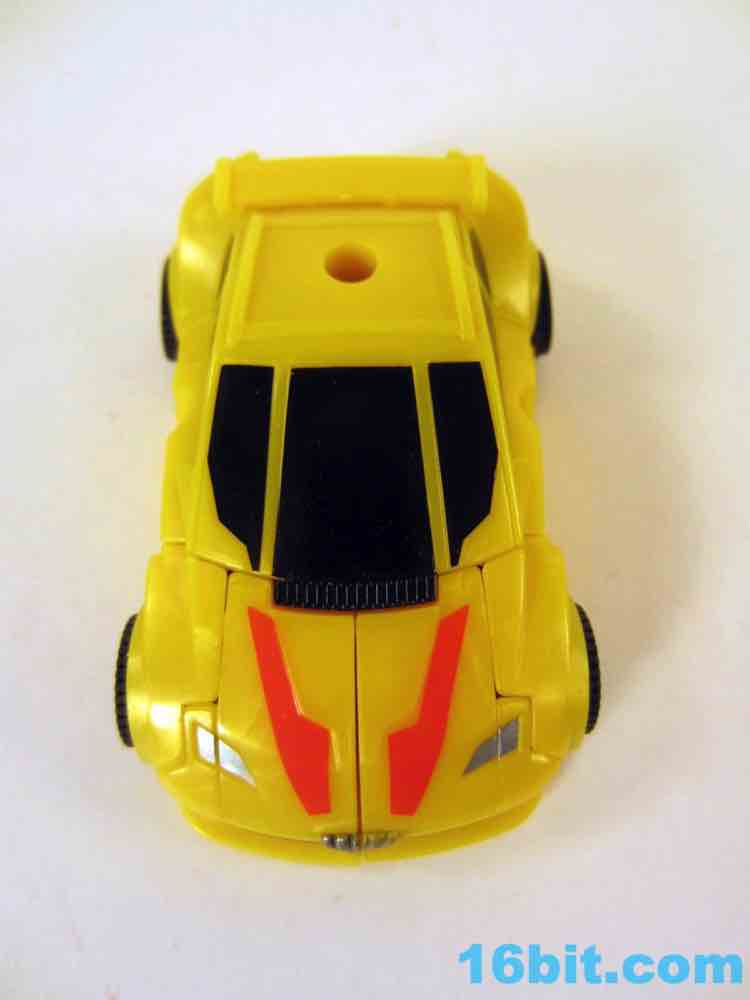 Transformation is a snap. It has a few steps but only takes a few seconds to figure out. It's not even worth focusing on, because it's easy and it works and I love it. The vehicle mode has spinning wheels and looks OK, the red on the hood of the car is adequate and I wish the yellow lines between the black paint on the windshield weren't as visible. It's still cool, though, but it doesn't do a heck of a lot. It's a nice car. You'll like it.