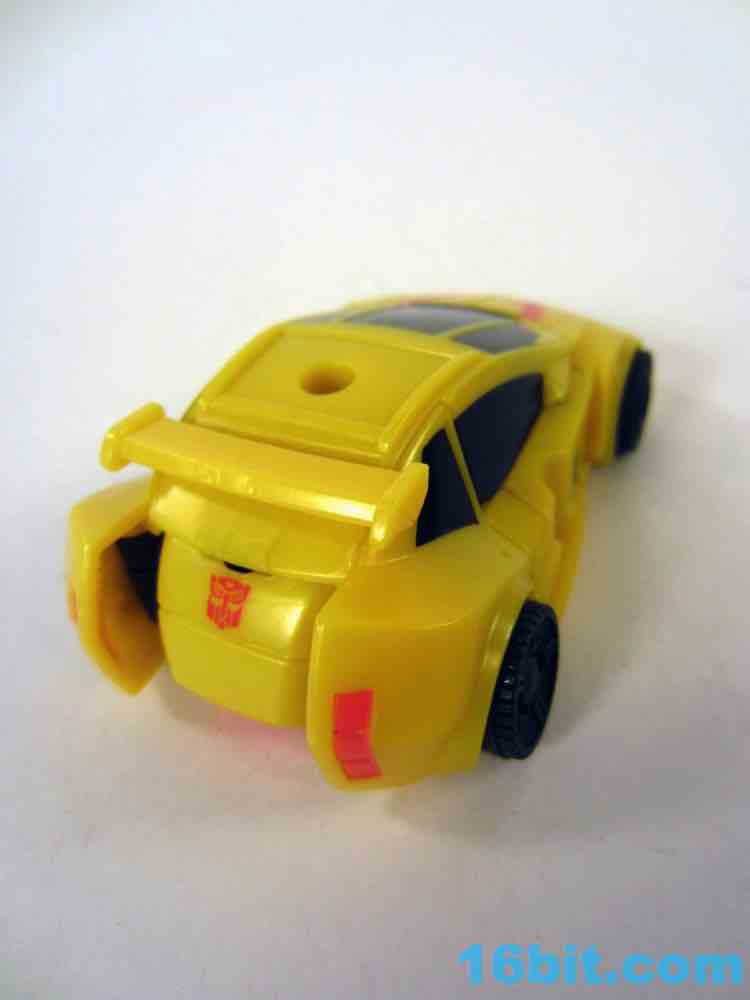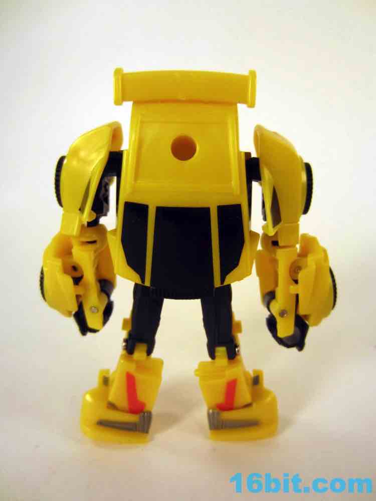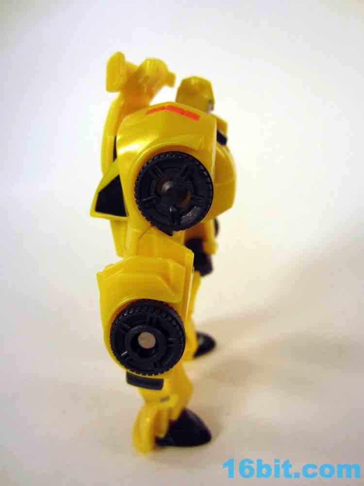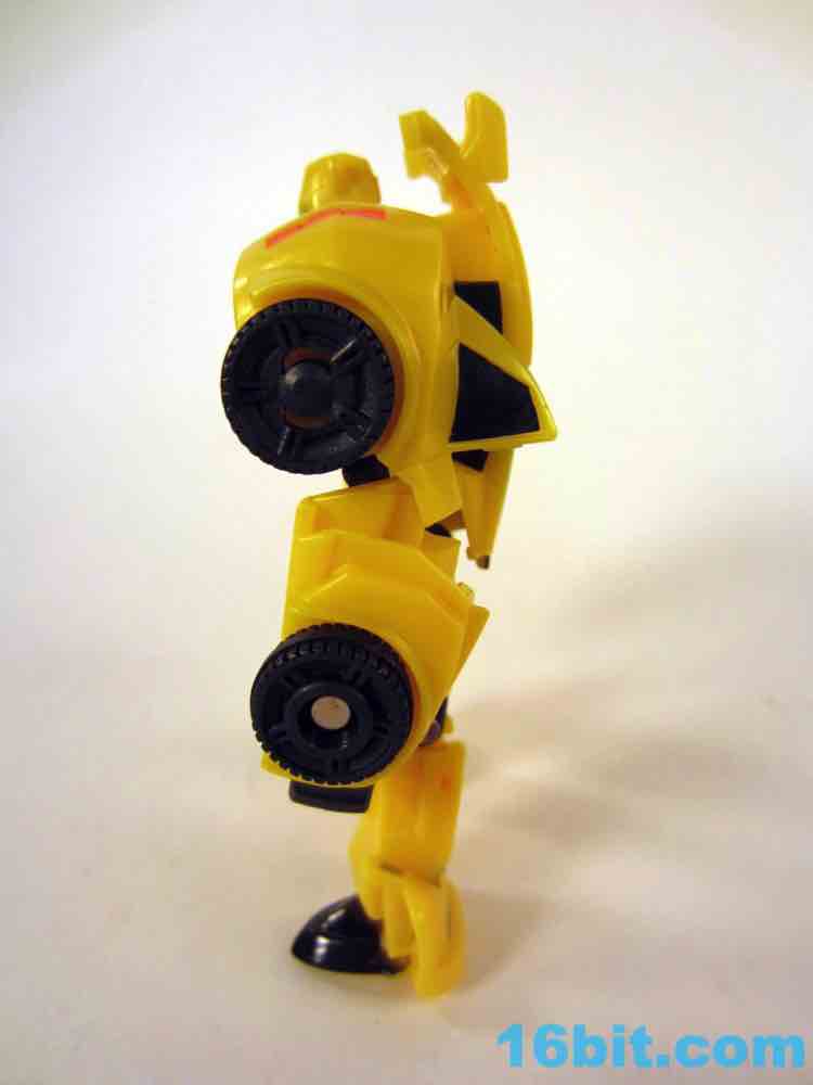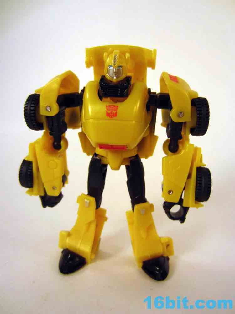This time around, Bumblebee has a pretty great transformation and works as a pastiche of numerous other toys. The chest is sort of rounded which recalls the original 1984 toy, the head looks more than a bit like the original cartoon's design, and the proportions are sort of similar to the recent IDW comics which took its cues form War for Cybertron, the video game. As its own thing, it ain't bad. The robot has one shortcoming: a small head that isn't jointed. Other than that, it's swell. Each limb is movable in two spots, so you've got shoulders, hips, knees, and elbows. Some may say it's under-articulated, but in 1984 I got me a regular original Bumblebee. That has moving arms. And that's about it.