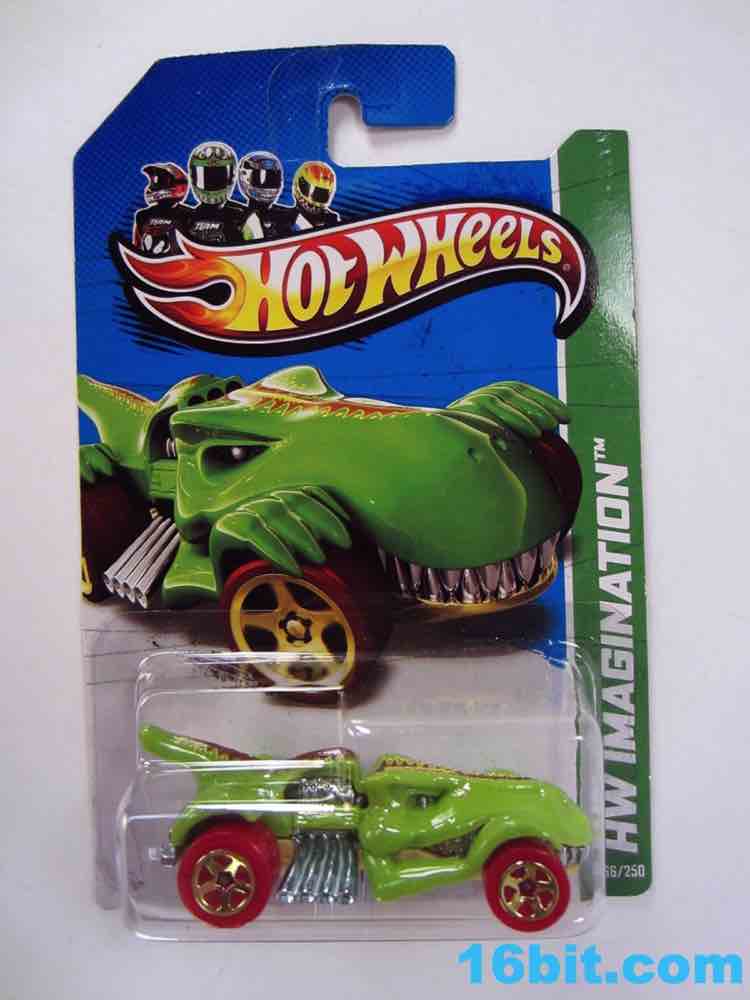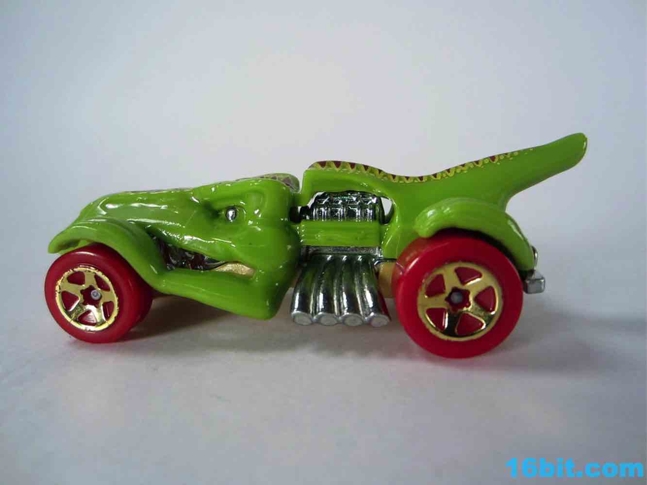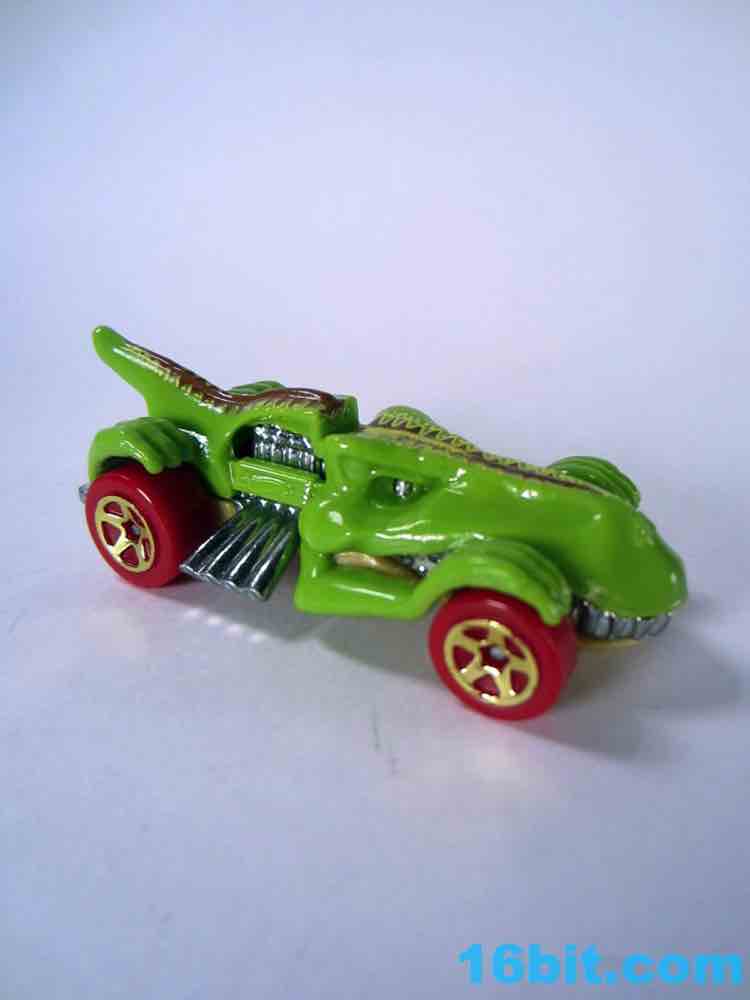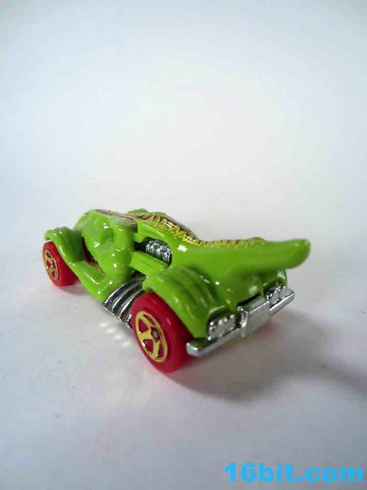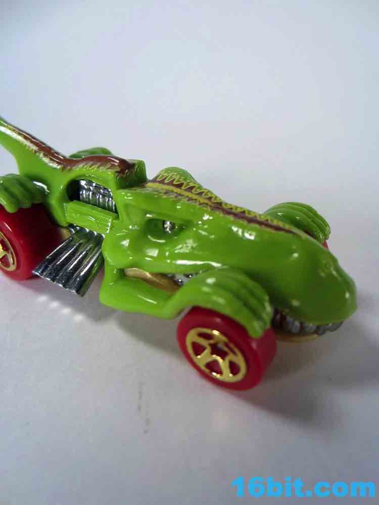 From like 1984 to 2012, my Hot Wheels purchases were pretty much squarely in the licensed character categories. In 2013 I started peeking at the other designs, proving that there's nothing too stupidly entertaining. The T-Rextroyer started life around 2010 as a color-shifter car, and starting in 2012 got plunked down into the ubiquitous $1 assortments in multiple colors. In 2013 alone, there are two flavors up for grabs - this green one, and a red one. I bought it in a binge purchase earlier in the summer, it's all sort of a haze.