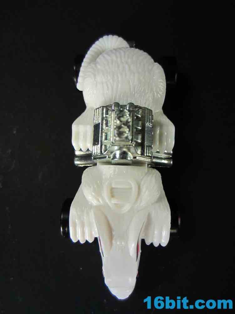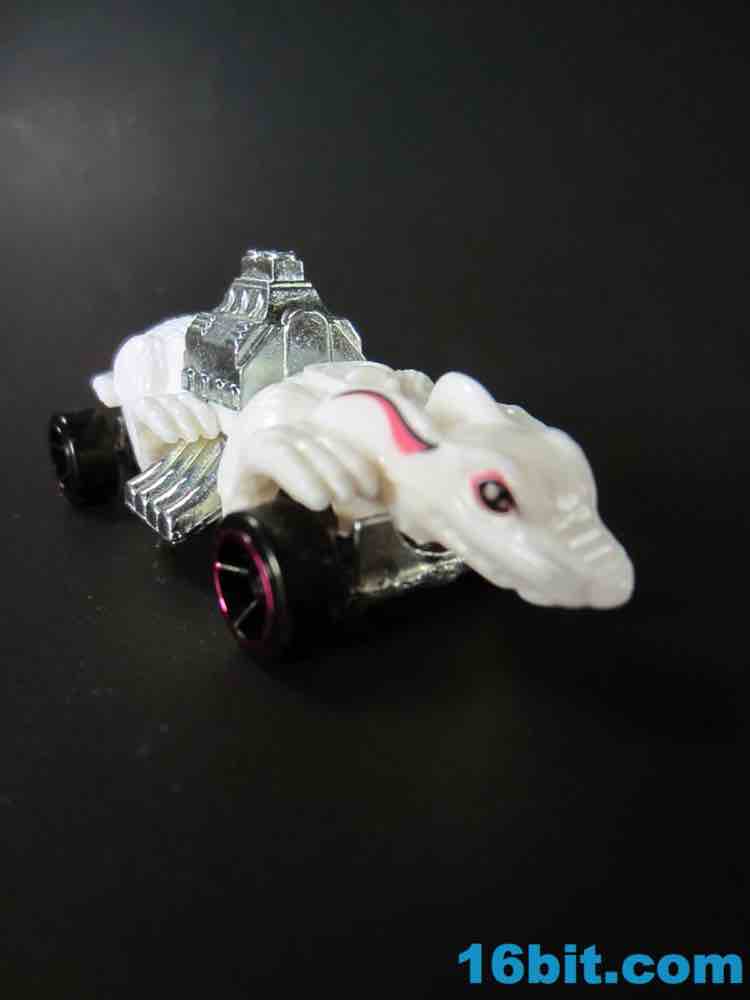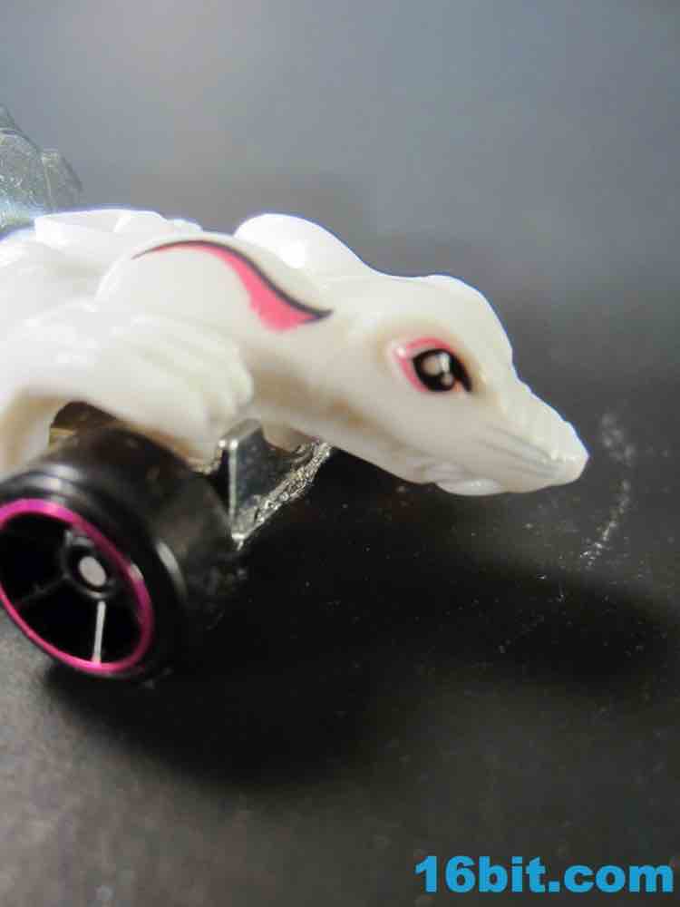 Like many of the fantastical creature cars, the rat has a metal undercarriage and wheels which tend to spin longer than most of his contemporaries on the pegs today. If you fire him out of a launcher, he tends to go far and smoothly - our sample didn't fly off the handle or veer off to the side. Most previous releases had silver or gold wheels, this one has metallic magenta on his rums. It looks pretty cool, and there's a driver's seat between the creature's head and the engine embedded in its spine. I'm not sure if this is supposed to be cool or cruel, but the fantastical beastly designs are appealing, fun, and no doubt infuriating to people who don't understand the need to have a toy rat with wheels to send flying across the house.