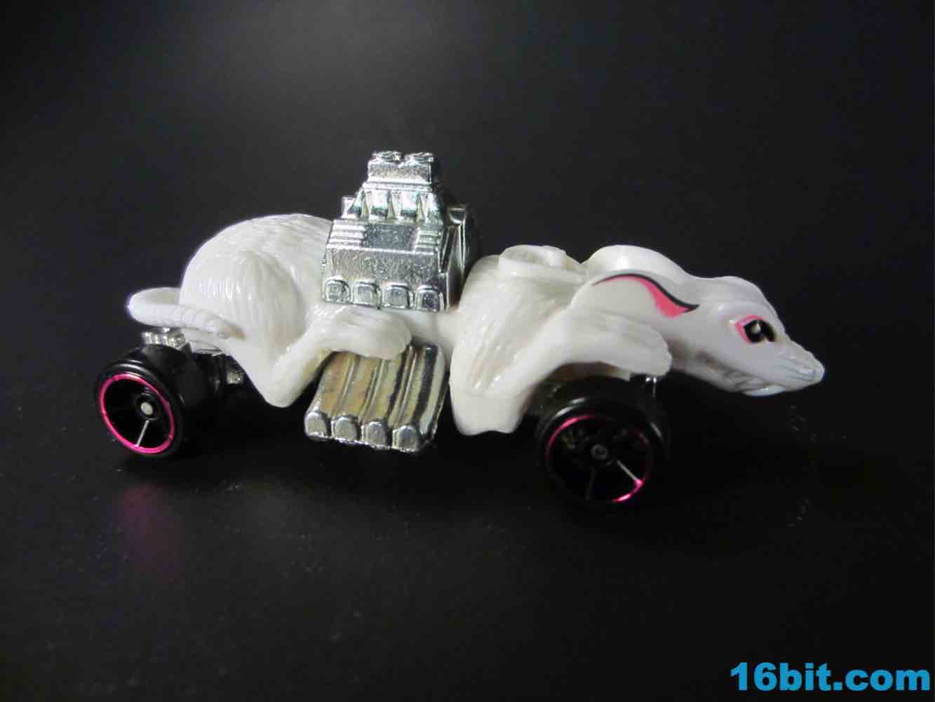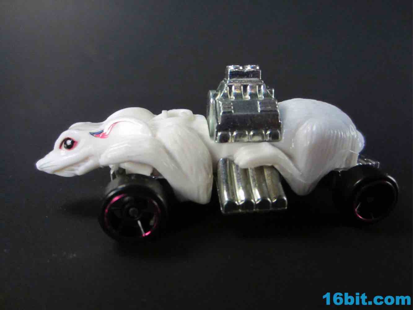 Since its debut in 1988, the Ratmobile has been available with different wheels and in a few different colors - a 2011 release could even change color. In 2013, two versions are shipping - early in the year it was dark grey, and later it started showing up in white yet again, this time with some pretty nice ear, mouth, eye, and whisker paint. The first samples I saw had rotten paint jobs, but this one was dang near perfect. I'm sure some day in the future Mattel will augment this mold to include a pink tail or a painted nose, but for now this is great - particularly for a buck.