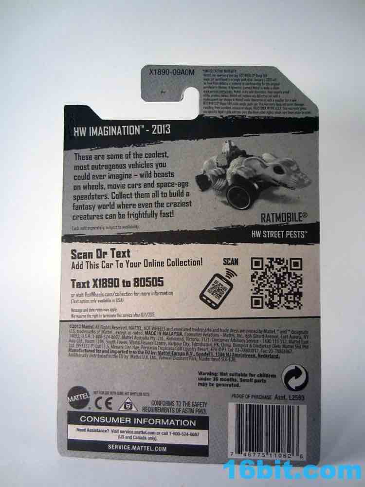 Mattel Hot Wheels Ratmobile (White) Die-Cast Metal VehicleWhen living in Los Angeles, I saw a lot of stores that seemed designed specifically to cater to people who can't read. Do you like Domino's Pizza? You're going to love Domingo's Pizza. Do you enjoy shopping for groceries at Von's? Give Jon's a try. The Ratmobile (White) is one of a few cars being sold in 2013 that have a name that looks a lot like "Batmobile" on the pegs, and "Bad Raditude" might be confusing as well - of course, it also looks like a Batmobile.