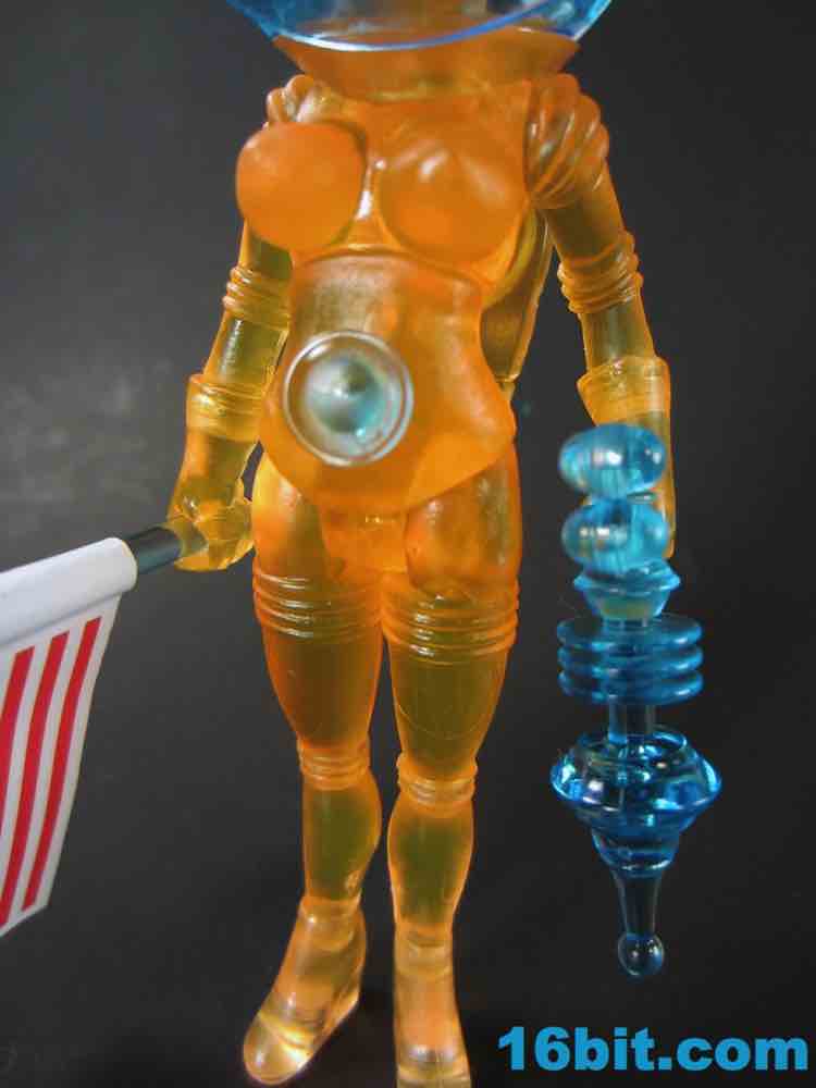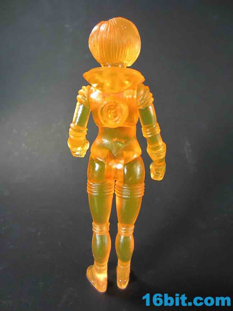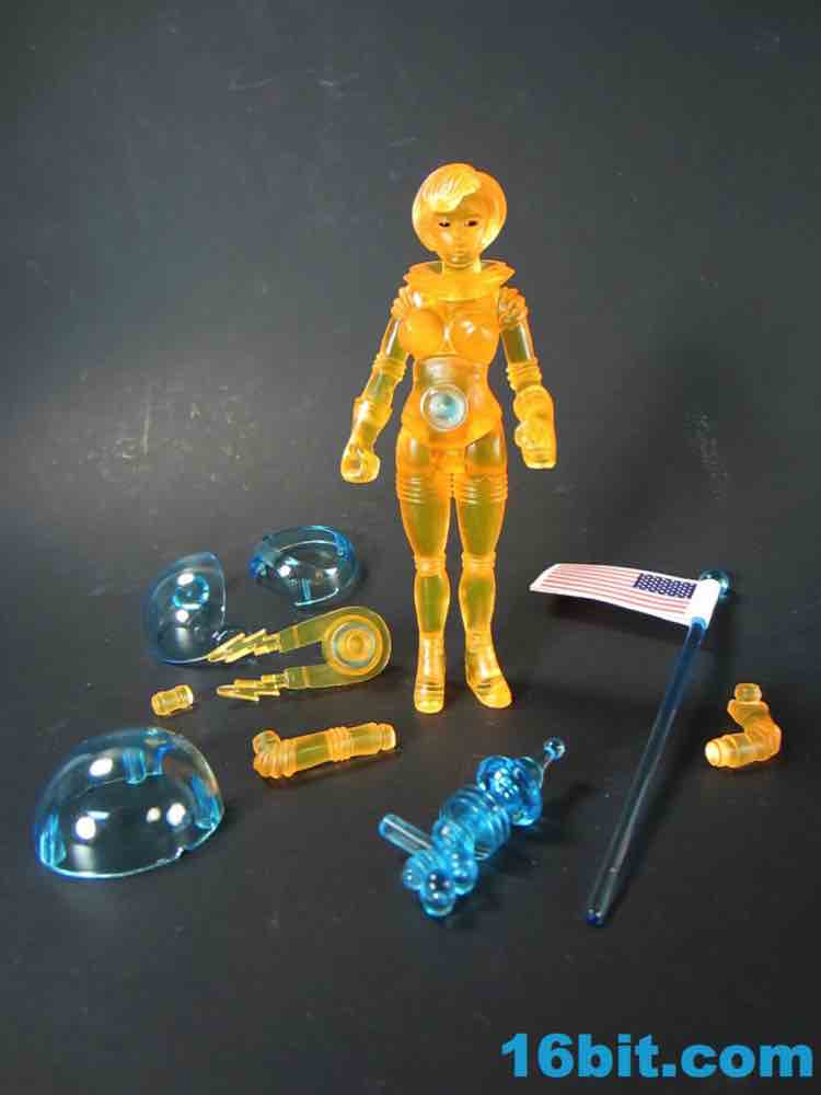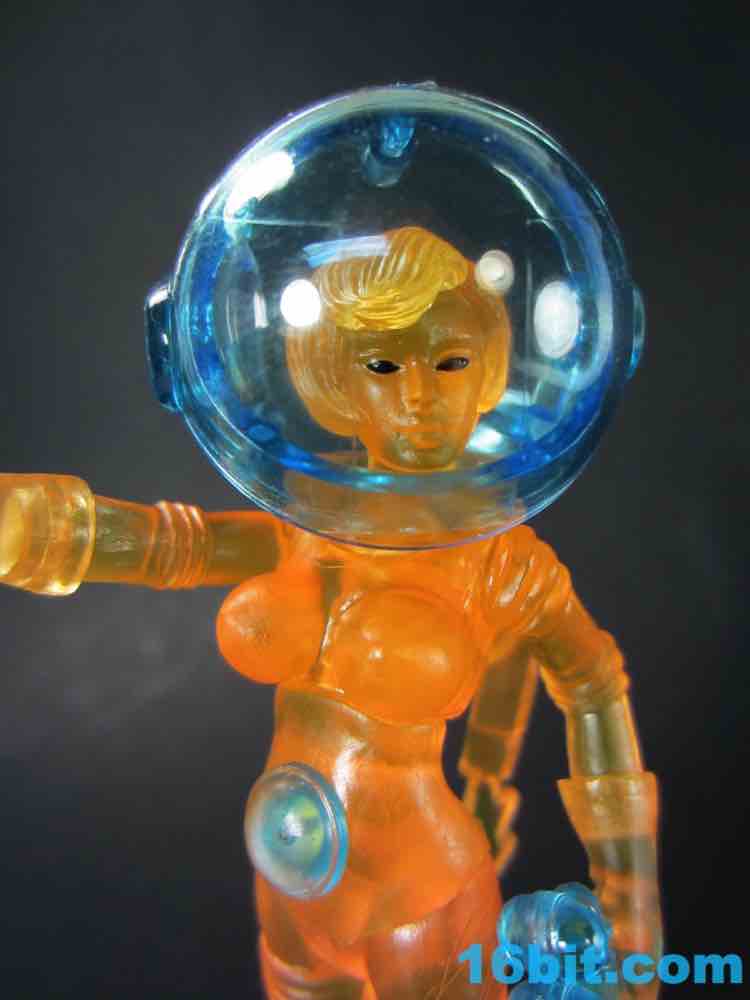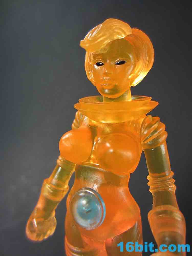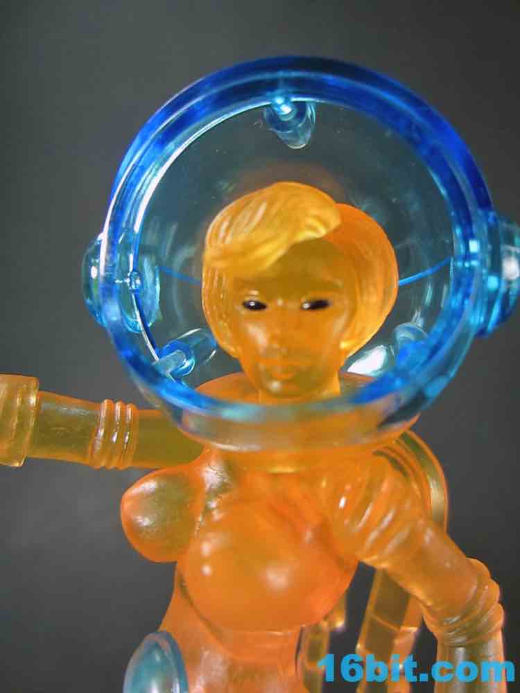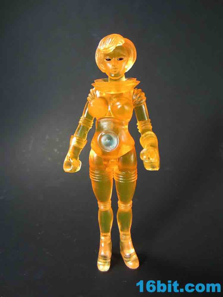 This figure is generally a completely new sculpt, with parts shared with other female figures in the line. The three-piece helmet is shared with Jack Asteroid, while the entire body and all her limbs do double duty with Ohprometam and Horroscope. (And presumably any other figures which may see release later.) The articulation is basically the same, with a higher waist joint and quite possibly the largest breasts I've ever seen on a 3 3/4-inch action figure. The figure is constructed from just over 20 pieces, including her accessories. The sculpt is, as always, great but the clear orange plastic makes her look significantly more alien. This works well on the other figures of this line, but the eyes on an unpainted orange face give her an unquestionably extra-terrestrial look, and perhaps adding flesh-colored paint to the face would have driven home the human/Earth connection better.