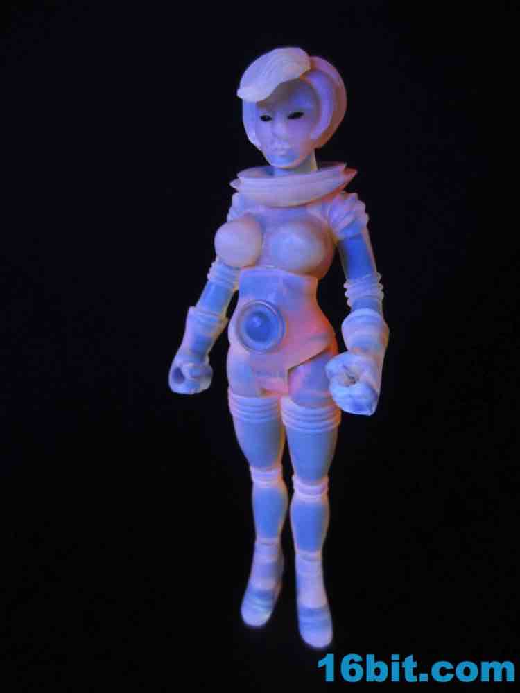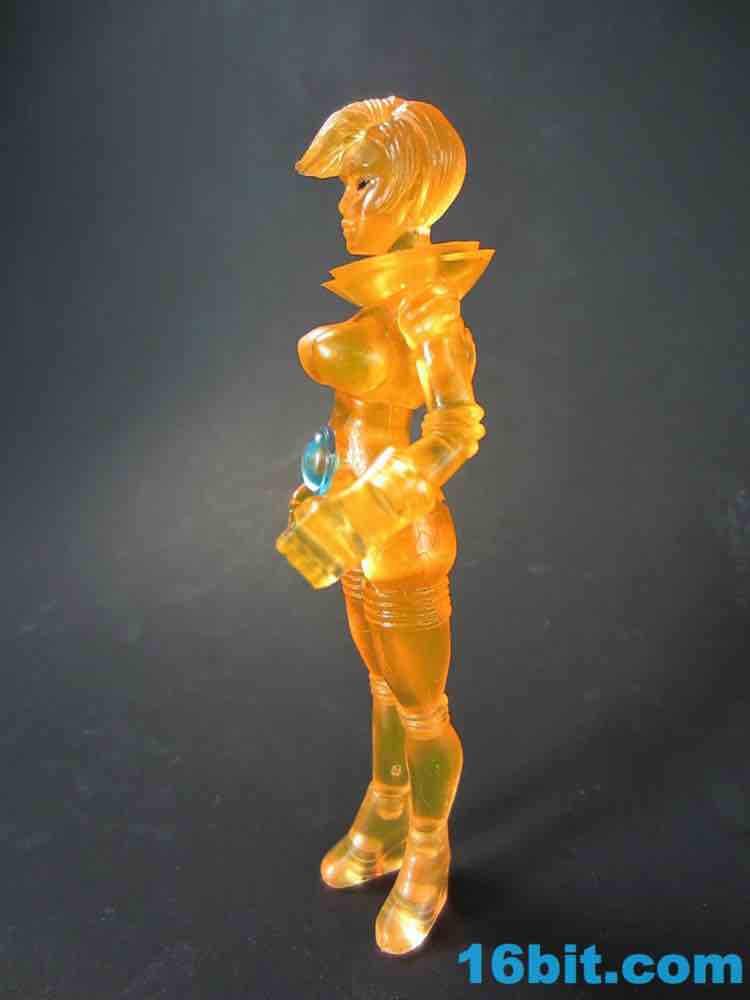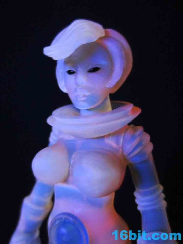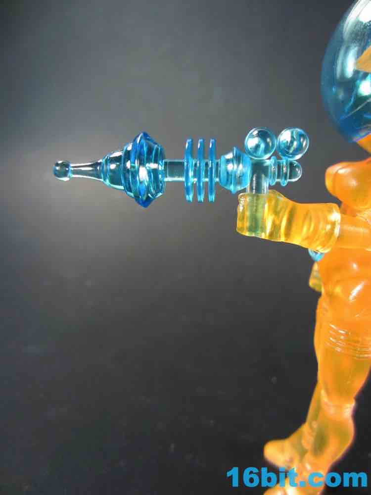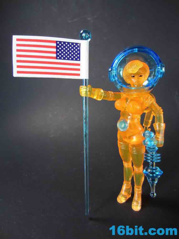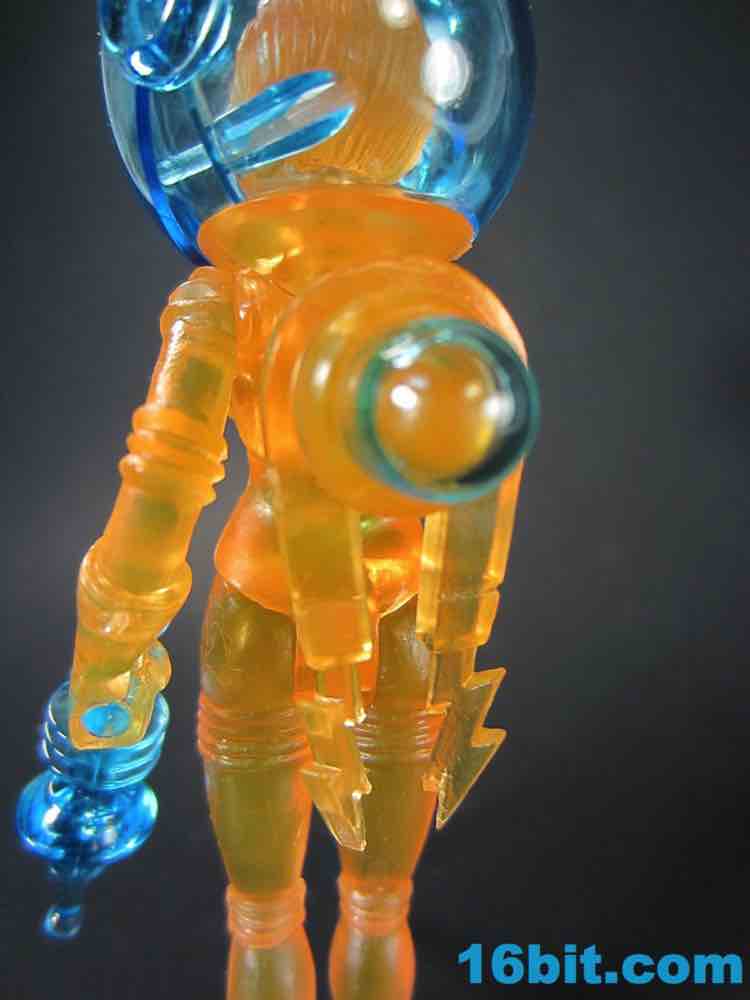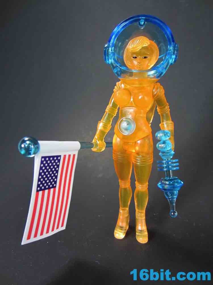 This figure is generally a completely new sculpt, with parts shared with other female figures in the line. The three-piece helmet is shared with Jack Asteroid, while the entire body and all her limbs do double duty with Ohprometam and Horroscope. (And presumably any other figures which may see release later.) The articulation is basically the same, with a higher waist joint and quite possibly the largest breasts I've ever seen on a 3 3/4-inch action figure. The figure is constructed from just over 20 pieces, including her accessories. The sculpt is, as always, great but the clear orange plastic makes her look significantly more alien. This works well on the other figures of this line, but the eyes on an unpainted orange face give her an unquestionably extra-terrestrial look, and perhaps adding flesh-colored paint to the face would have driven home the human/Earth connection better.