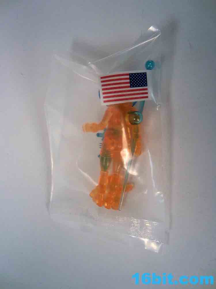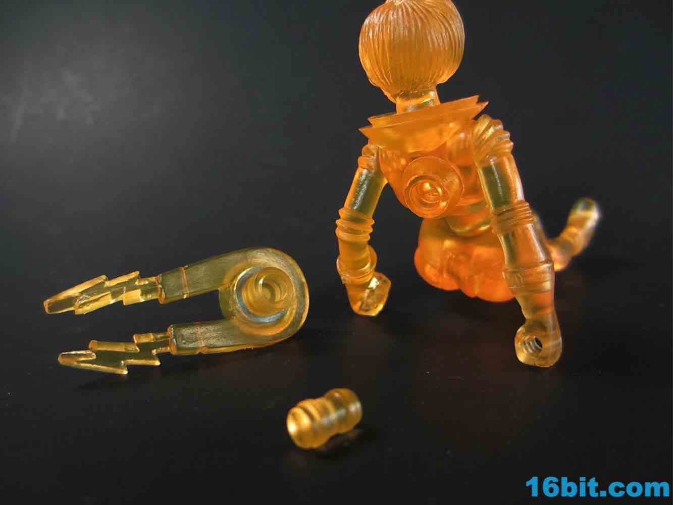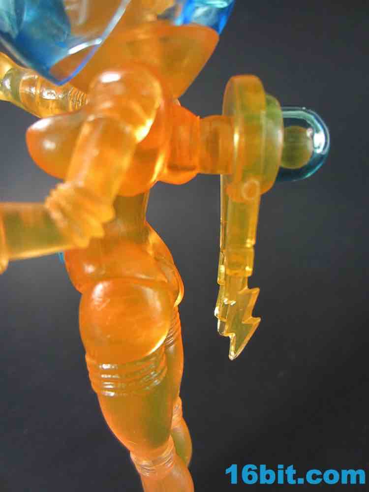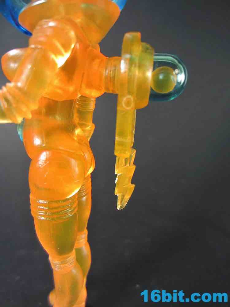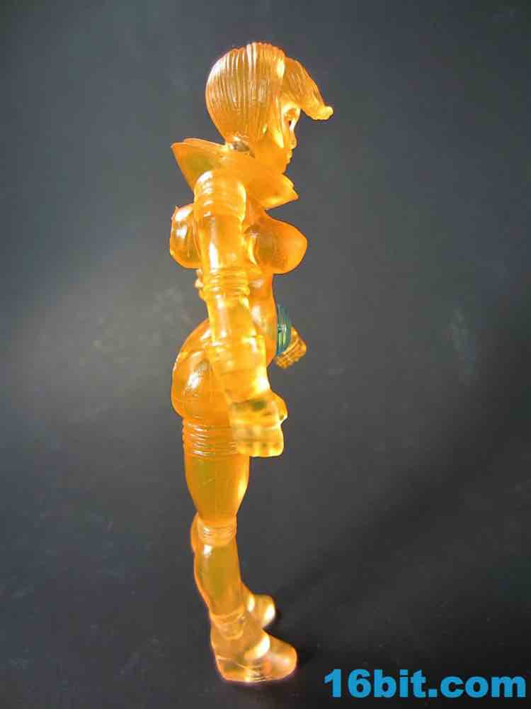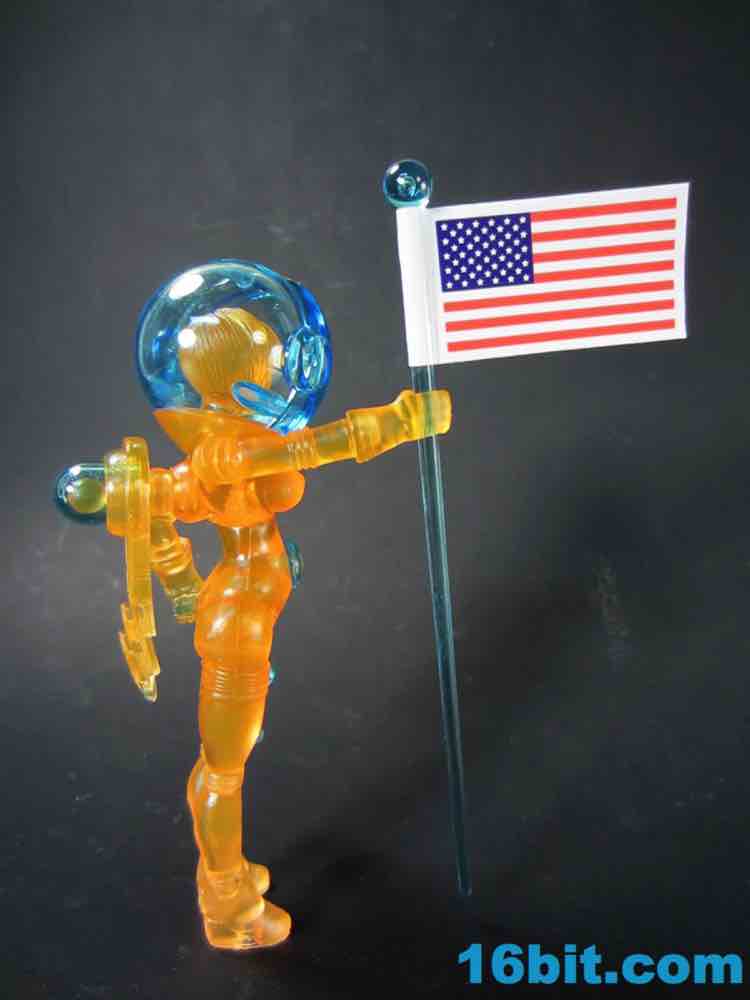 This figure is generally a completely new sculpt, with parts shared with other female figures in the line. The three-piece helmet is shared with Jack Asteroid, while the entire body and all her limbs do double duty with Ohprometam and Horroscope. (And presumably any other figures which may see release later.) The articulation is basically the same, with a higher waist joint and quite possibly the largest breasts I've ever seen on a 3 3/4-inch action figure. The figure is constructed from just over 20 pieces, including her accessories. The sculpt is, as always, great but the clear orange plastic makes her look significantly more alien. This works well on the other figures of this line, but the eyes on an unpainted orange face give her an unquestionably extra-terrestrial look, and perhaps adding flesh-colored paint to the face would have driven home the human/Earth connection better.