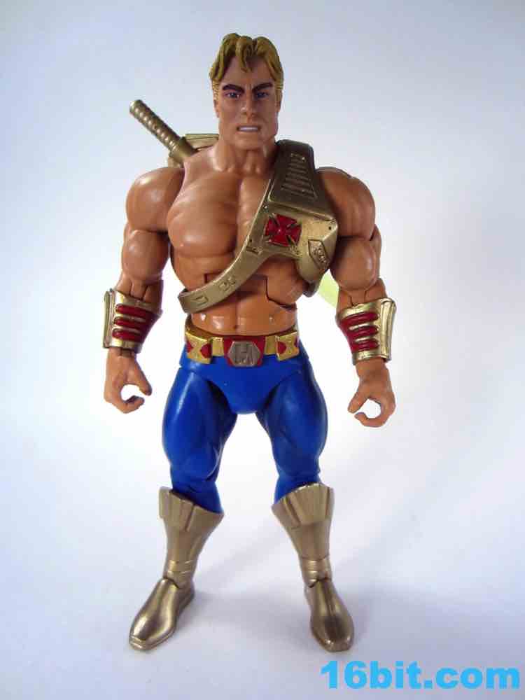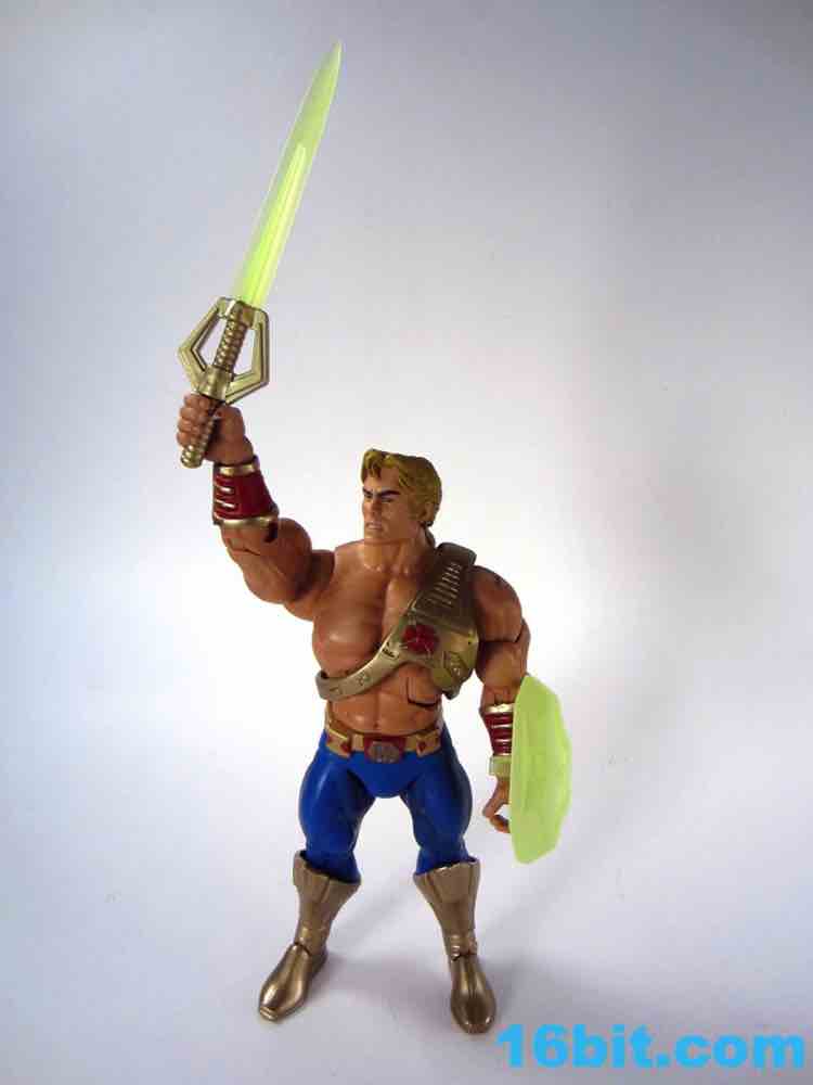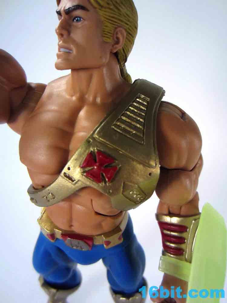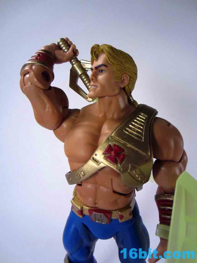 At about 7-inches tall, you mostly know what to expect. The figure is enhanced with bend-and-swivel wrists allowing him to point his sword and assume the "I Have the Power" pose that you want on your standard He-Man figures. On my sample all of the joints work great, and this upgraded He-Man is probably Mattel's best figure in terms of engineering and overall execution. The sculpt plays on the 1990 original by adding a classic red cross to his armor, adding some much-needed detail to the incredibly bland original design.