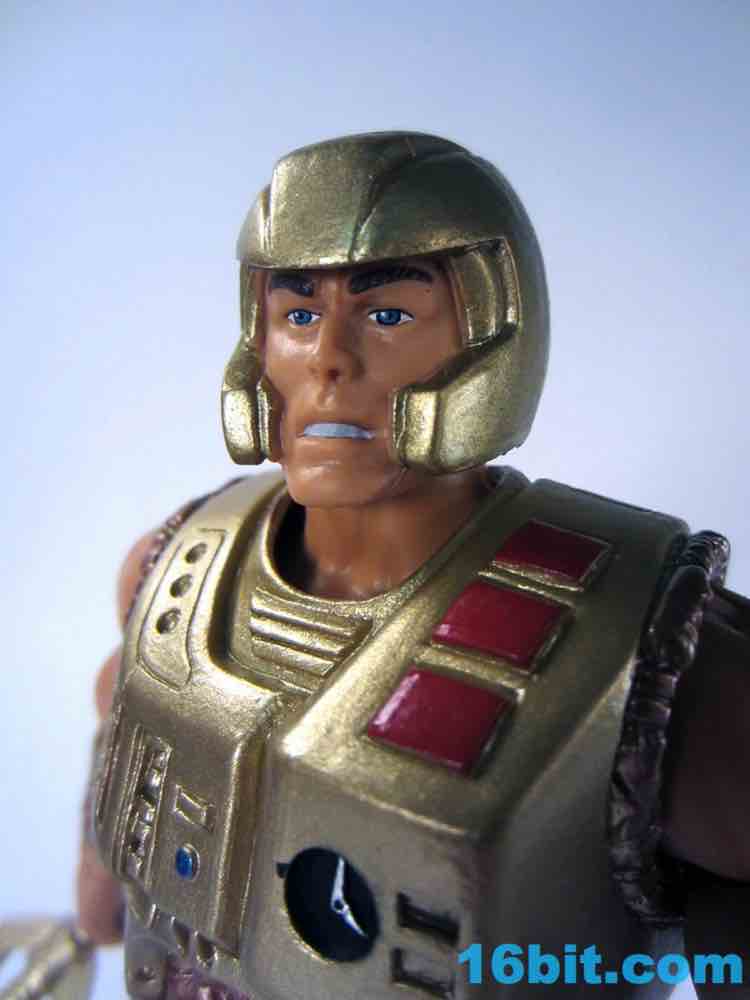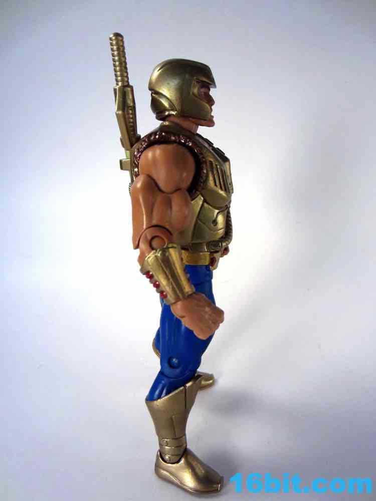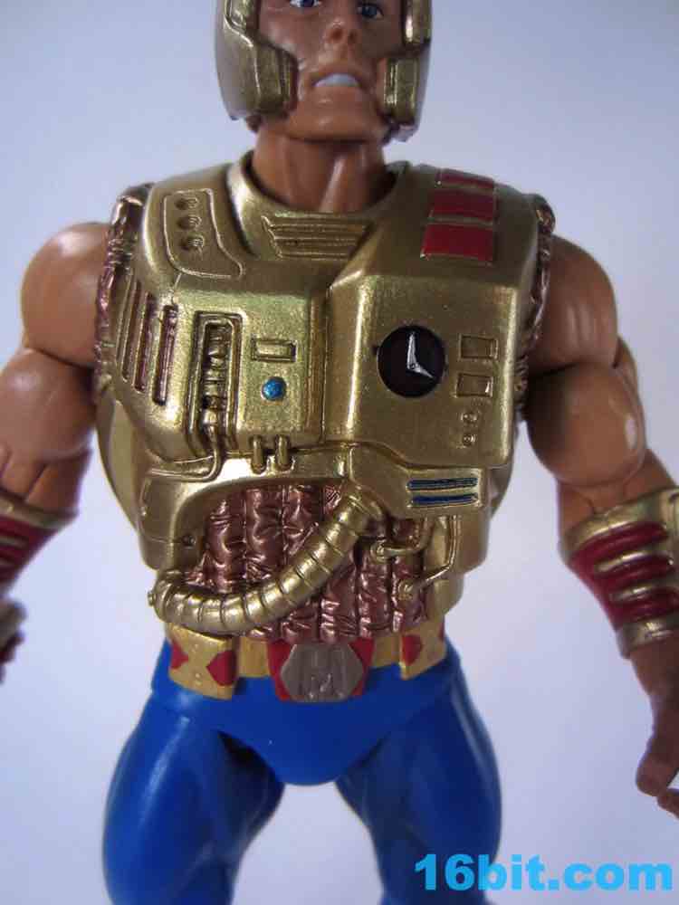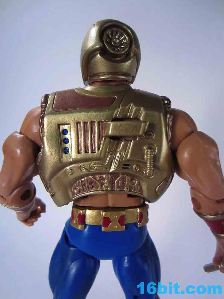 Accessory interaction is simple and easy - by default, he has a ponytail and the light harness, which fit his look just fine as a sci-fi fantasy character from 23 years ago. The sword fits in his hand, and the shield clamps on his wrist - it looks great and works with no struggles. The heads swap easily, and the bulkier armor fits well and tabs into place fairly easily. The alternate space armor is covered in hoses, dials, buttons, and other greeblies making it delightfully toylike and incredibly detailed, although it's likely none of the details serve any real purpose. It just looks cool. Also, He-Man's enhanced articulation allows him to easily reach backward and grab the sword from the holder on his back - I love it! Mattel really nailed this one.