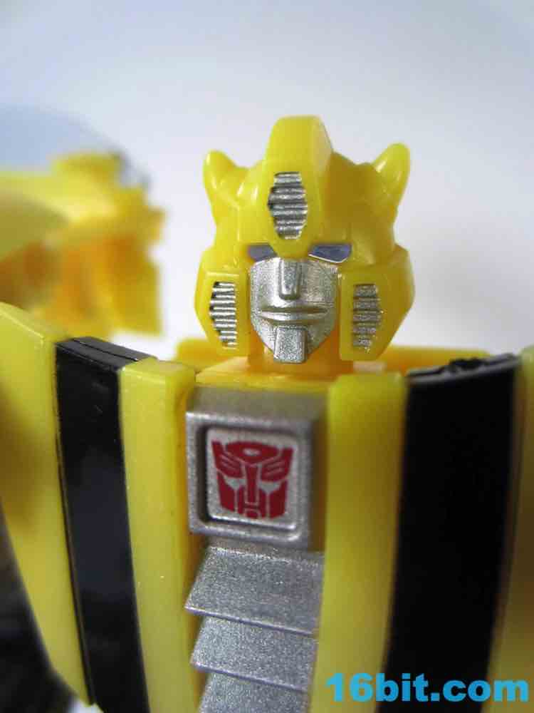 Bumblebee's head looks like a mix of the original cartoon design and some of IDW's recent aesthetics (read: Drift) - the vents on the side of the head combined with the painted silver crest give the toy a slightly more serious and less chubby look. These areas seem slightly more pronounced and a little darker when put against the bright yellow plastic, so while this toy reeks of Bumblebee I wouldn't be at all surprised to see the body repurposed with custom heads into other, new creations someday.