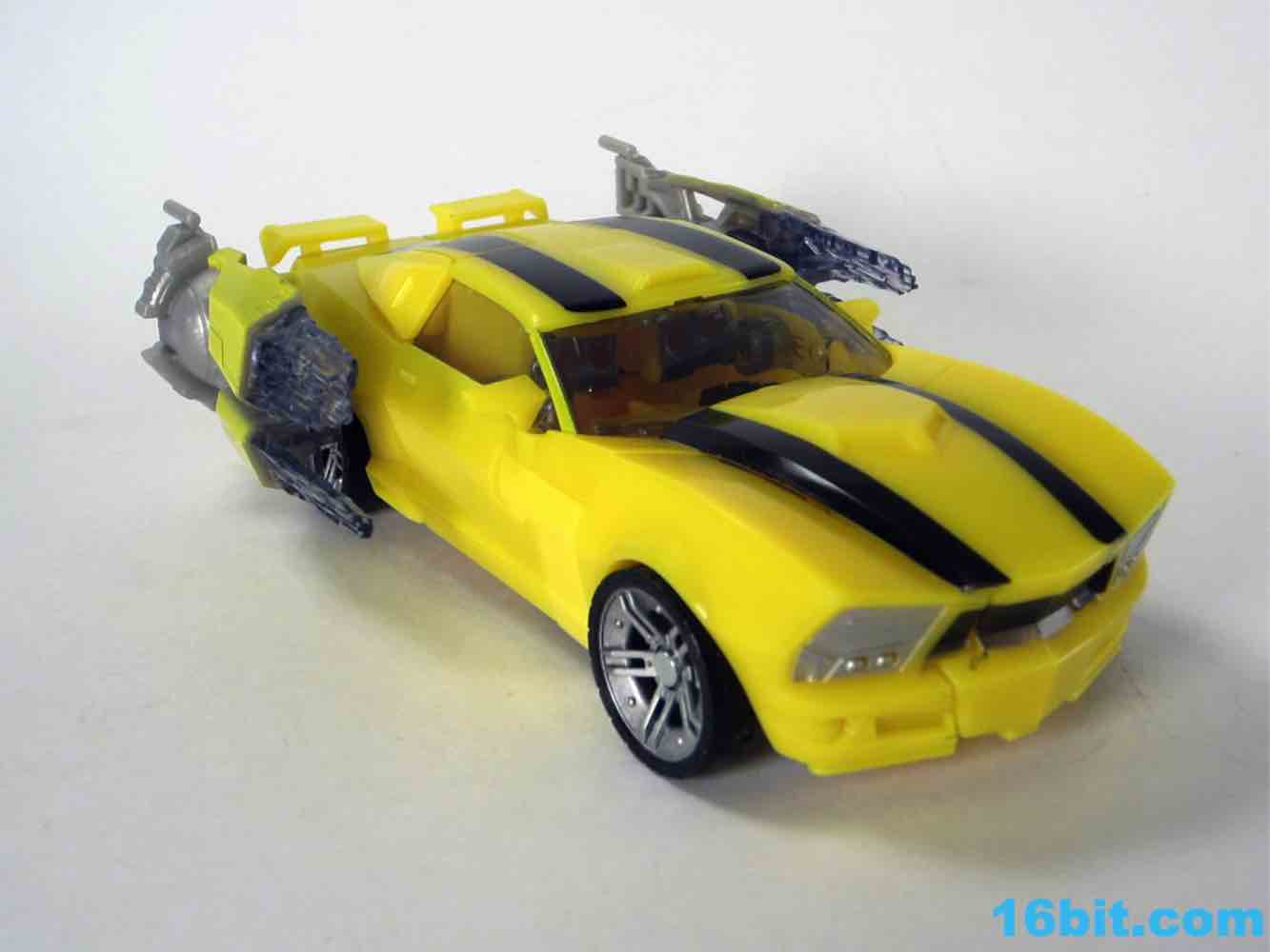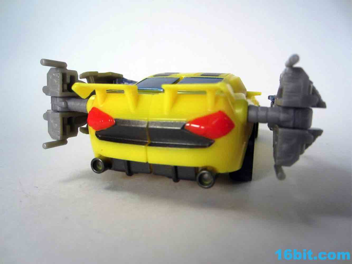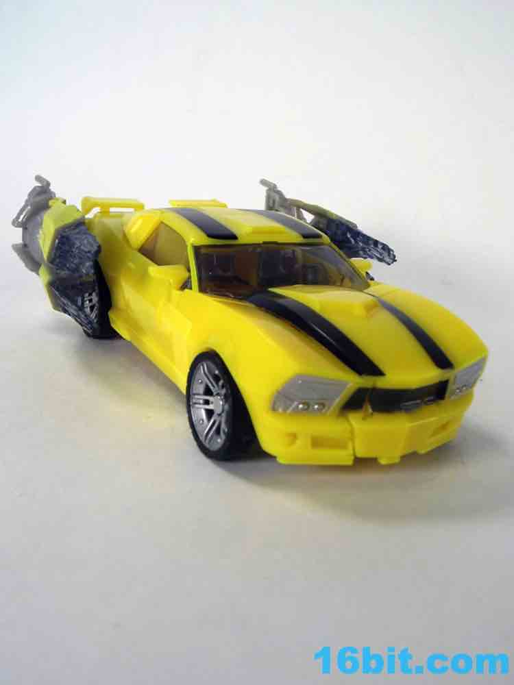 The 5-inch tall robot has about 16 meaningful points of articulation and has no problems standing or holding his weapons - it's a miracle! The character is intact, but the thinner look gives a much sleeker robot with a flatter face than you may be used to. A silver chest with a red Autobot symbol is flanked by two black stripes, which is basically par for the course since the movie in 2007. Fake tail lights on the figure's feet are a nice touch, recalling parts of the car mode that aren't actually there. The rear bumper hangs off the robot mode knees. It's a strange - but charming - design decision.