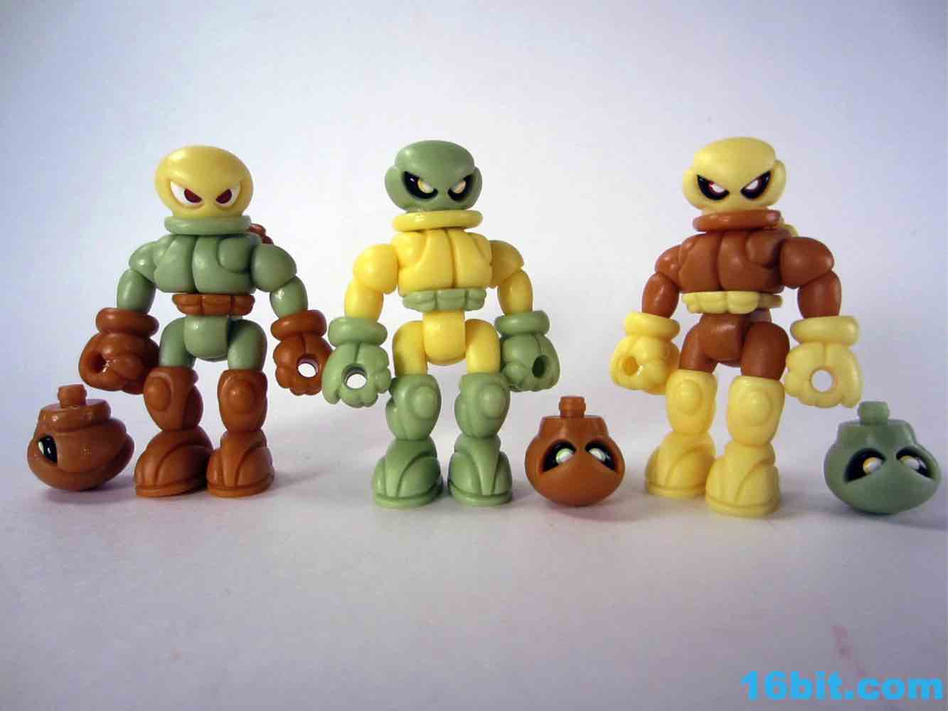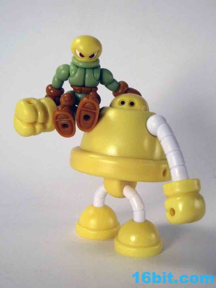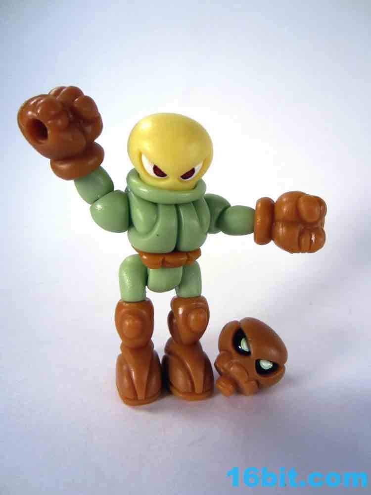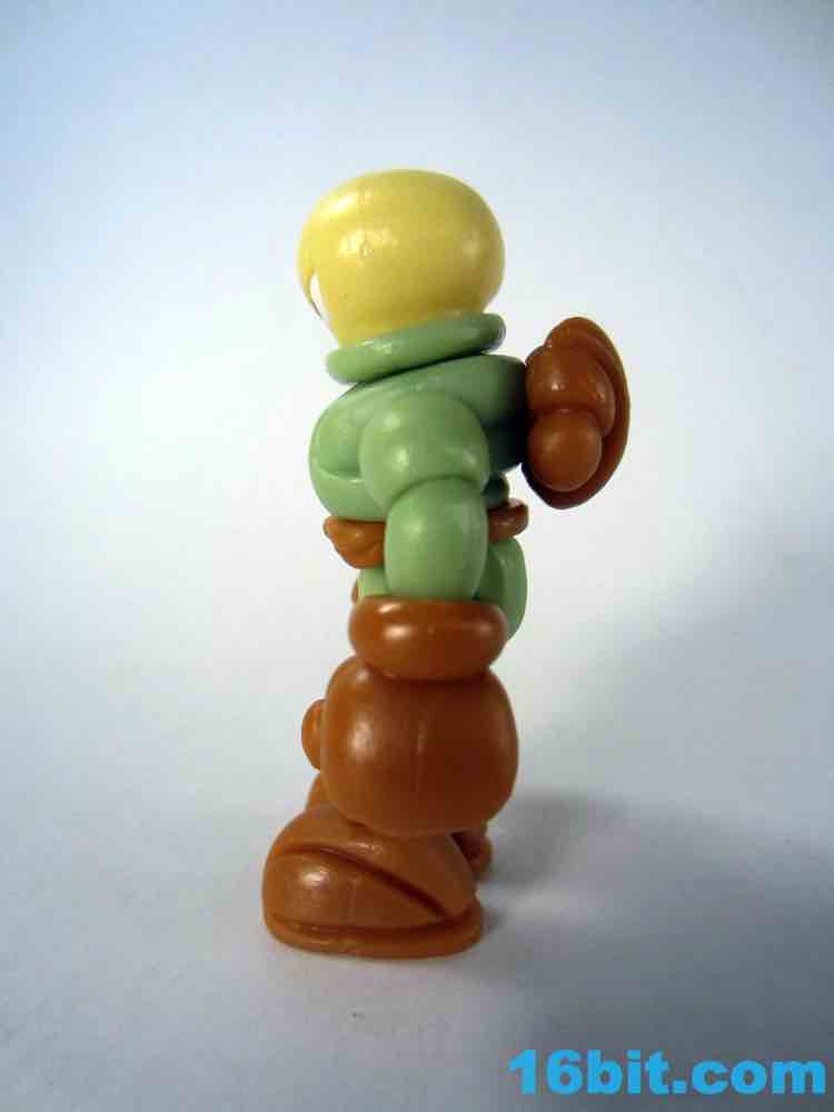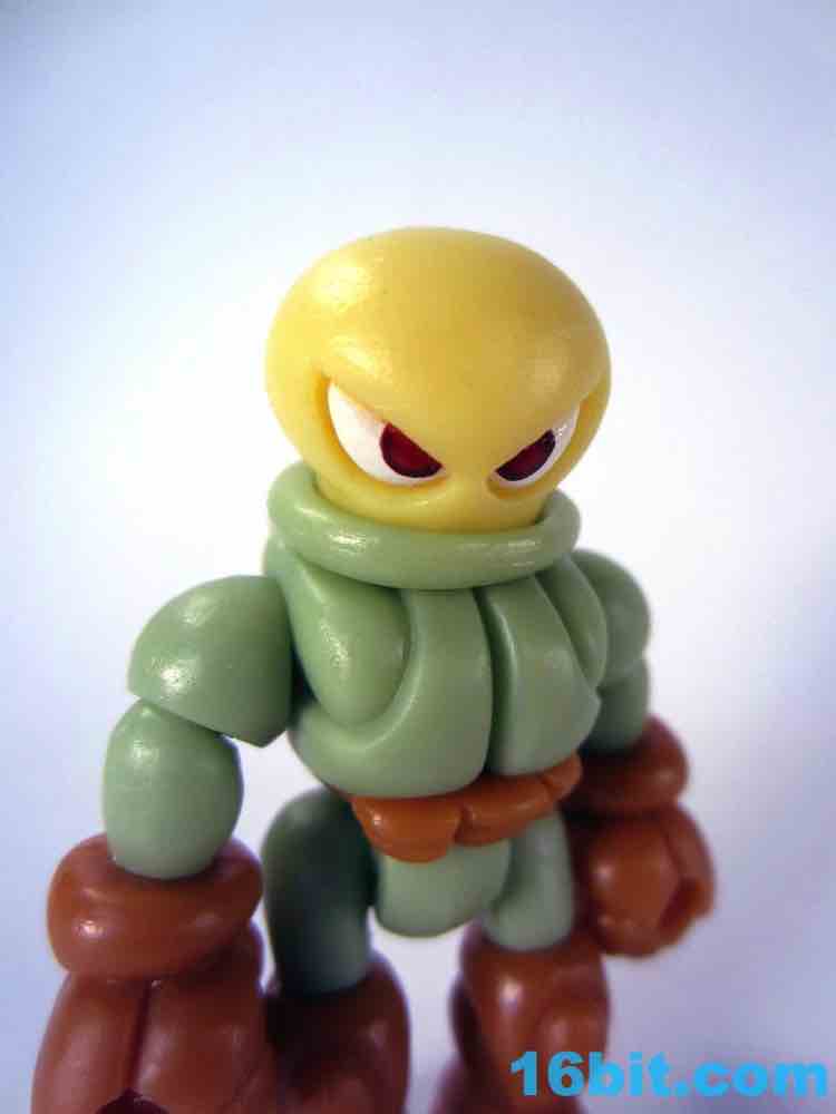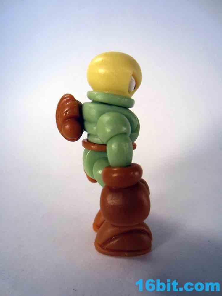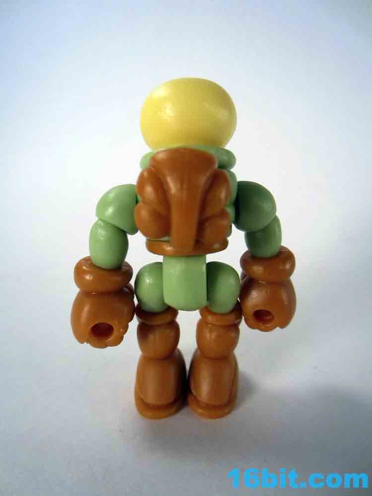 Behold, the MVR Standard Noboto! Like his series mate Gobon, it's the first "standard" Noboto and due to the three colors of plastic used, he was joined by two brothers made from the leftover pieces. The standard Noboto has a yellow head with white eyes (the only Noboto with more or less normal whites of his eyes), brown hands and feet, and a brown belt over a green body. It's certainly an unexpected color combination, but it works.