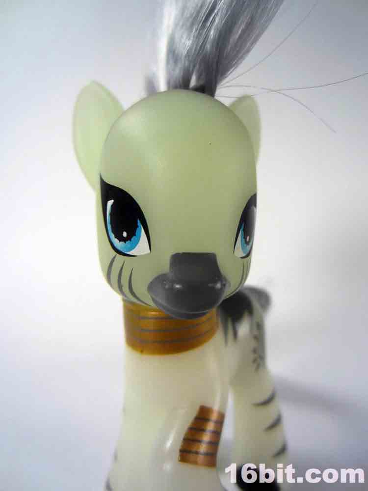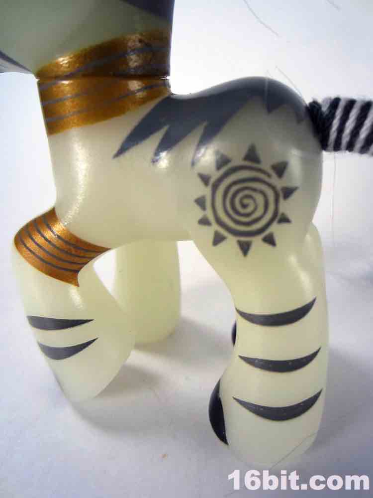 The figure is a basic, more or less plain pony body in glowing plastic with painted jewelry. A mini-figure version of the figure had fully-sculpted earrings and other elements, so this figure's most distinctive non-deco elements are the braided tail and striking, severe haircut. The deco is sharp, with grey stripes on her skin, and a tri-color eye that just turned out perfectly. Her "cutie mark" is a sun design that looks like it came out of The Lion King, although for all I know it's based on an actual African symbol and I'm just an idiot.