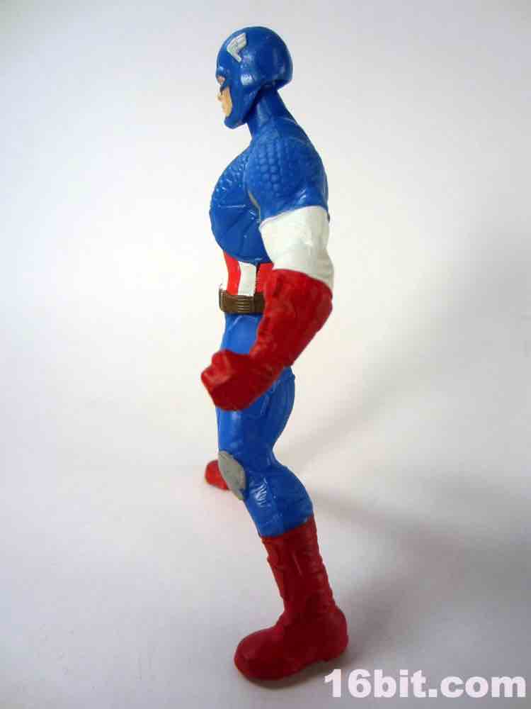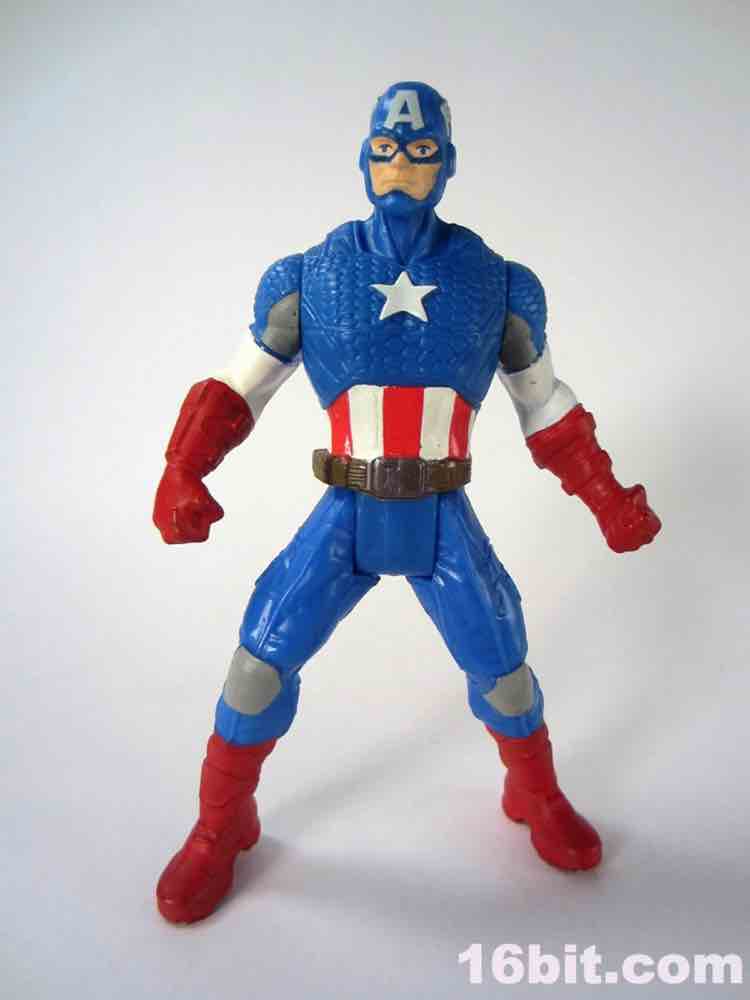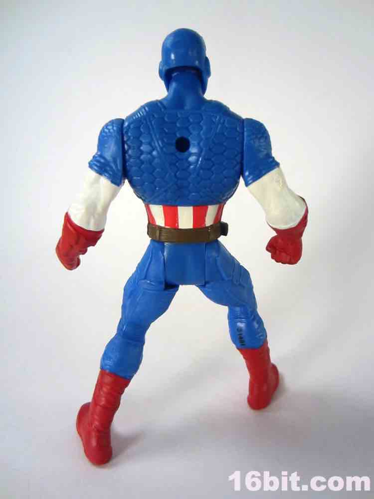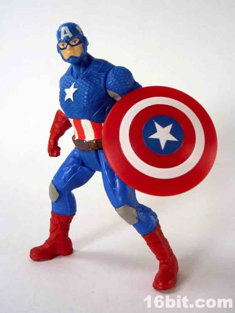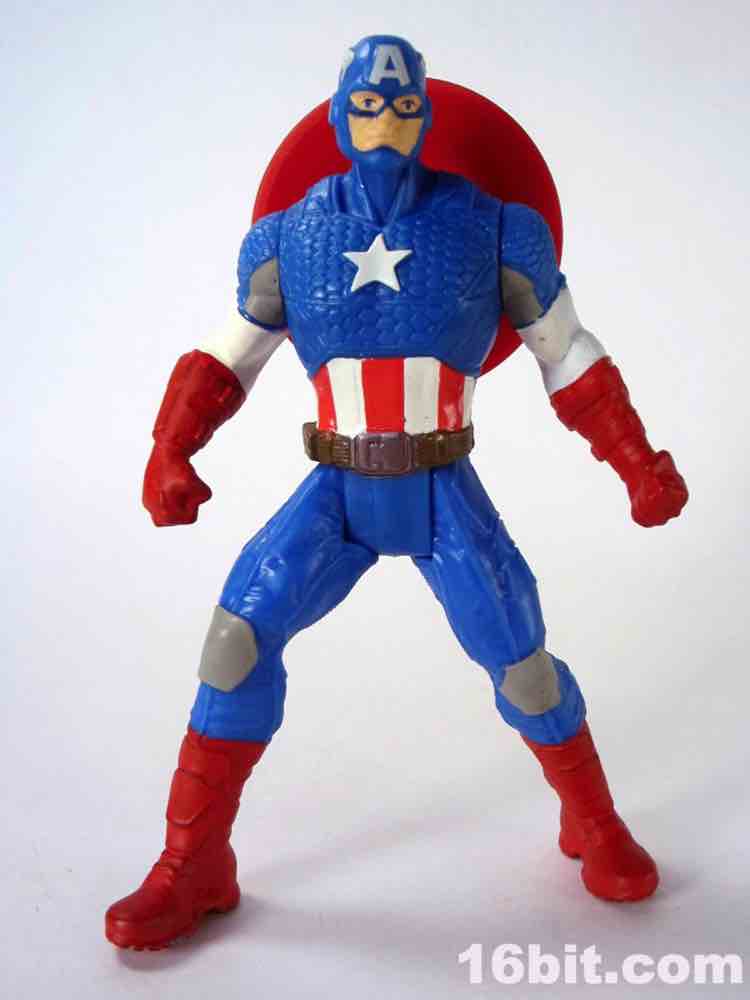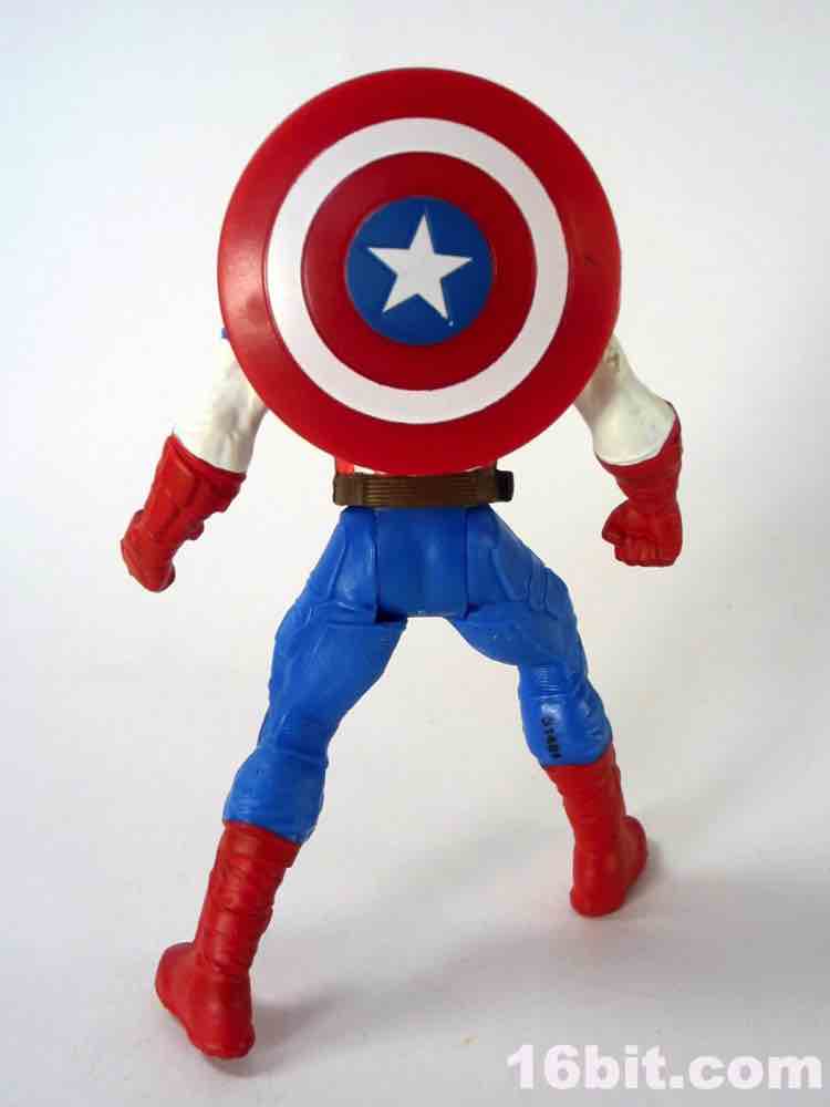 If you were a kid in 1985, this is not unlike your Secret Wars Mattel figures. The 3 3/4-inch hero has joints at the shoulders and hips, plus fists in an action pose for punching. I appreciate this, because it's fun and yes - I started punching my other figures with him. The head is a ball joint, so you can pose it pretty much any way you like. Cap's shield sports an articulated clip so it can be plugged into his back or snapped on his wrist, which is a nice option to have. My sample had no problems standing, which is pretty much the one thing I expect out of Hasbro's new 5-jointed figure initiative. If it can't stand, it's crap. It can stand, and it's Cap - so that's a good reason to shell out.