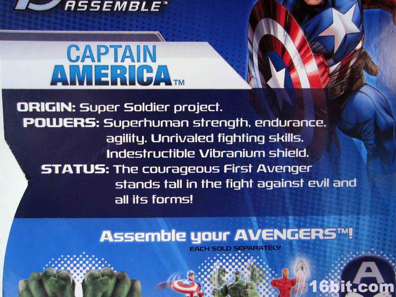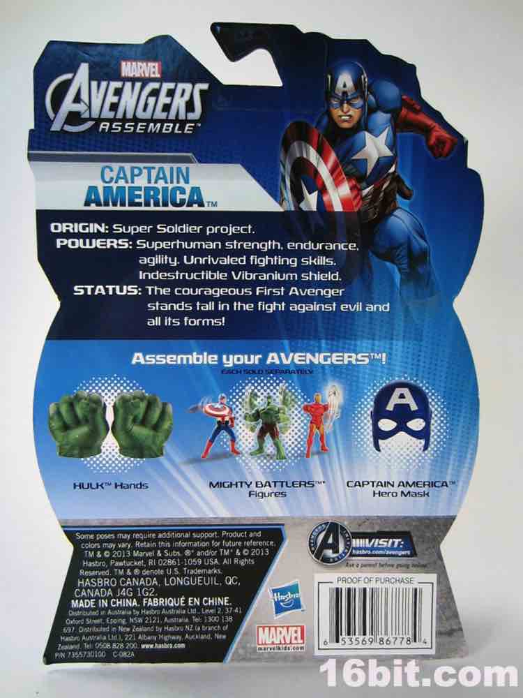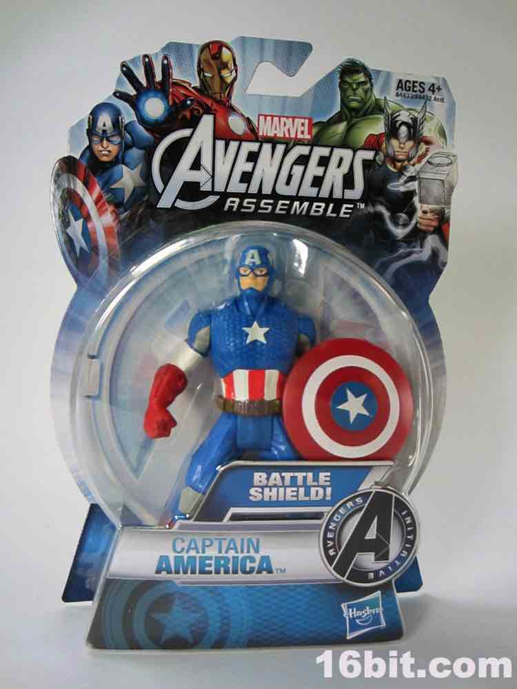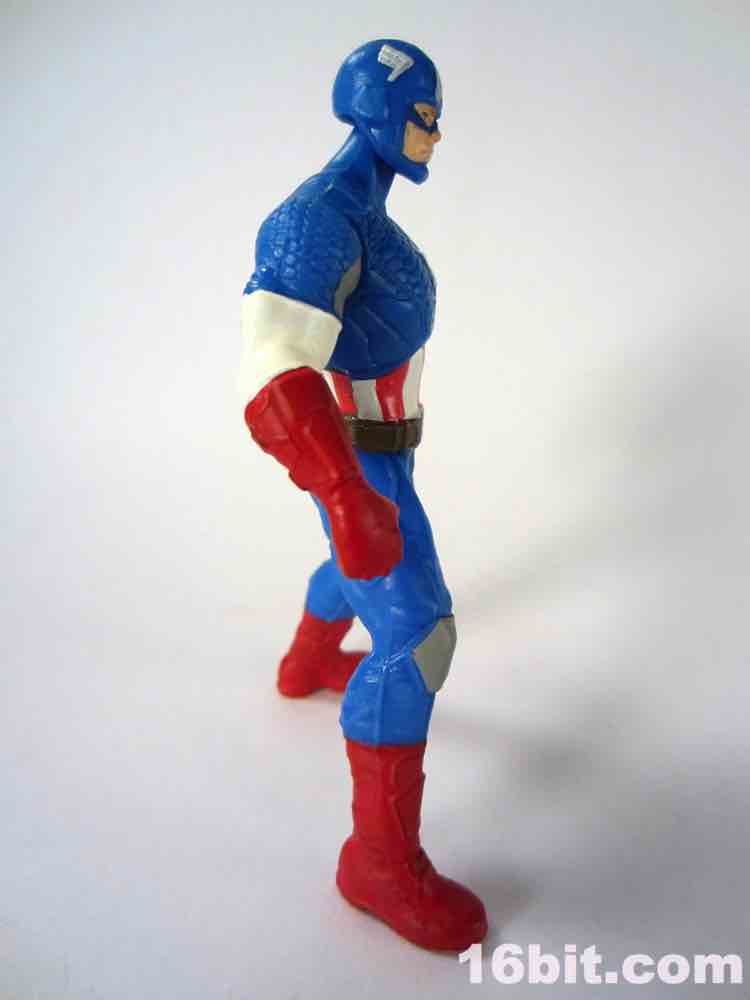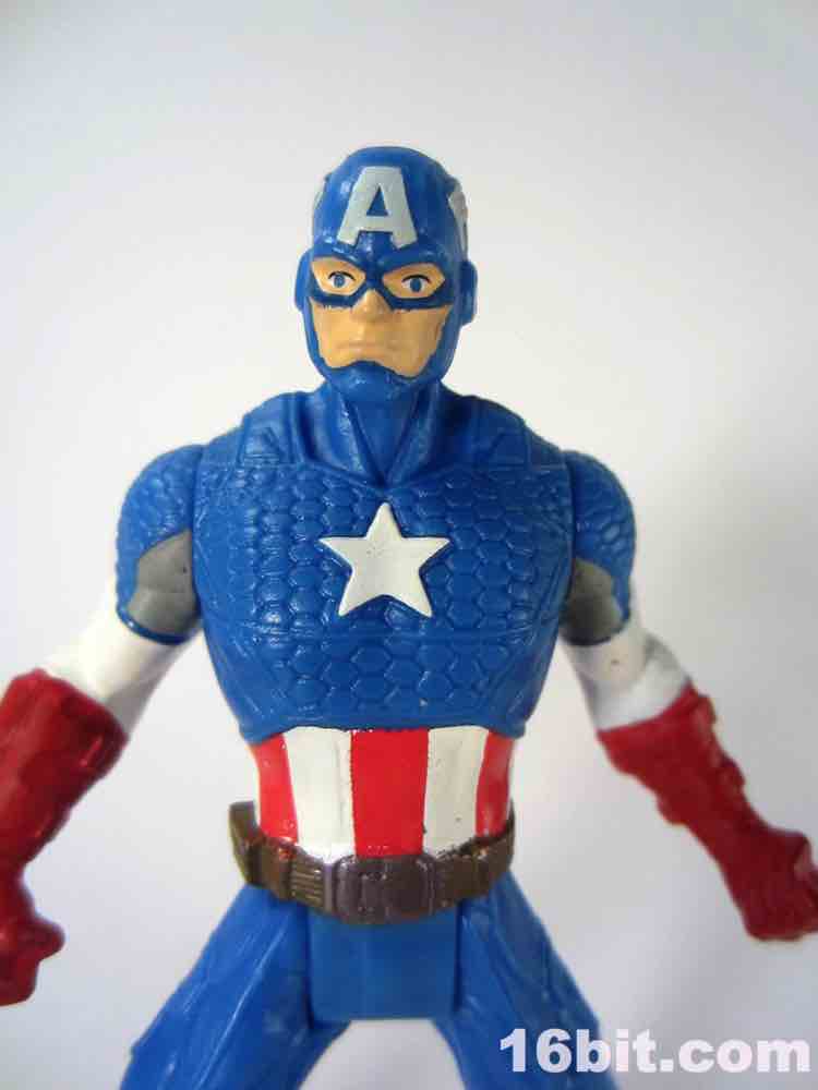 If you were a kid in 1985, this is not unlike your Secret Wars Mattel figures. The 3 3/4-inch hero has joints at the shoulders and hips, plus fists in an action pose for punching. I appreciate this, because it's fun and yes - I started punching my other figures with him. The head is a ball joint, so you can pose it pretty much any way you like. Cap's shield sports an articulated clip so it can be plugged into his back or snapped on his wrist, which is a nice option to have. My sample had no problems standing, which is pretty much the one thing I expect out of Hasbro's new 5-jointed figure initiative. If it can't stand, it's crap. It can stand, and it's Cap - so that's a good reason to shell out.