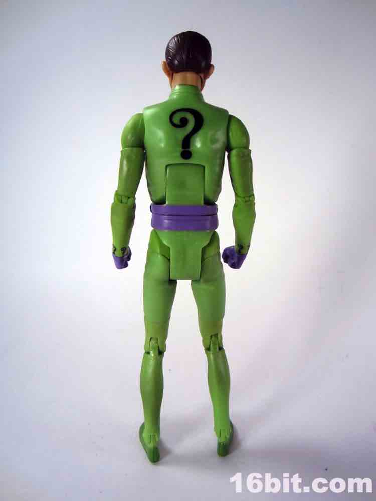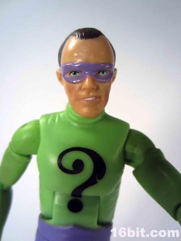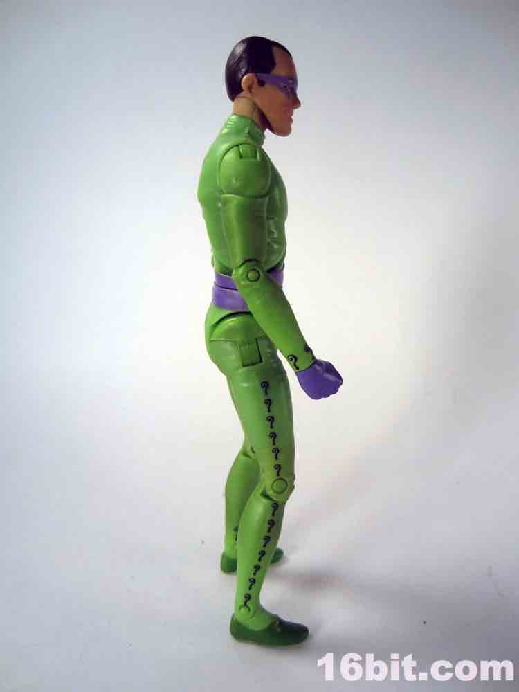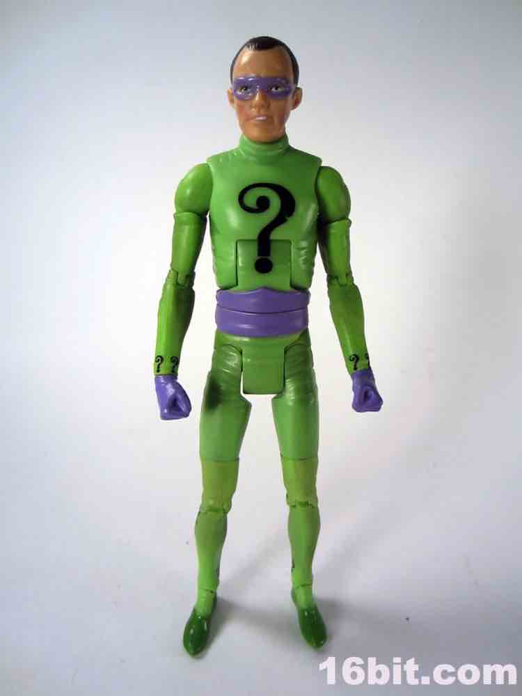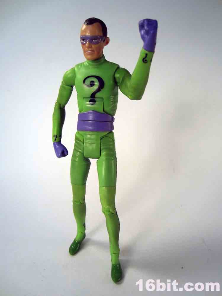 Mattel Batman Classic TV Series The Riddler Action FigureWith 21 points of articulation, this is a good figure. It's an amazing recreation of a crappy costume from a TV show that's nearly 50 years old, which seems strange - with extra green shadows, it almost feels as if more work went into this figure than Gorshin's original outfit on the show. The sculpt is basically just a bodysuit which could be adapted to dang near anything, with green slippers, purple gloves, and not a lot else. It bunches up a little around the crotch, and there are question marks tastefully dispersed on his chest, back, the sides of his pants, wrists, and on his inner shins. And yet, it's not remotely overpowering.