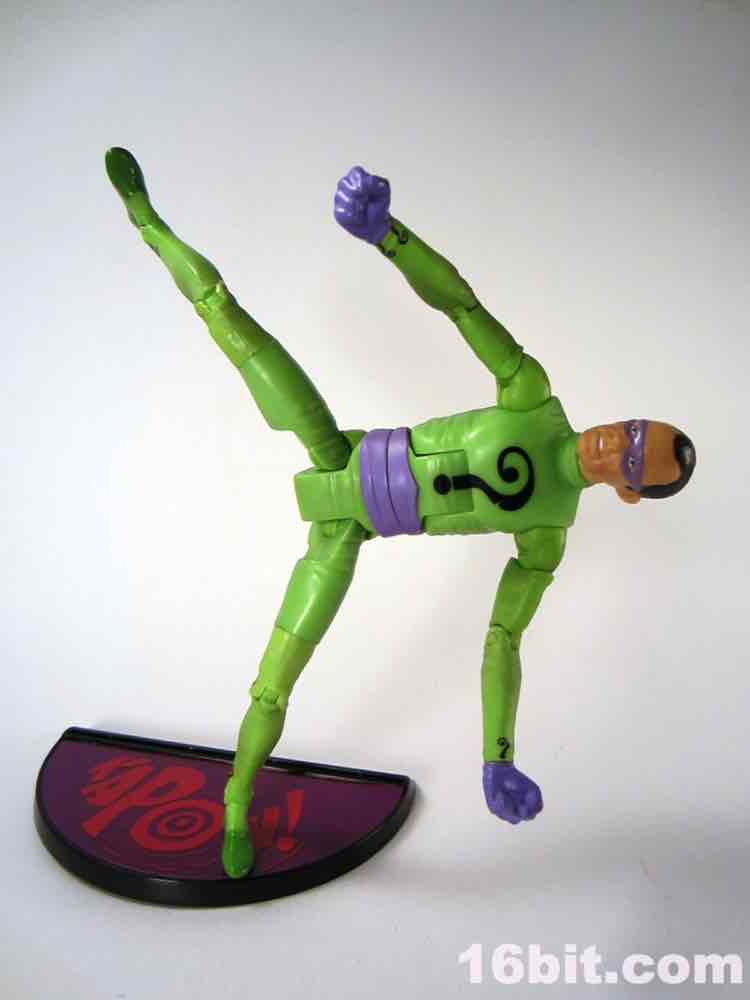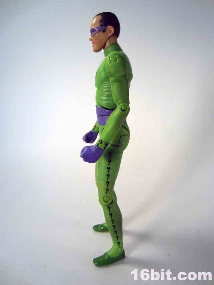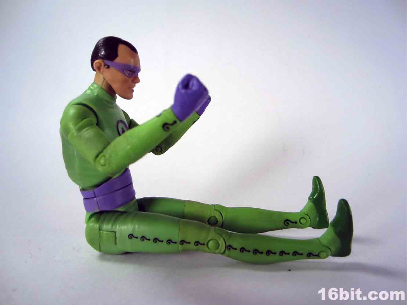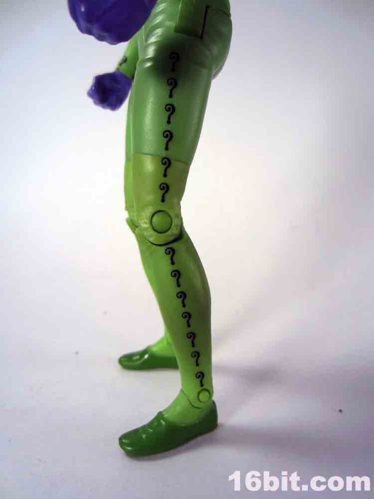 Mattel Batman Classic TV Series The Riddler Action FigureWith 21 points of articulation, this is a good figure. It's an amazing recreation of a crappy costume from a TV show that's nearly 50 years old, which seems strange - with extra green shadows, it almost feels as if more work went into this figure than Gorshin's original outfit on the show. The sculpt is basically just a bodysuit which could be adapted to dang near anything, with green slippers, purple gloves, and not a lot else. It bunches up a little around the crotch, and there are question marks tastefully dispersed on his chest, back, the sides of his pants, wrists, and on his inner shins. And yet, it's not remotely overpowering.