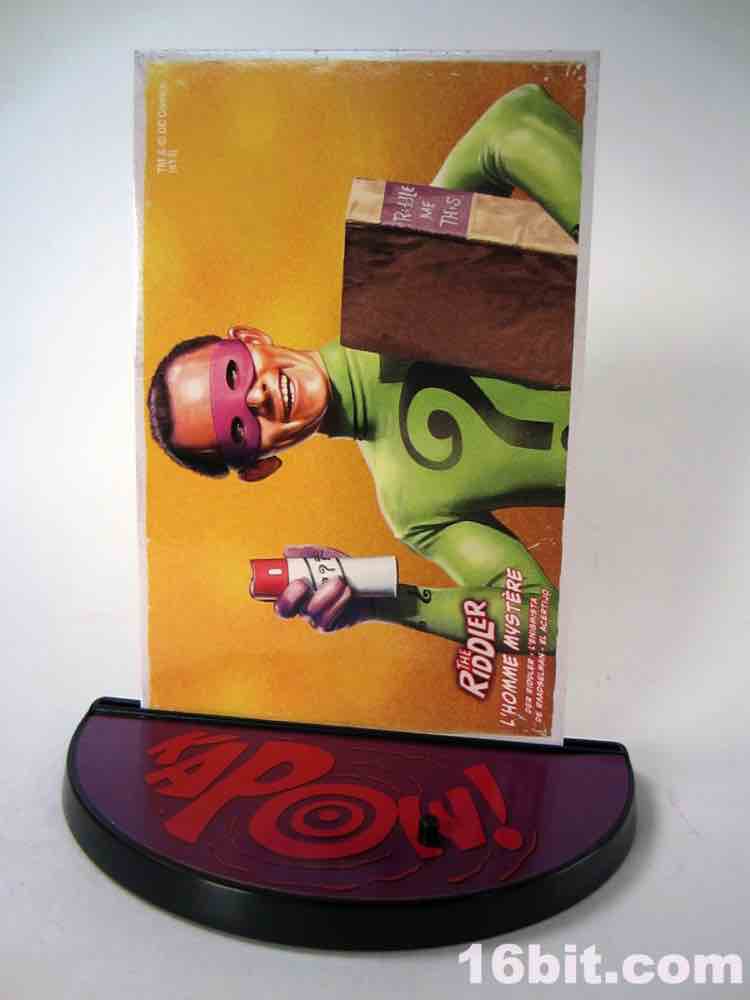 Mattel Batman Classic TV Series The Riddler Action FigureWith a good head sculpt and no problems to speak of - other than a small chip on the question mark on my sample - it's great. Having recently seen the 1966 movie (but not the TV show in quite some time) it meets the memory test. It lacks the sneer and piercing, lively gaze of the prototype as shown on Amazon but the colors are even more vibrant and that has to count for something. I like it! I'm glad they made it, I'm pleased I bought it, but double-jointed elbows would have been nice to give the figure a little something extra in light of the total lack of accessories, save for a display stand and disposable (but neat) oversized 3x5 trading card.
