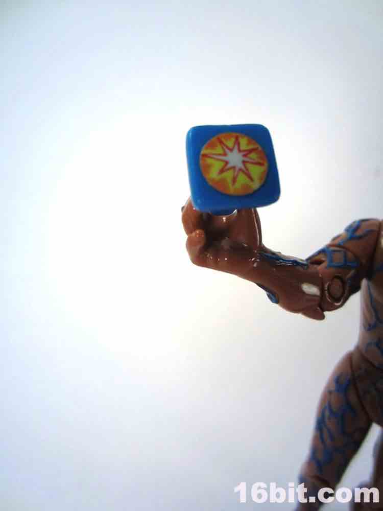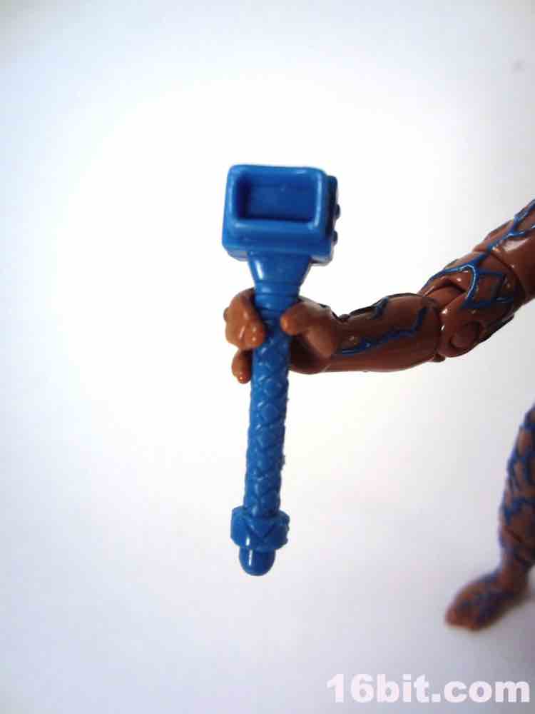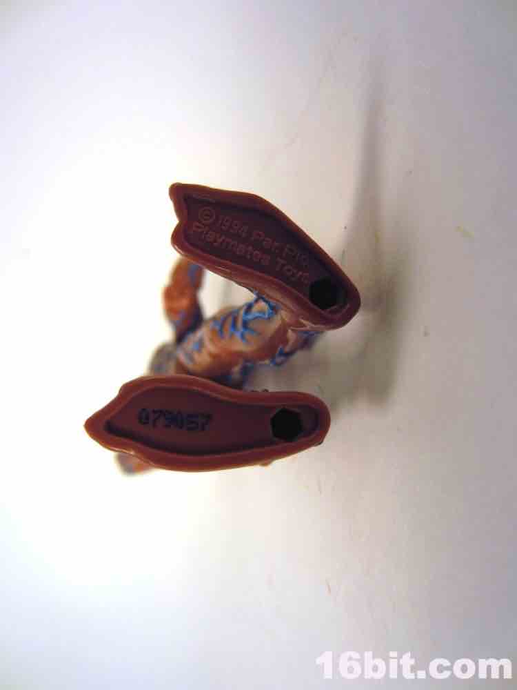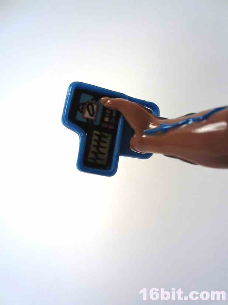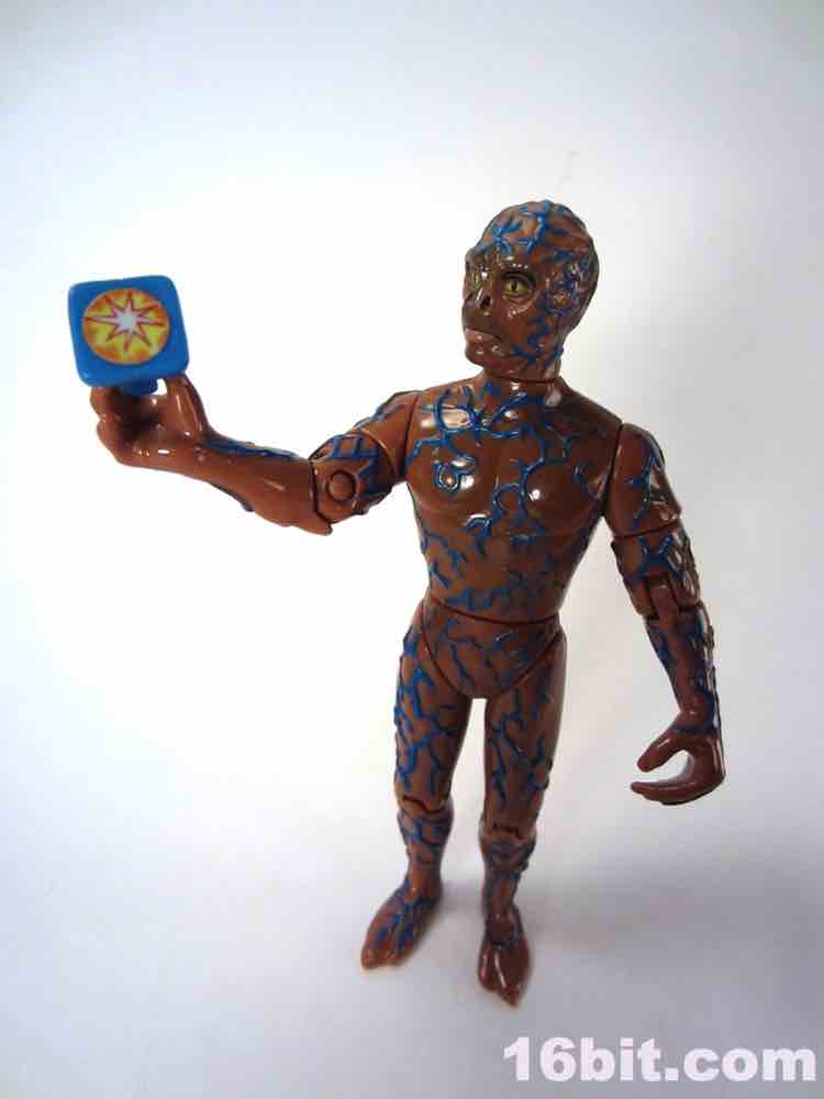 With 12 points of articulation, LaForge held to the standard of the line's early years - he was meant to be posed, he had no problems standing, and the sculpt was largely good. The figure is glossy brown plastic with blue veins, and his face had yellow cat-like eyes with dark brown around his eyes and mouth with pink lips. Three-fingered hands could easily grip his accessories, and his feet were basically flippers or footie pajamas. The design does nothing to hide articulation, so the waist and hip joints are sort of in-your-face.