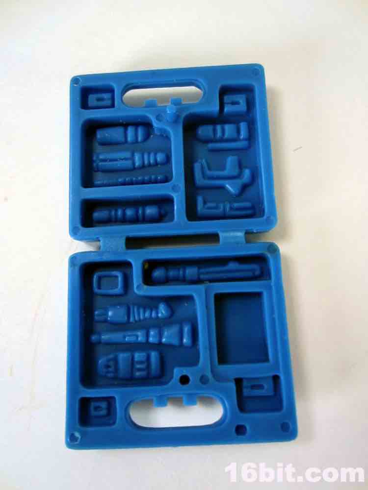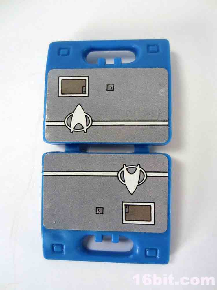 LaForge was almost feral at this point in the episode, so the alien's gear is really for your other figures - a UV-scanner helped see him in the planet's atmosphere, and the tracking gear could go to Riker or another character needing to beam down to any planet to find weird sciencey stuff. For collectors at the time, I believe the UV-scanner was the most interesting "new" piece in the set - similar accessories were sold with other figures, so they're just OK. The Field Kit has storage space for a PADD (not included) and a bunch of sculpted, non-removable gear on the inside. A label on the outside provided deco and looked pretty great - but the gear is all baby blue, which is sort of obnoxious.