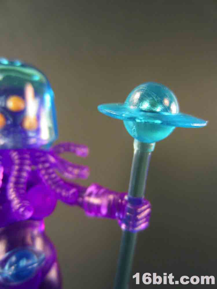 As with the other ladies, her range of motion is limited by the hip joints - she can sit, but it's at a roughly 135-degree angle. This means she can sit in some toy vehicles, but not all. It's a shame, a little freedom on the hip joint would allow this 3 3/4-inch space lady to fit inside countless vehicles from other toy lines rather than leaving her as basically shelf candy. She looks great - huge orange eyes peer from behind an icy blue helmet, with the aforementioned Saturn symbol poking out of her belly. The color here works better than on most figures, as the eyes are nice and big rather than tiny dots which get absorbed by the plastic.