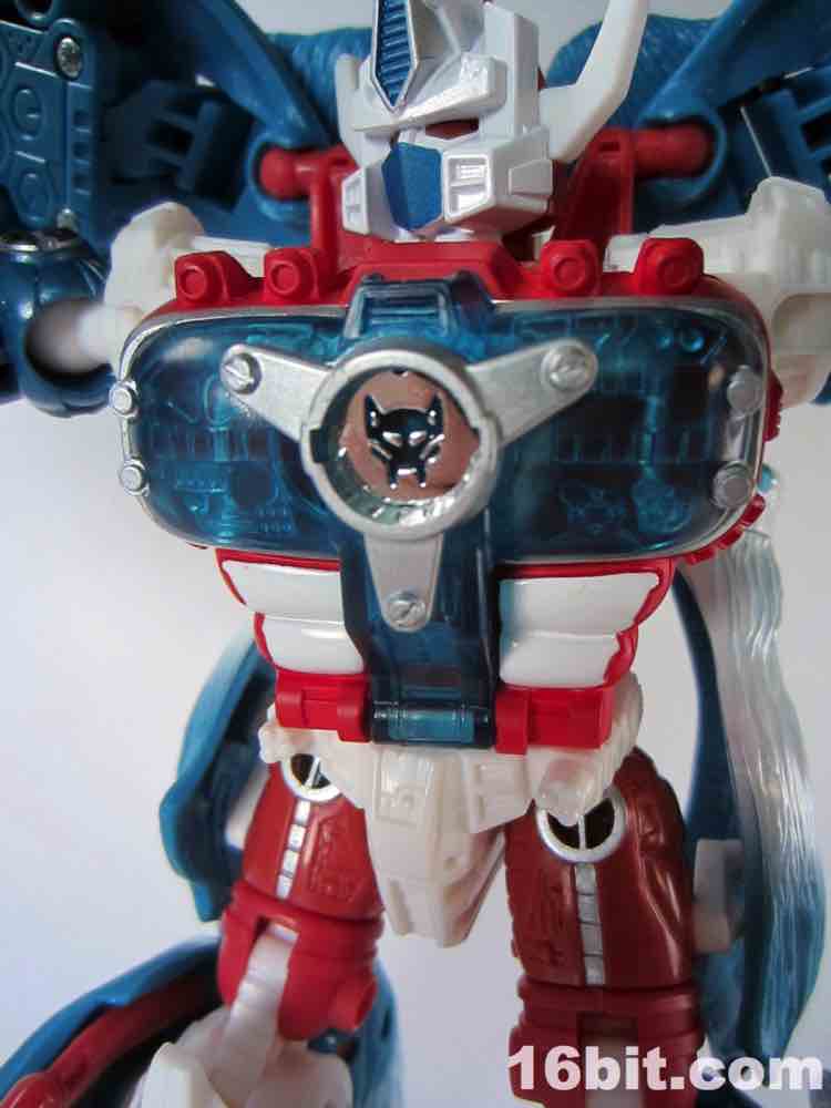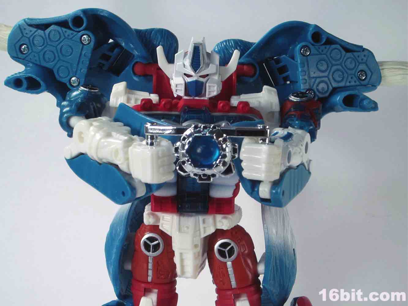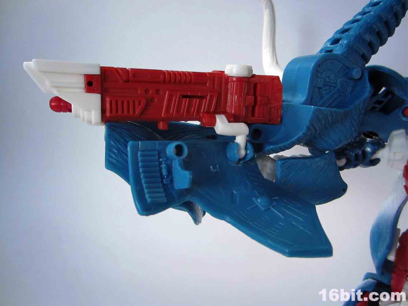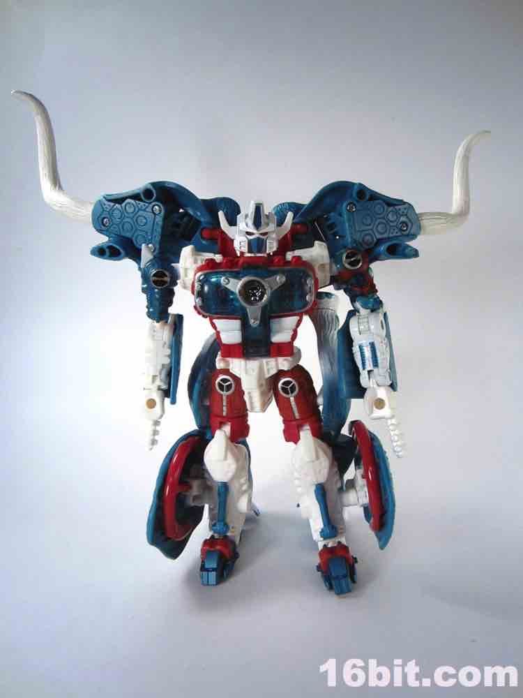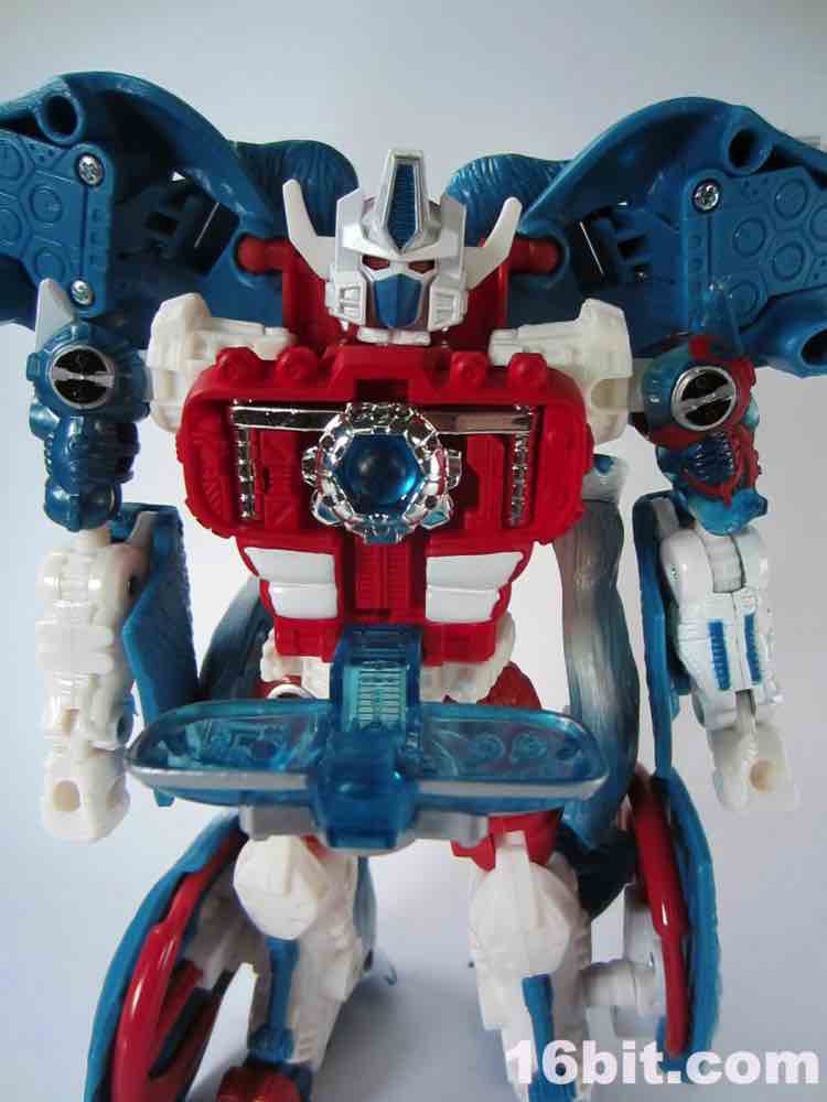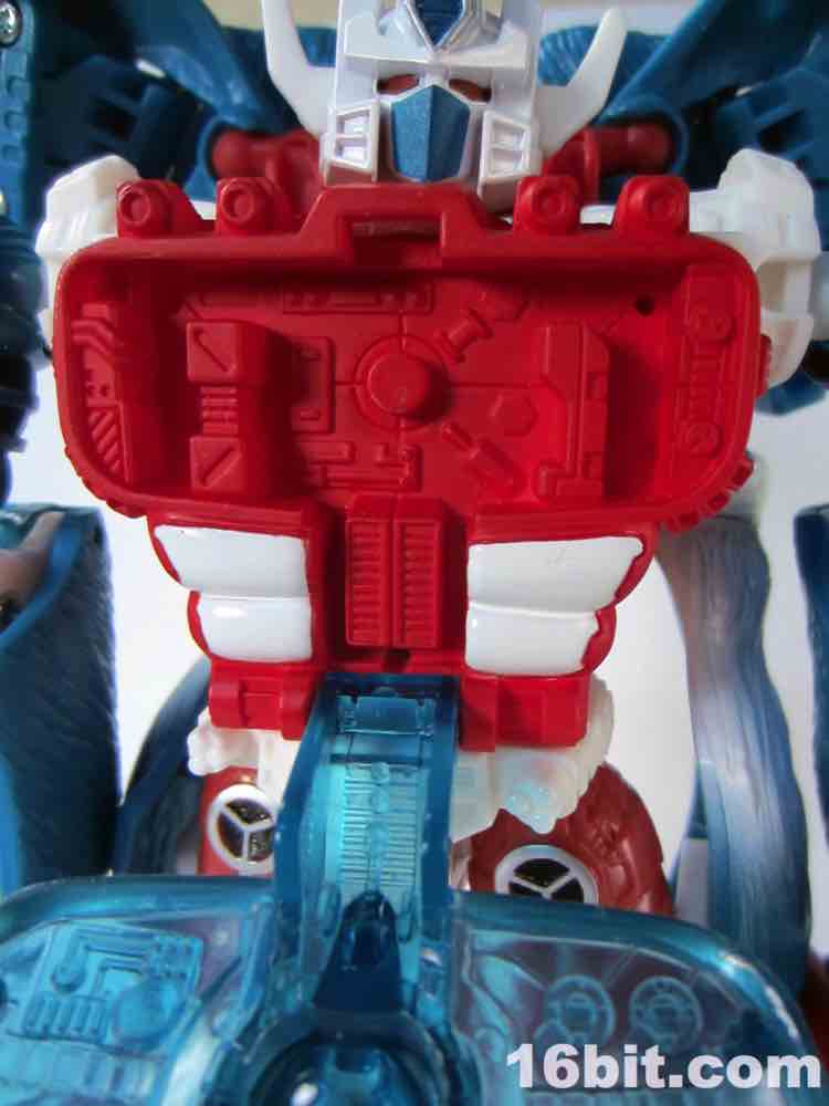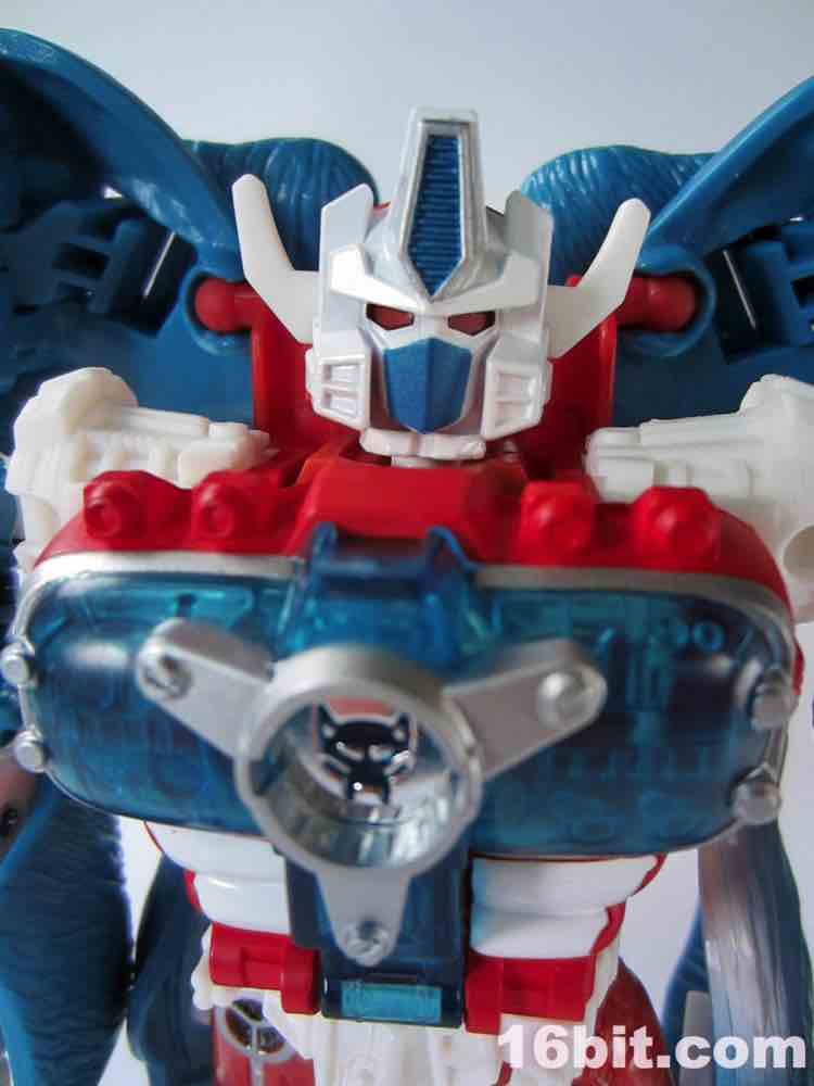 His giant gun - which includes a non-removable trunk and two launching projectiles - requires some massaging to get in his arms. It's also roughly 20% of his beast mode. It stores awkwardly on his back and greatly alters his center of gravity, so I'd suggest displaying it near him, not on him. If you have a spare weapon from another figure, or are holding out for BMOG, a smaller firearm may be a decent display option. You can also give him a chrome silver Matrix from his chest, which is a pretty neat little accessory. He also has two hook-firing cannons in the calf of each leg, and the rockets don't feel like the fit quite right - I'm having difficulty massaging the launchers back in to his Beast Mode while armed. My previous versions were not so quarrelsome.