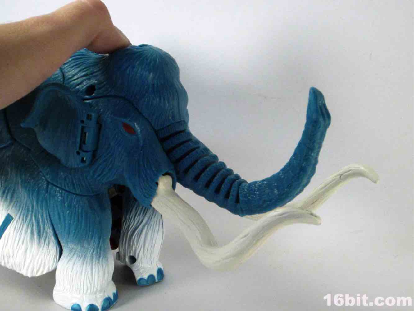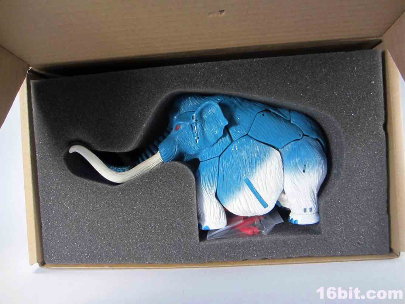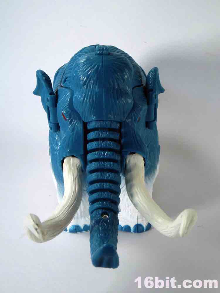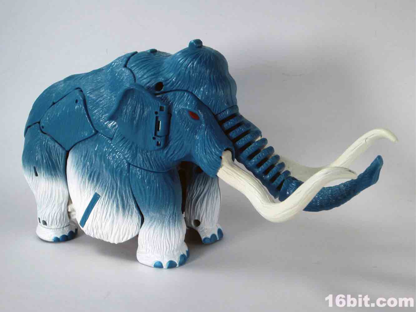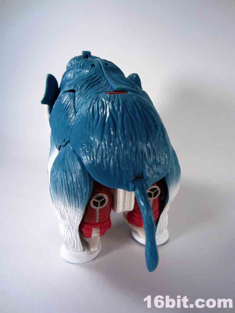 Packed out in mammoth mode, you'll note that converting him from the pachyderm to a robot is a snap - everything explodes out nicely, although a few panels tend to pop off (just like the previous releases.) The mammoth doesn't do a lot - if you move his ears, the tusks wiggle. If you pull back on the lever, his trunk curls up a bit. It's quite stiff, and my Big Convoy is similarly stiff. I hear some people say it has more give, I just got lucky. The snowy mammoth is molded in blue plastic with some white fur that looks like it has been covered in snow, which works nicely. Even in beast mode, this figure looks like a leftover from the 1990s - which, if you weren't there, was a glorious period of time where people didn't seem to care about Transformers as much, Hasbro and Takara were a smidgen more experimental, and the fiction went beyond "Optimus Prime has a new form, and some new friends, so let's watch him fight." It got weird, regularly, but it was also amazingly fun. (Having said that, the toys today are relatively cheaper and higher quality if you adjust for inflation.) Where was I? Right, transforming - mammoth to robot is a breeze. Robot to mammoth is deeply unpleasant.