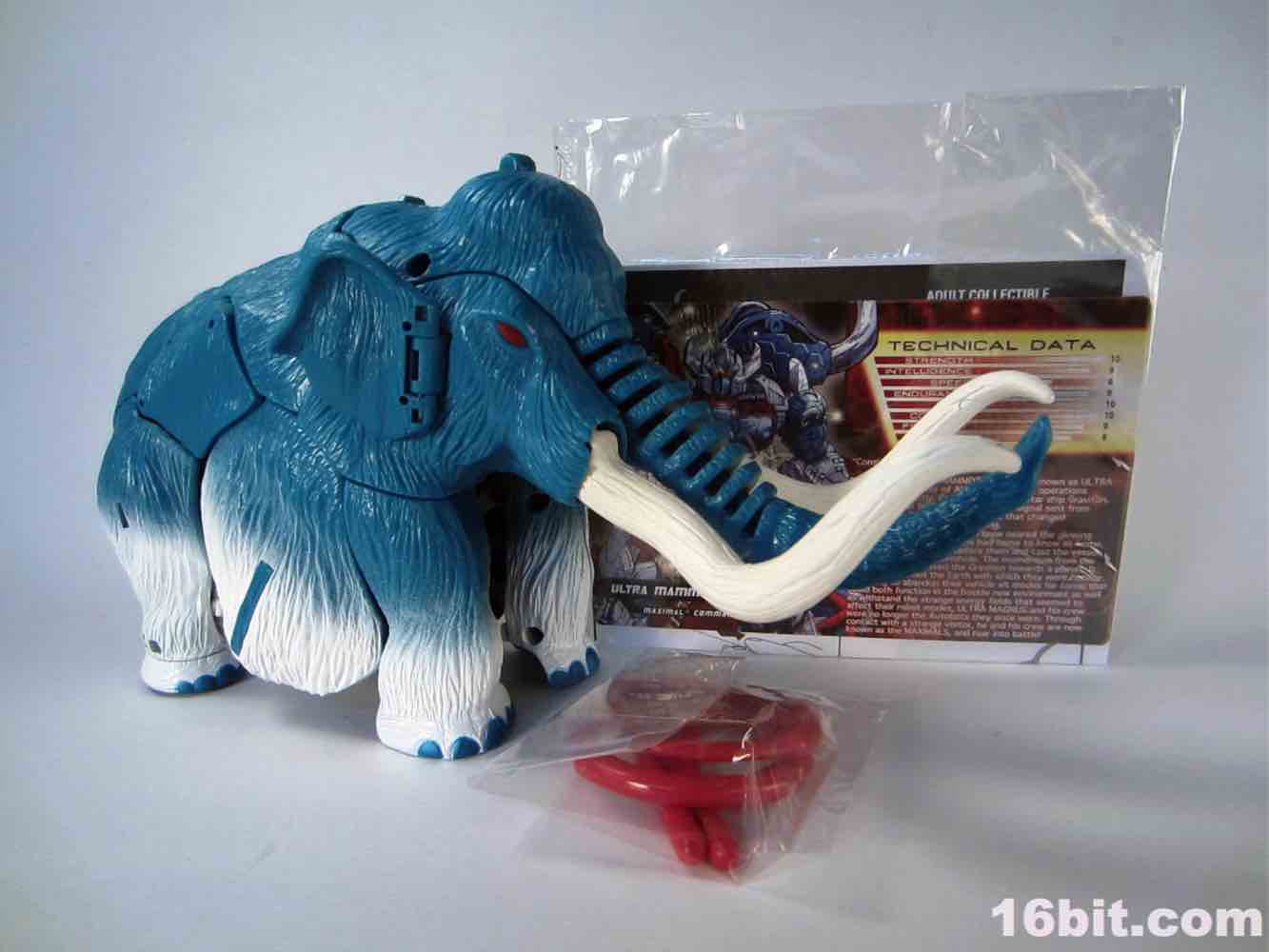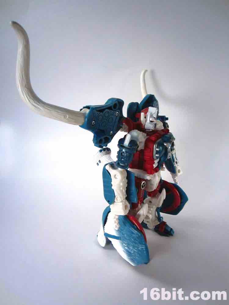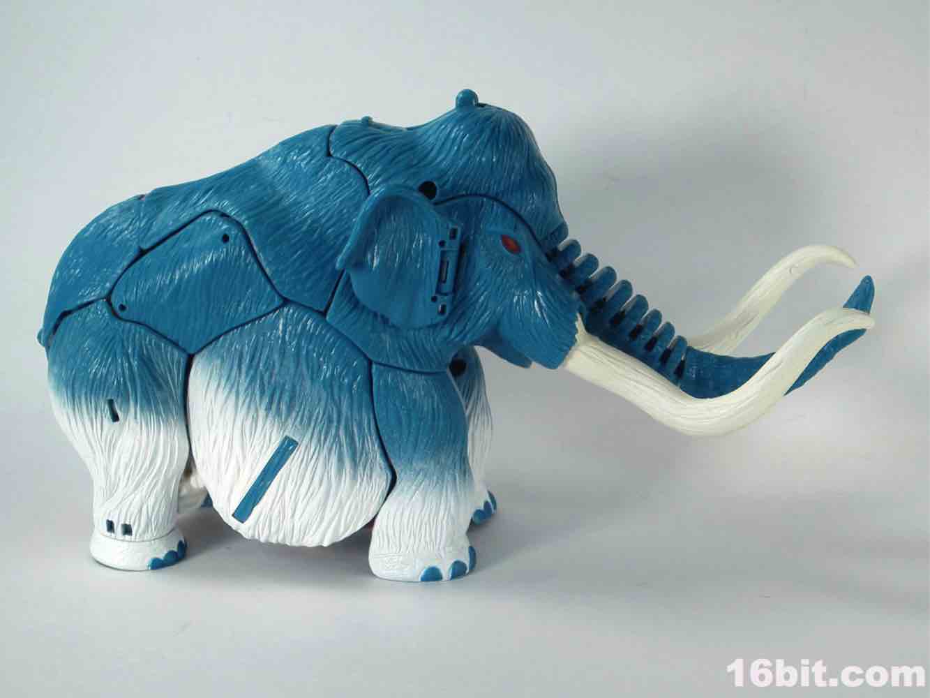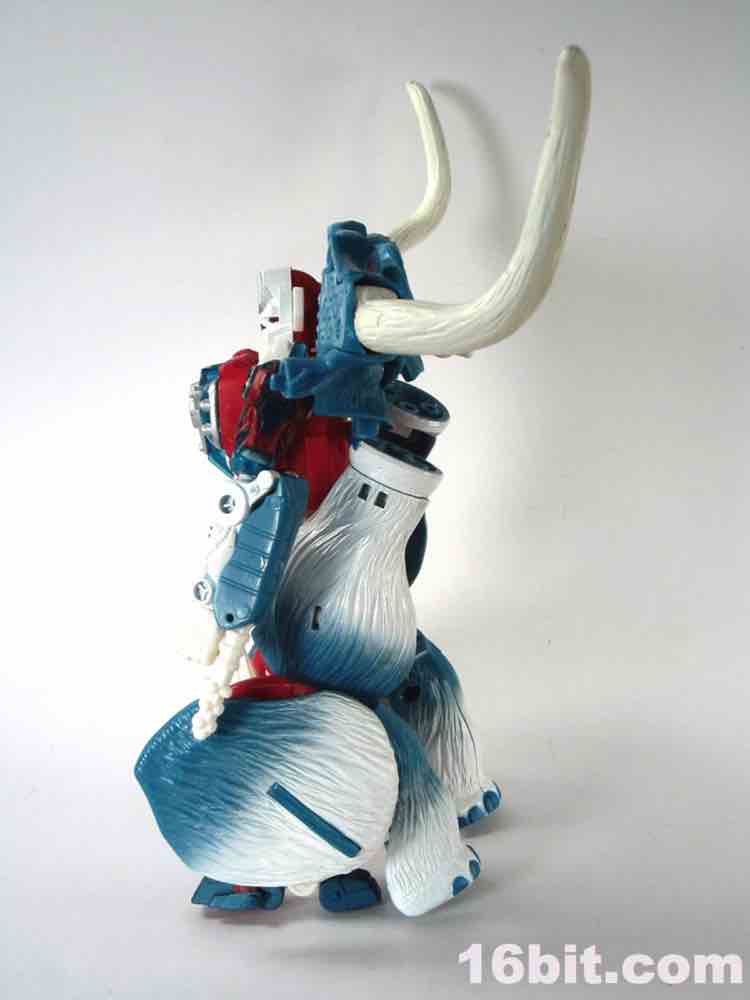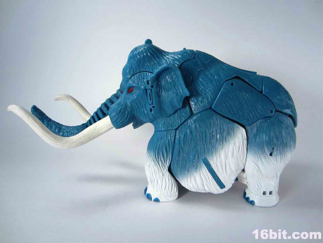 Packed out in mammoth mode, you'll note that converting him from the pachyderm to a robot is a snap - everything explodes out nicely, although a few panels tend to pop off (just like the previous releases.) The mammoth doesn't do a lot - if you move his ears, the tusks wiggle. If you pull back on the lever, his trunk curls up a bit. It's quite stiff, and my Big Convoy is similarly stiff. I hear some people say it has more give, I just got lucky. The snowy mammoth is molded in blue plastic with some white fur that looks like it has been covered in snow, which works nicely. Even in beast mode, this figure looks like a leftover from the 1990s - which, if you weren't there, was a glorious period of time where people didn't seem to care about Transformers as much, Hasbro and Takara were a smidgen more experimental, and the fiction went beyond "Optimus Prime has a new form, and some new friends, so let's watch him fight." It got weird, regularly, but it was also amazingly fun. (Having said that, the toys today are relatively cheaper and higher quality if you adjust for inflation.) Where was I? Right, transforming - mammoth to robot is a breeze. Robot to mammoth is deeply unpleasant.