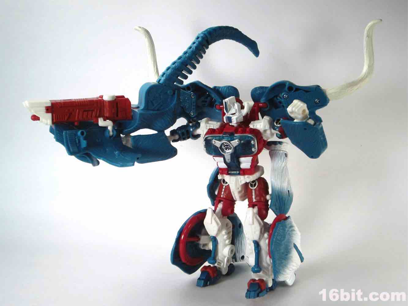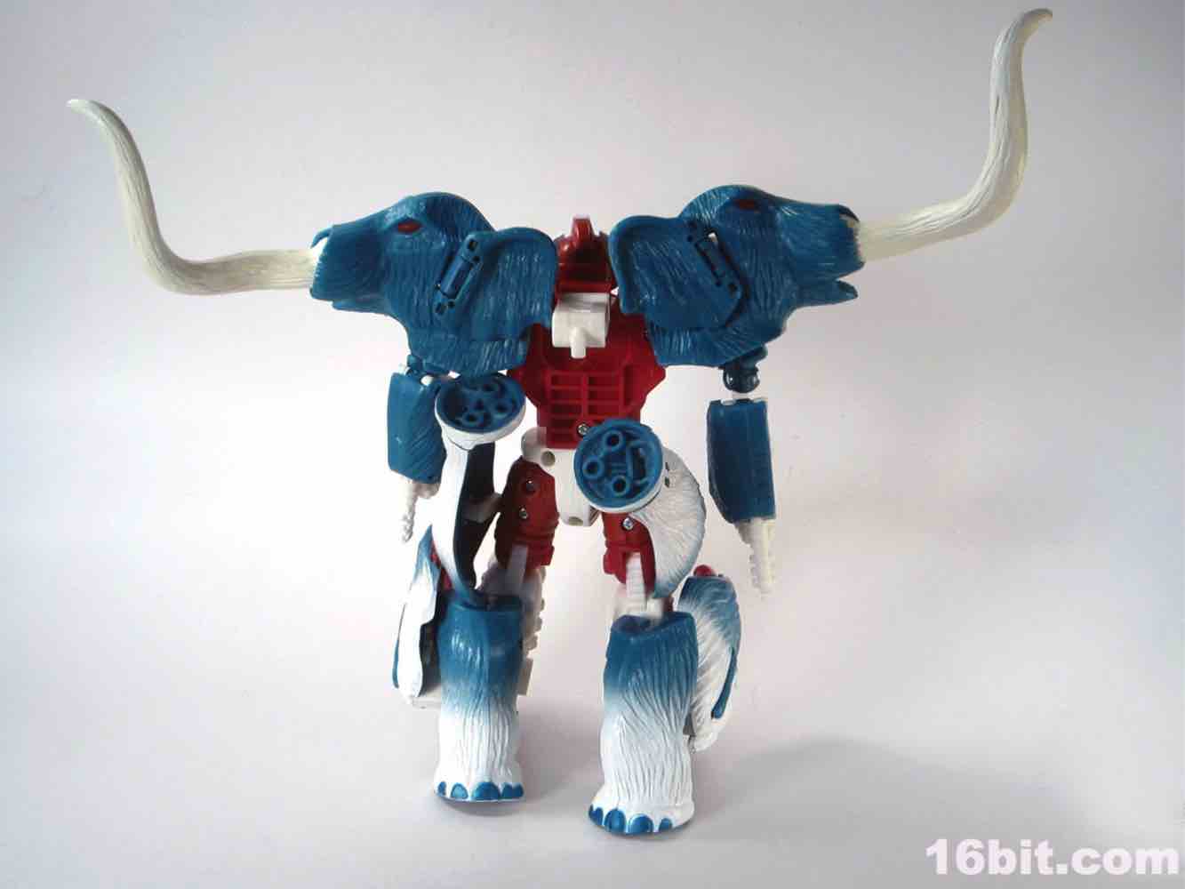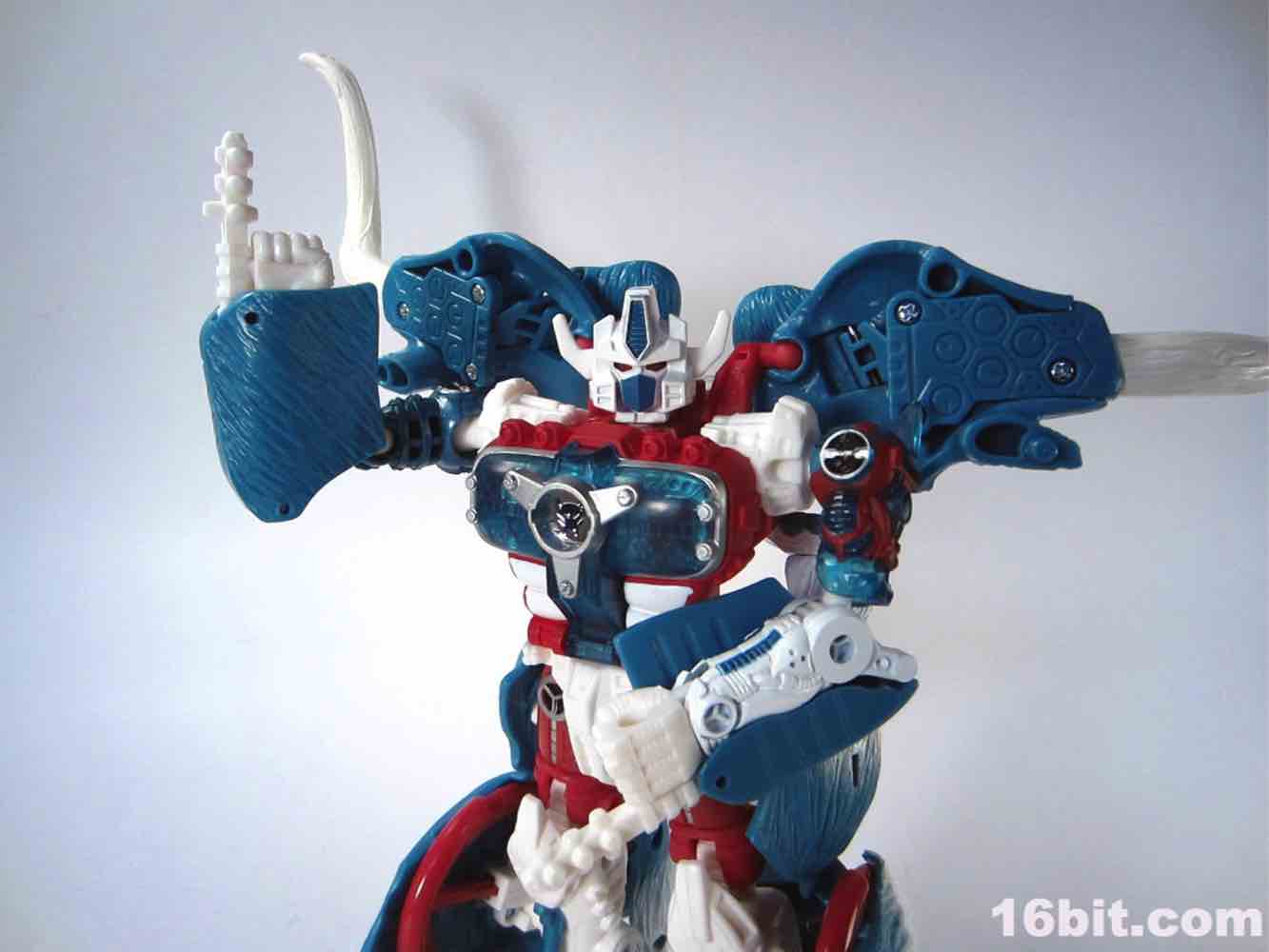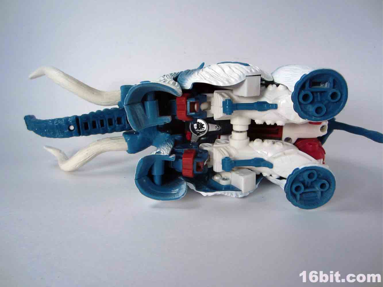 Packed out in mammoth mode, you'll note that converting him from the pachyderm to a robot is a snap - everything explodes out nicely, although a few panels tend to pop off (just like the previous releases.) The mammoth doesn't do a lot - if you move his ears, the tusks wiggle. If you pull back on the lever, his trunk curls up a bit. It's quite stiff, and my Big Convoy is similarly stiff. I hear some people say it has more give, I just got lucky. The snowy mammoth is molded in blue plastic with some white fur that looks like it has been covered in snow, which works nicely. Even in beast mode, this figure looks like a leftover from the 1990s - which, if you weren't there, was a glorious period of time where people didn't seem to care about Transformers as much, Hasbro and Takara were a smidgen more experimental, and the fiction went beyond "Optimus Prime has a new form, and some new friends, so let's watch him fight." It got weird, regularly, but it was also amazingly fun. (Having said that, the toys today are relatively cheaper and higher quality if you adjust for inflation.) Where was I? Right, transforming - mammoth to robot is a breeze. Robot to mammoth is deeply unpleasant.