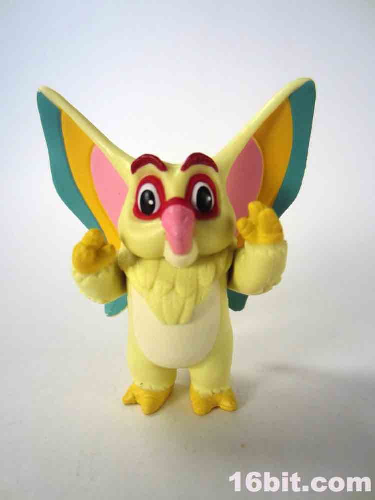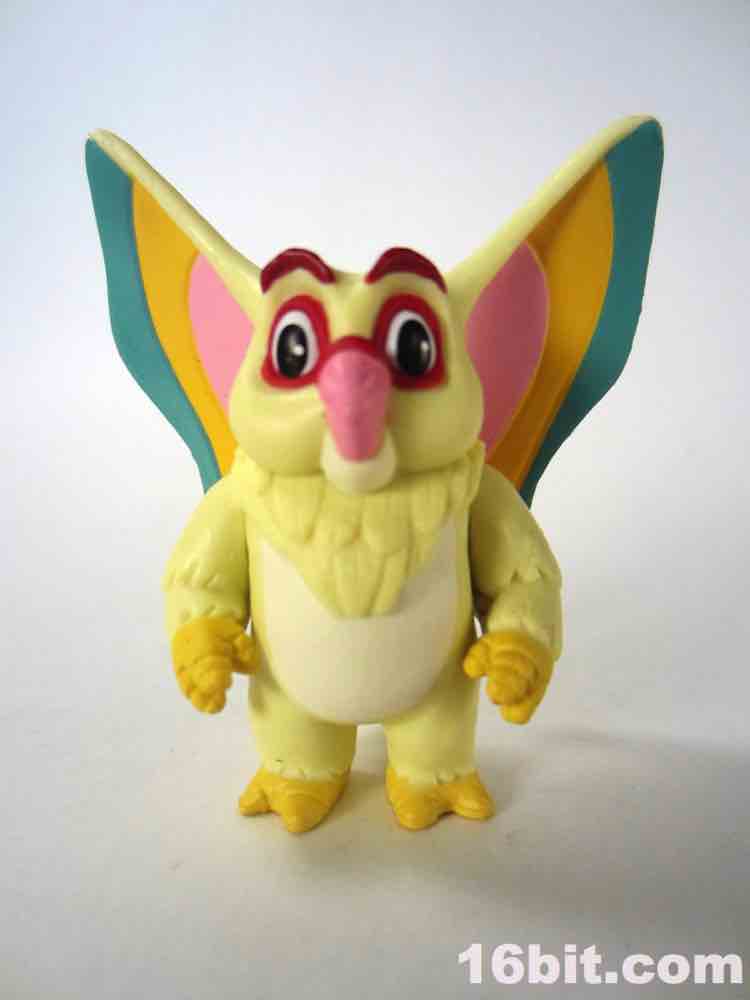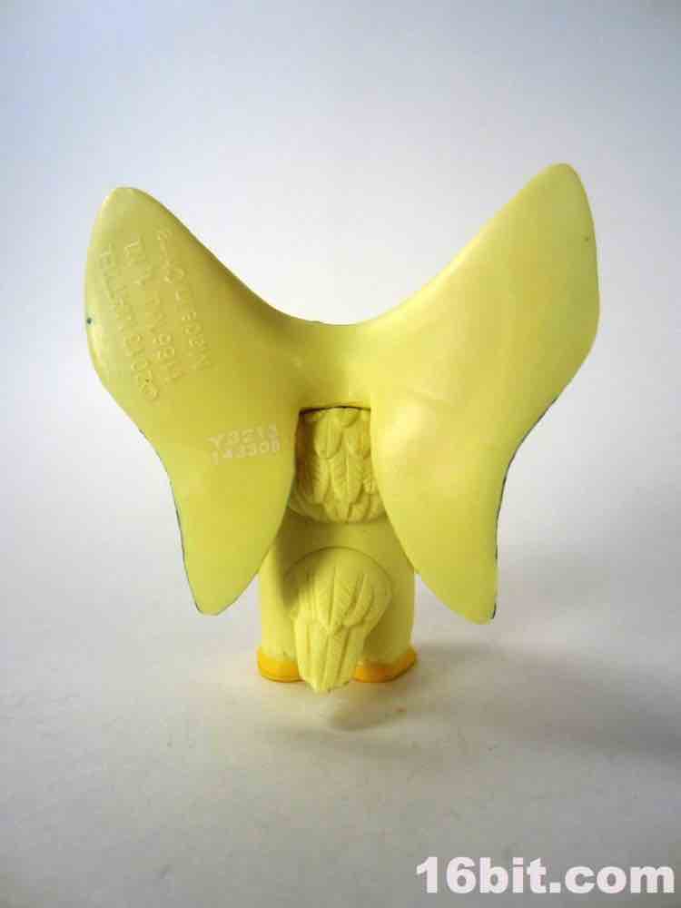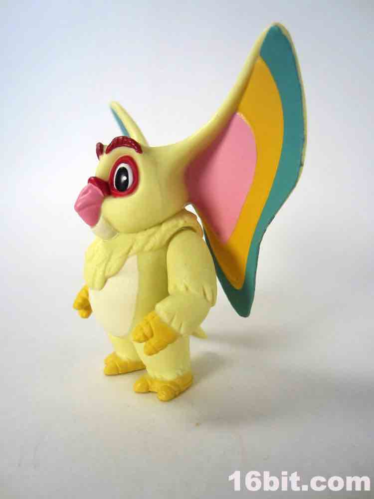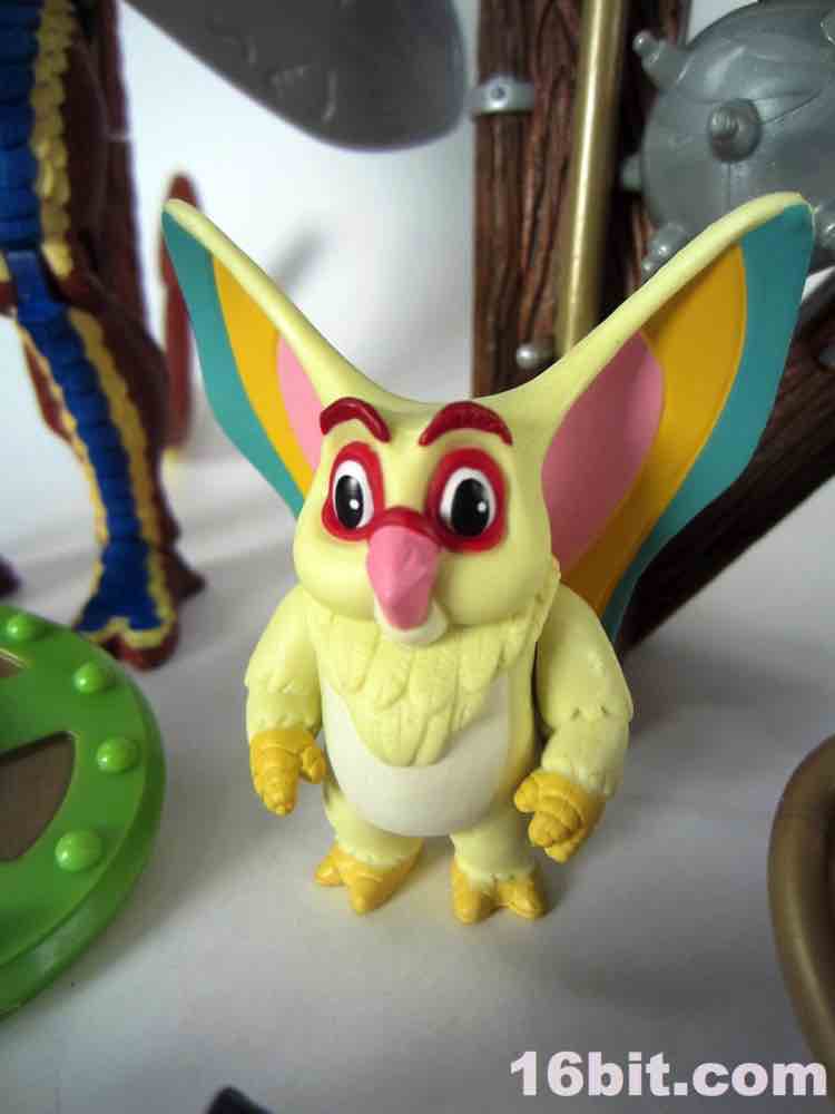 The teeny-tiny know-it-all owl is about 2 1/3-inches high at the ears, which are decorated quite nicely. Mattel and the Horsemen took his animation model and applied the toy's colors to it, resulting in a perfectly nice little figure. The original toy had slightly more feminine eyelashes, and the darker feathers of the cartoon would be a nice fit here but there's nothing wrong with the yellowish tint. The chubby little guy looks like Dumbo and a Care Bear mated, with big eyes and a beak. I'm not sure which parent donated the beak. Each arm is articulated, as is the neck - other than that, the figure just more or less stands there and looks good. For those keeping track he's a bit smaller than Orko, unless you count the ears.