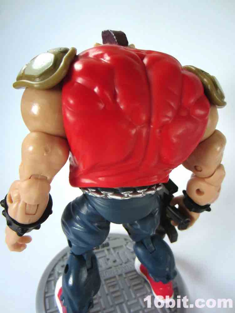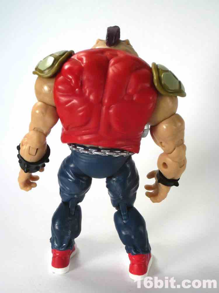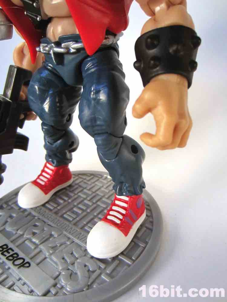 The figure plugs right in to his display stand and he has no problem holding his only weapon, a gun. Given the increased price I feel like I deserve more - it's not like Playmates splurged on articulation here. Bebop is quite good with bend-and-swivel wrists, but the rotating neck movement is superbly weak and the grand total of joints is 20. 20 sounds like a lot, but the whole thing feels like an unfinished factory test, especially compared with last year's "toitles." The shoes swivel around, but don't pivot at all. The legs can't swing forward easily, and feel a lot like hindered versions of the original 1980s figure hips. The double knee joints are nice but don't really add much to the figure's ability to be posed. The double elbows are a nice touch, and work well. His hip joint is, in a word, worthless. He can't twist more than a few millimeters and there's little "pivot" to help him hunch forward.
