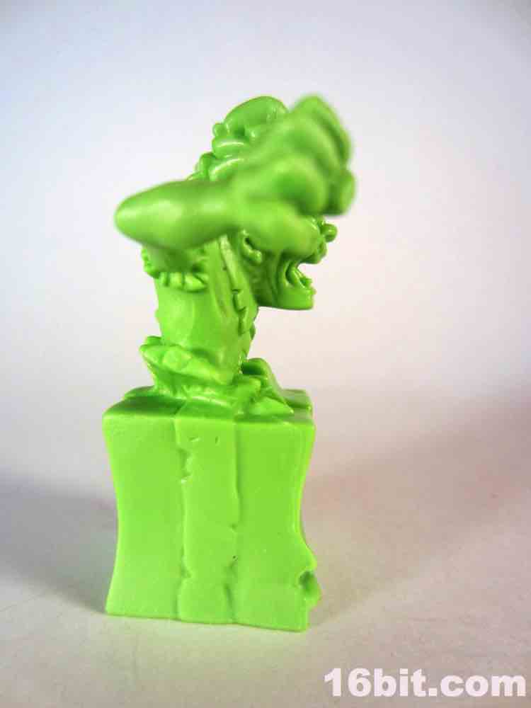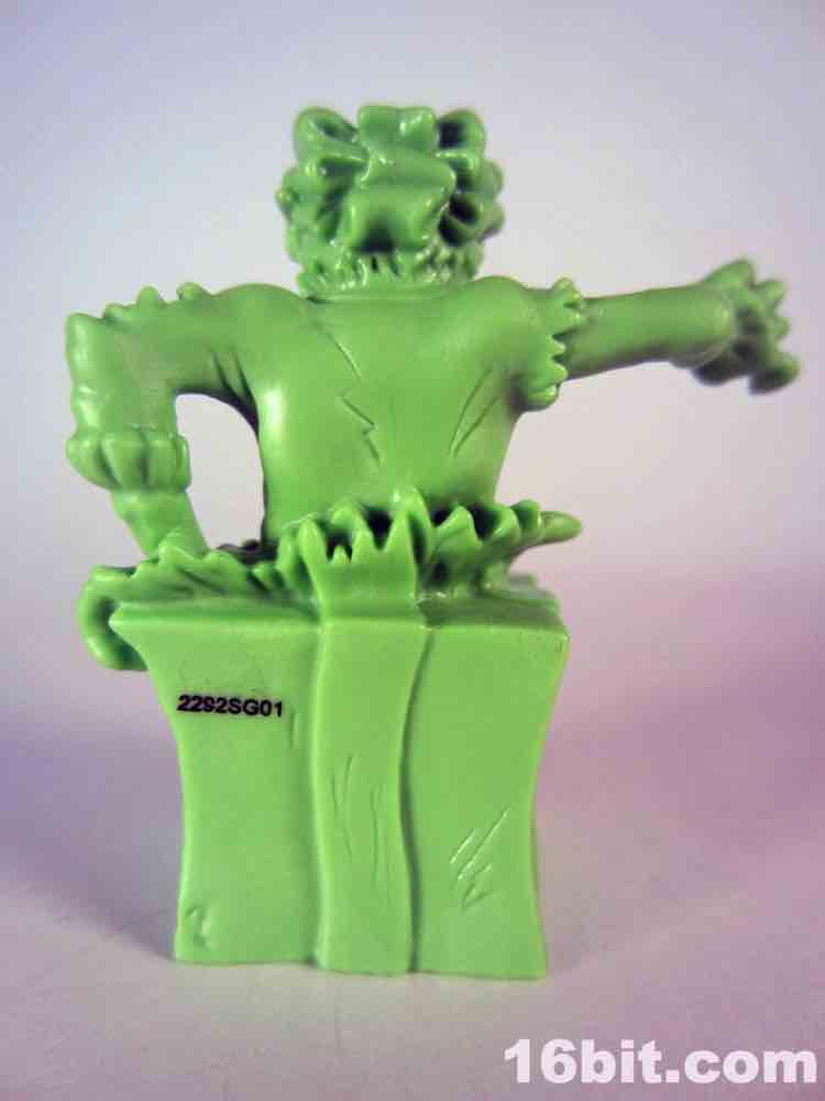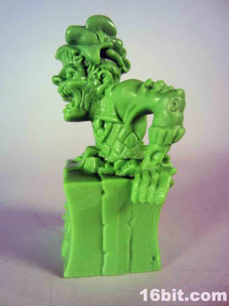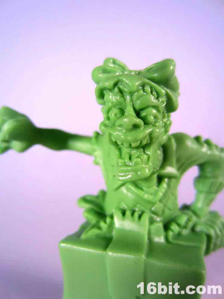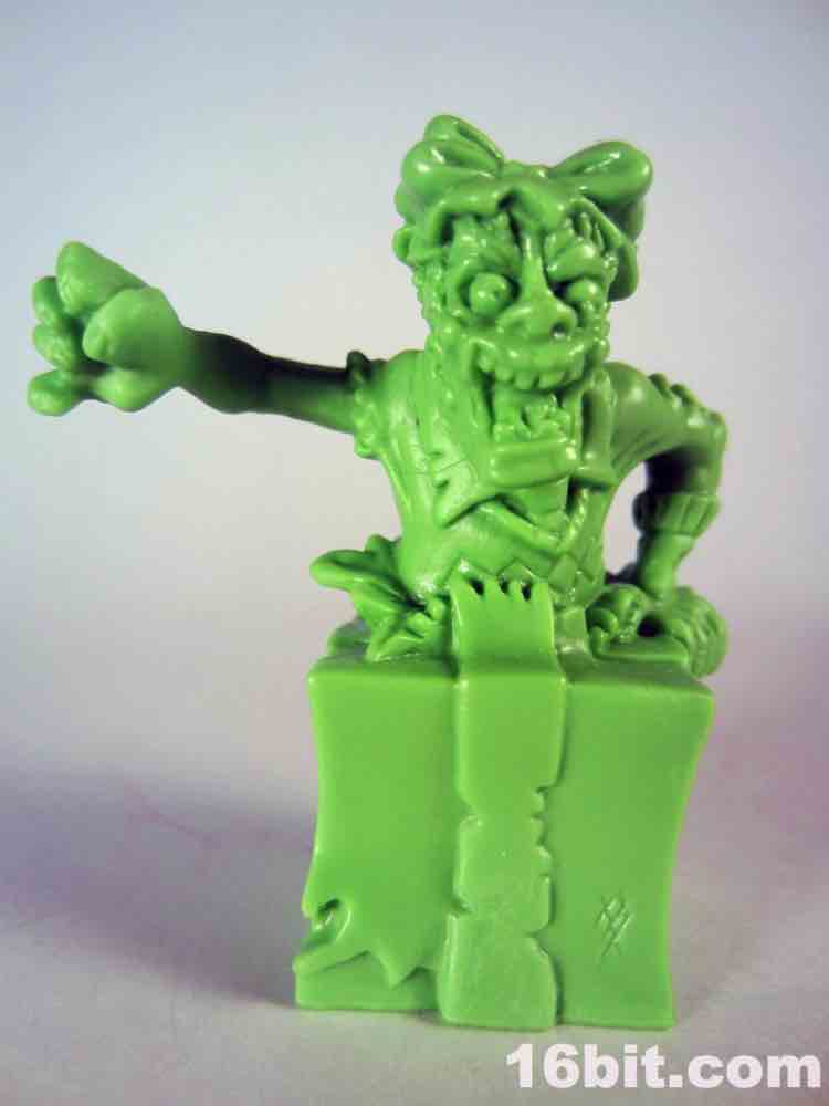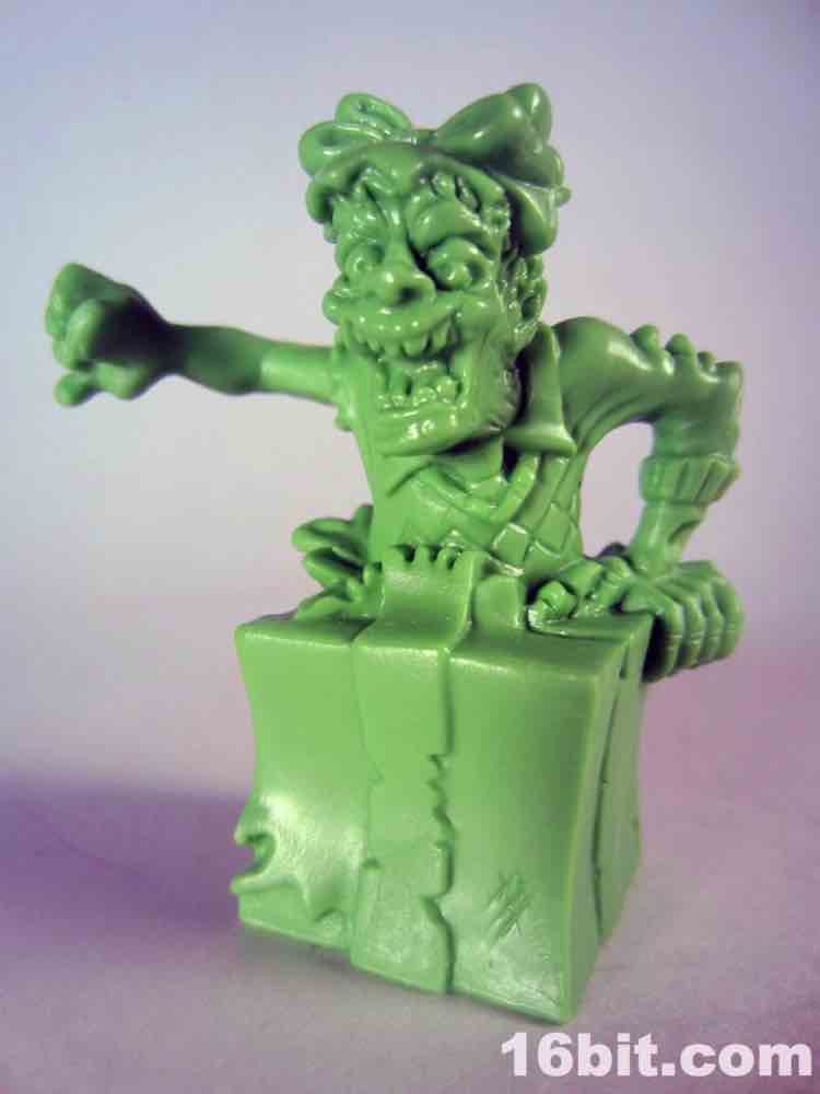 Not based on anything in particular is Surprise Demise, a dad/grampa type in a sweater vest. Or what's left of a sweater. He's leaping out of a gift box and is really about as thematically perfect as you could hope for. The box alone is more interesting than a lot of small collectible figures, with tattered ribbons, crushed sides, and what seem to be some sort of claw scrapes. It's swell - and the figure bursts out from the top quite nicely. I don't know why he's jumping out of the box to reach over to the side - where he isn't looking - but whatever. It looks cool, and it seems like this should have been something I saw in 1987. With the recent zombie surge in popularity I would have loved to see more of these out there, but this figure is probably never going to be seen ever again except on the desk of the weird guy at your office (you know the guy).