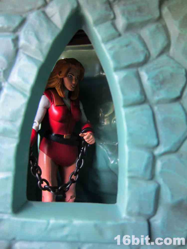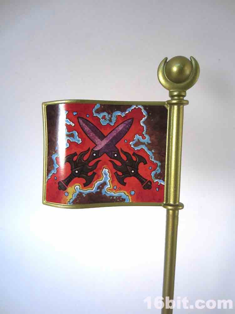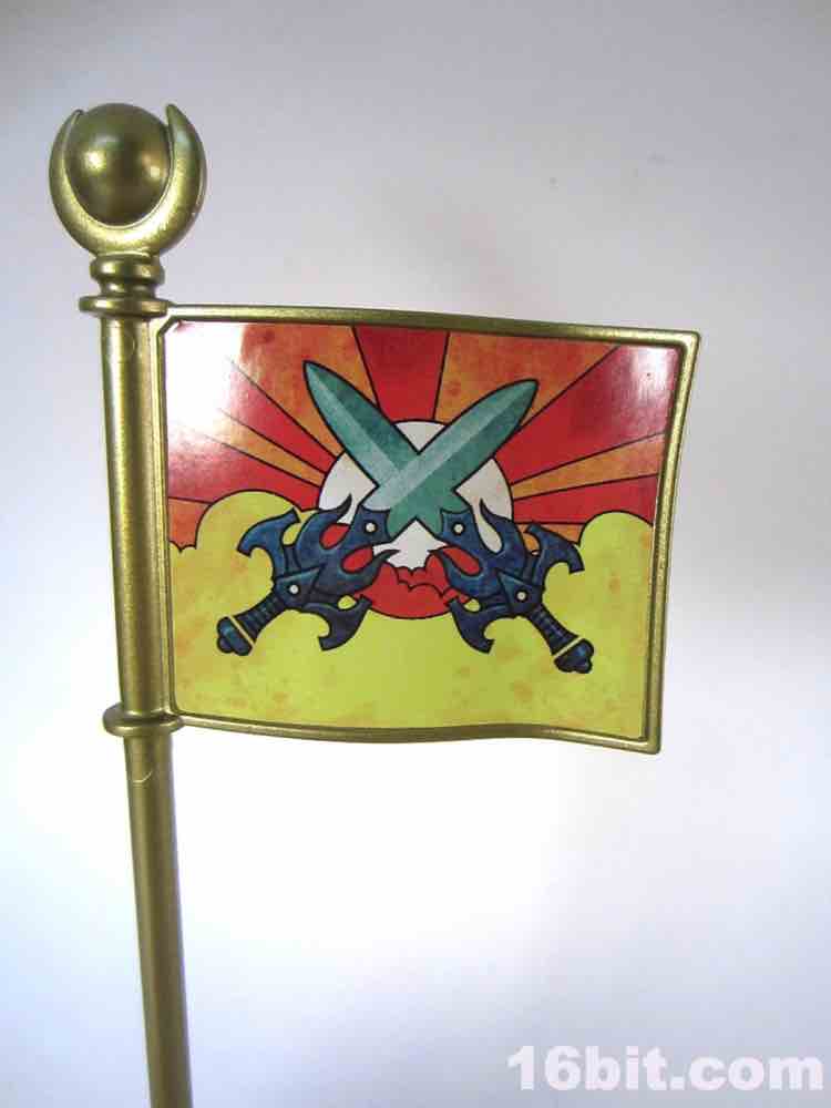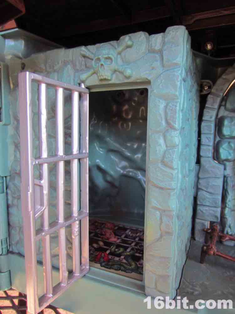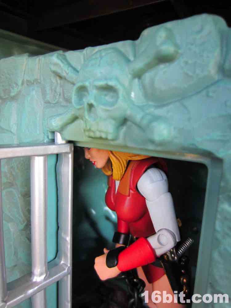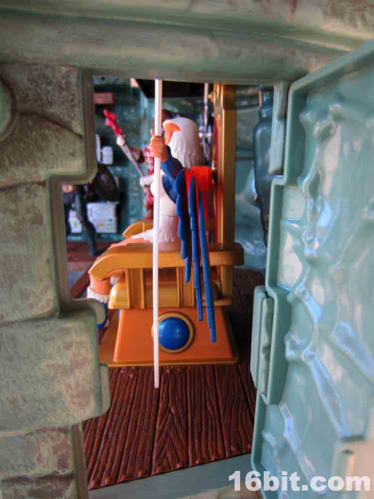 What I didn't care for: One, the prison cell (a nice addition) isn't tall enough to easily get a figure in there. Acrobatics are required. Three, the flag just sort of sits there - it doesn't fasten in place. Four: the throne has difficulty holding most figures that aren't the Sorceress, so if you want Skeletor to take over the castle it looks like he's going to fall off the chair and into some pit below. Five, the place for the stand for your Wind Raider, if you don't put your Wind Raider in there, is a big ugly hole. Fans are already making manhole plugs for it, and I hope Mattel follows suit in a future Weapons Pak. It needs a cover or some other thing to plug the hole. The Wind Raider stand is also an incredibly tight fit - it's nearly impossible to remove without creating stress marks. (I created stress marks. This angers me.) The Wind Raider is also in the way of the lower level of the ship - part of me wonders if this was a corporate mandate to include Wind Raider interaction, because, really, no. Just no.