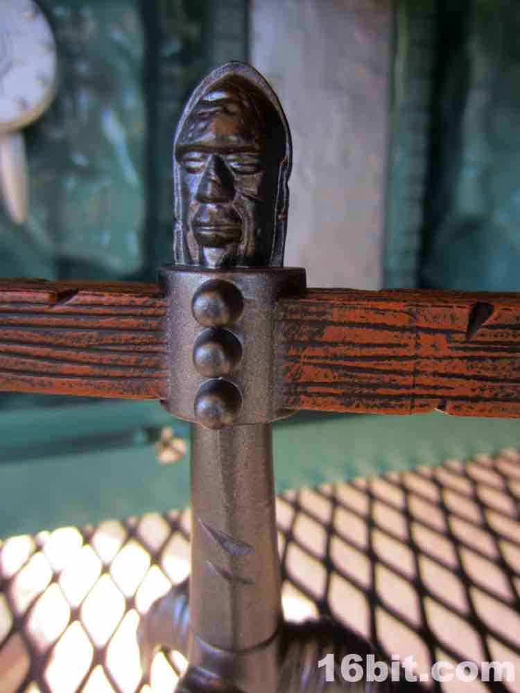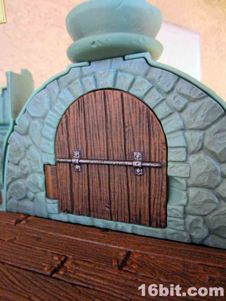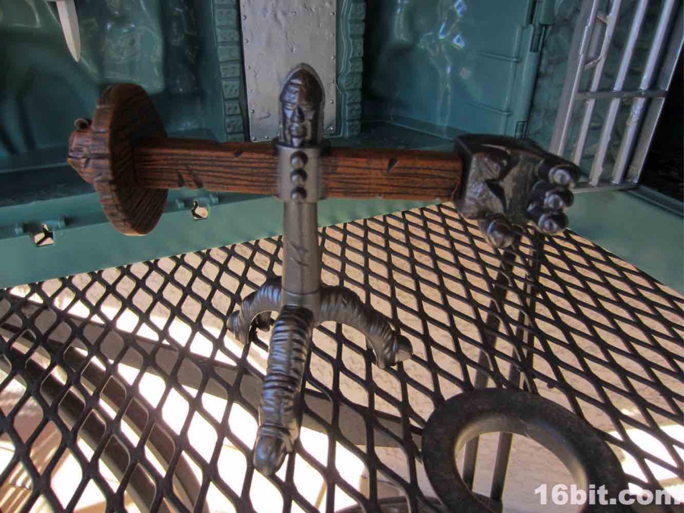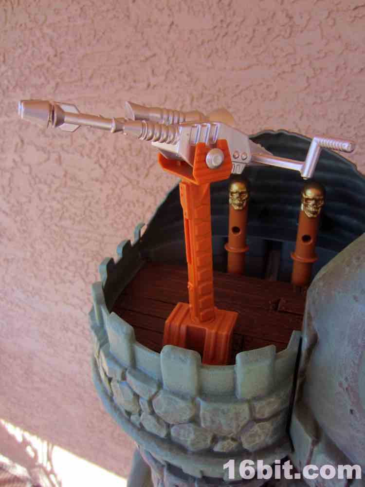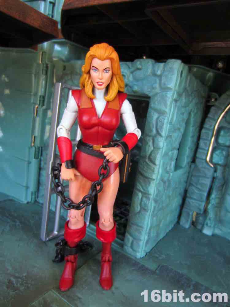 What I didn't care for: One, the prison cell (a nice addition) isn't tall enough to easily get a figure in there. Acrobatics are required. Three, the flag just sort of sits there - it doesn't fasten in place. Four: the throne has difficulty holding most figures that aren't the Sorceress, so if you want Skeletor to take over the castle it looks like he's going to fall off the chair and into some pit below. Five, the place for the stand for your Wind Raider, if you don't put your Wind Raider in there, is a big ugly hole. Fans are already making manhole plugs for it, and I hope Mattel follows suit in a future Weapons Pak. It needs a cover or some other thing to plug the hole. The Wind Raider stand is also an incredibly tight fit - it's nearly impossible to remove without creating stress marks. (I created stress marks. This angers me.) The Wind Raider is also in the way of the lower level of the ship - part of me wonders if this was a corporate mandate to include Wind Raider interaction, because, really, no. Just no.