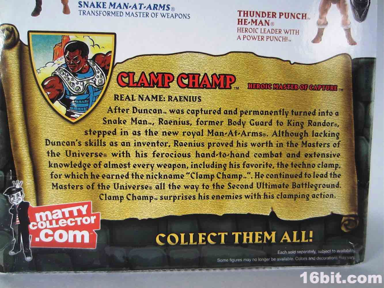 Item No.: No. Y3195 Manufacturer:Mattel Includes: Clamps Action Feature:Clamp weapon opens Retail:$27.00 Availability:July 2013 Other: First Clamp Champ Action Figure since... a long time ago