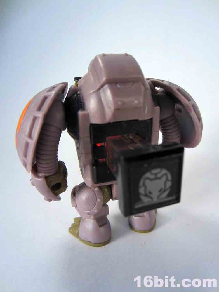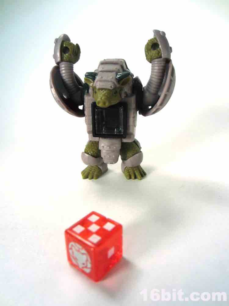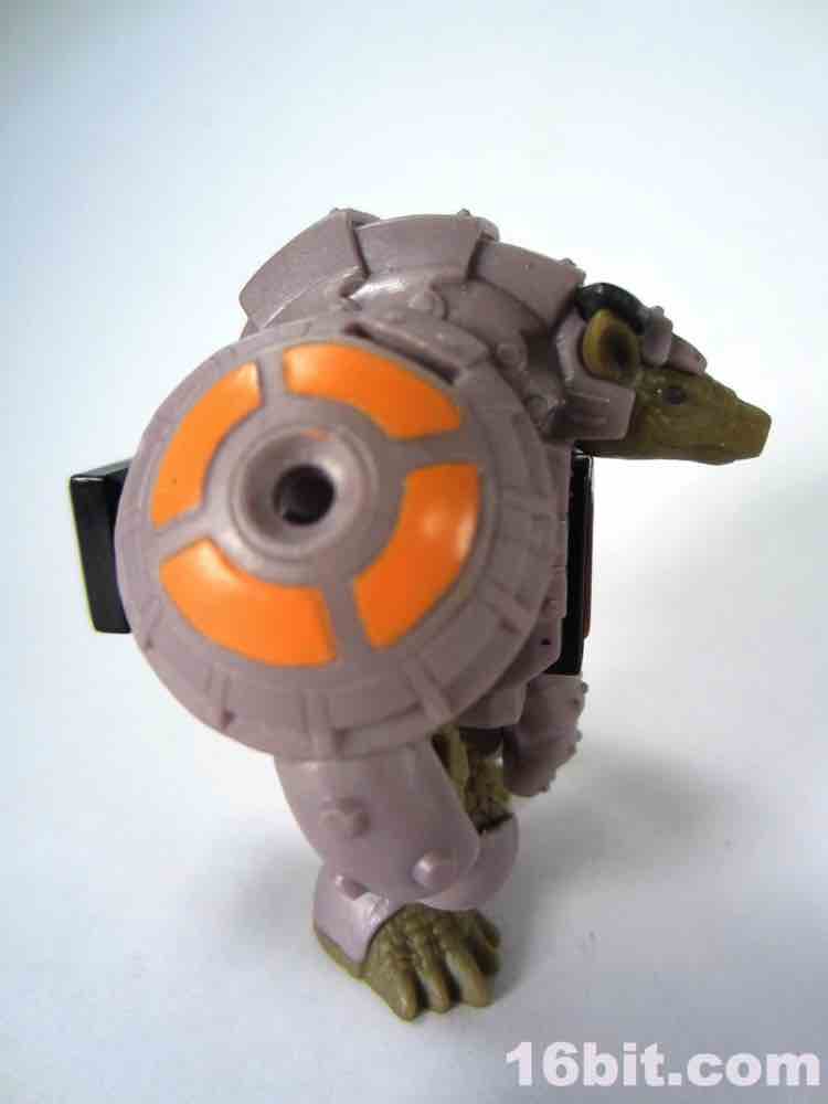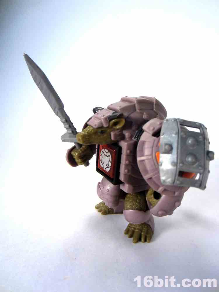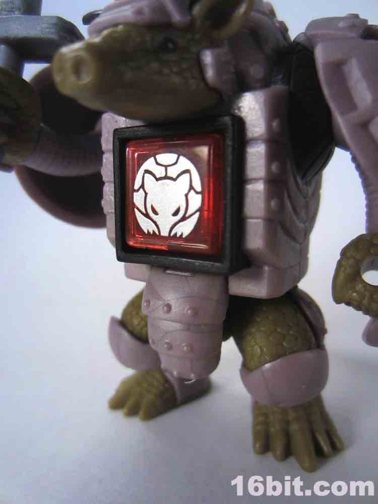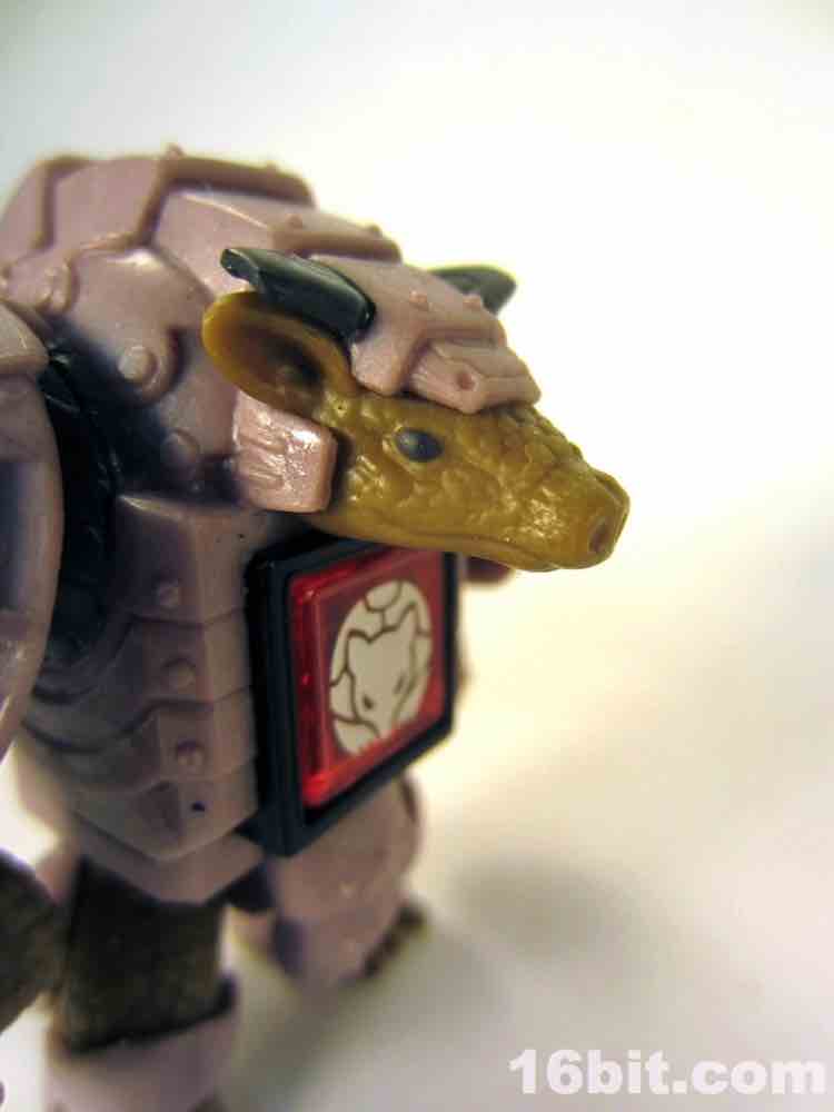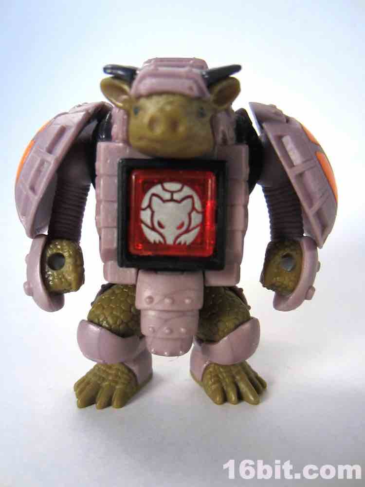The sculpted detail is pretty good, but not spectacular. The armor has a bunch of visible (but obviously non-functional) joints befitting such a creature, complete with a snout and painted ears. The feet are kind of weird, but they match other similar armadillo toys. (See: Beast Wars Armordillo, Psycho-Orb, or Bump.) The really nifty thing about this figure (and indeed the whole line) is just how little paint is present - the purple pieces are molded purple plastic, and the brown skin is also molded in brown. The eyes, ears, and red highlights on the armor are the only paint on the toy, which is neat from a manufacturing perspective. If you like the look of the figure it's worth picking up for that reason alone.