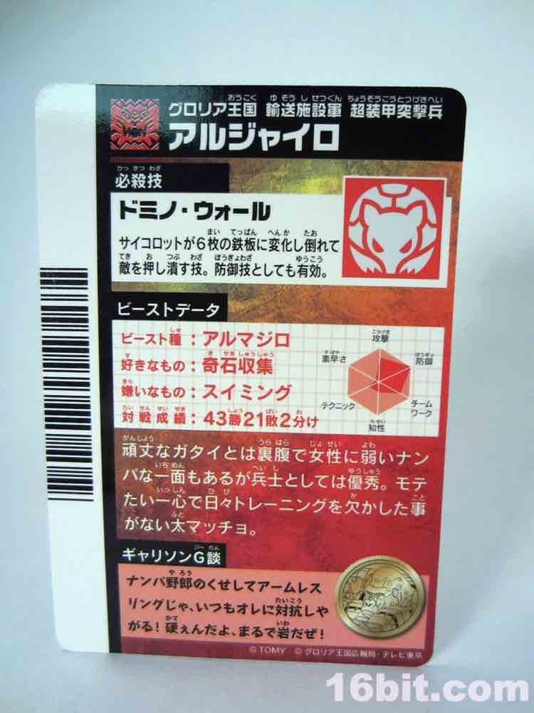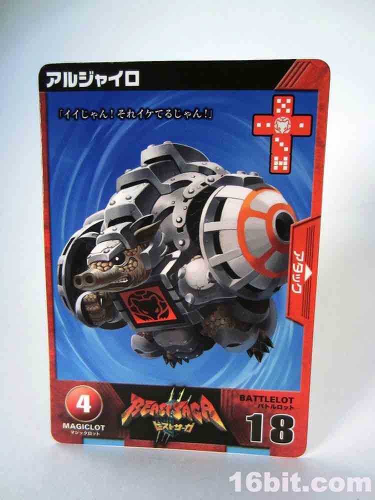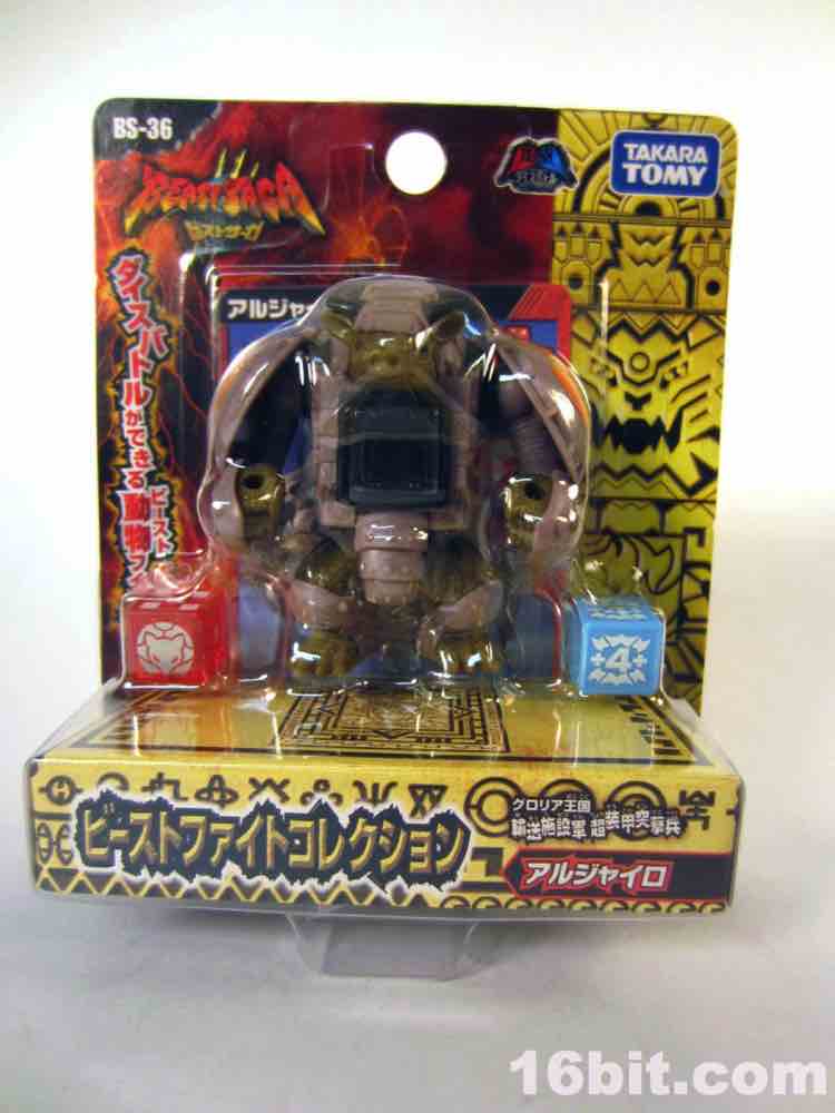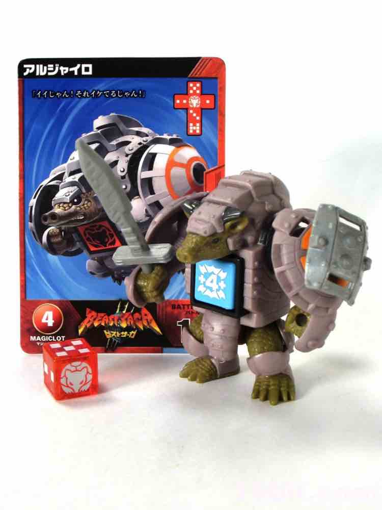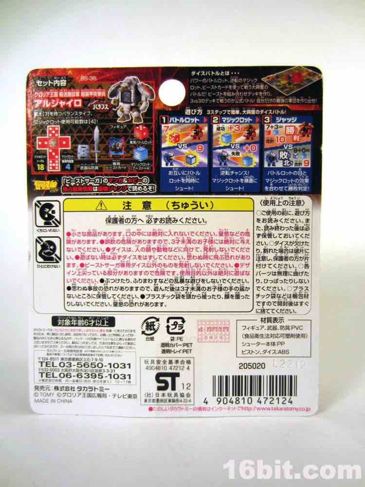 Item No.: BS-36 Manufacturer:Takara-Tomy Includes:Sword, shield, 2 dice, trading card Action Feature:Dice launch out of stomach Retail:525 yen (or about $7) Availability: March 2013 Other: Also translated as "Aljaro" early on
