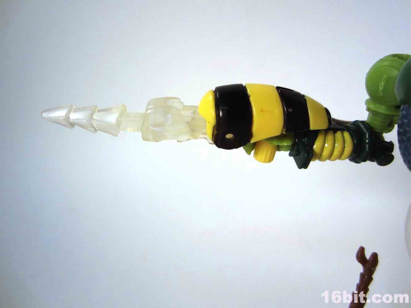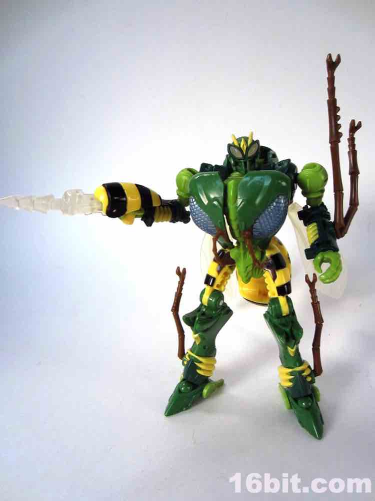 This toy comes with a comic book that has a fairly oddly-colored illustration that basically resembles the toy. The toy itself looks a lot like numerous existing illustrations and animation models of the character, minus the eye color. It is shockingly close to a number of illustrations and as such will probably be hugely popular with his fans for years to come - he has the strange mouth, the antenna, bug legs, and a nifty stinger gun. Oh, and no spring-loaded parts to break, too, that's a big plus.