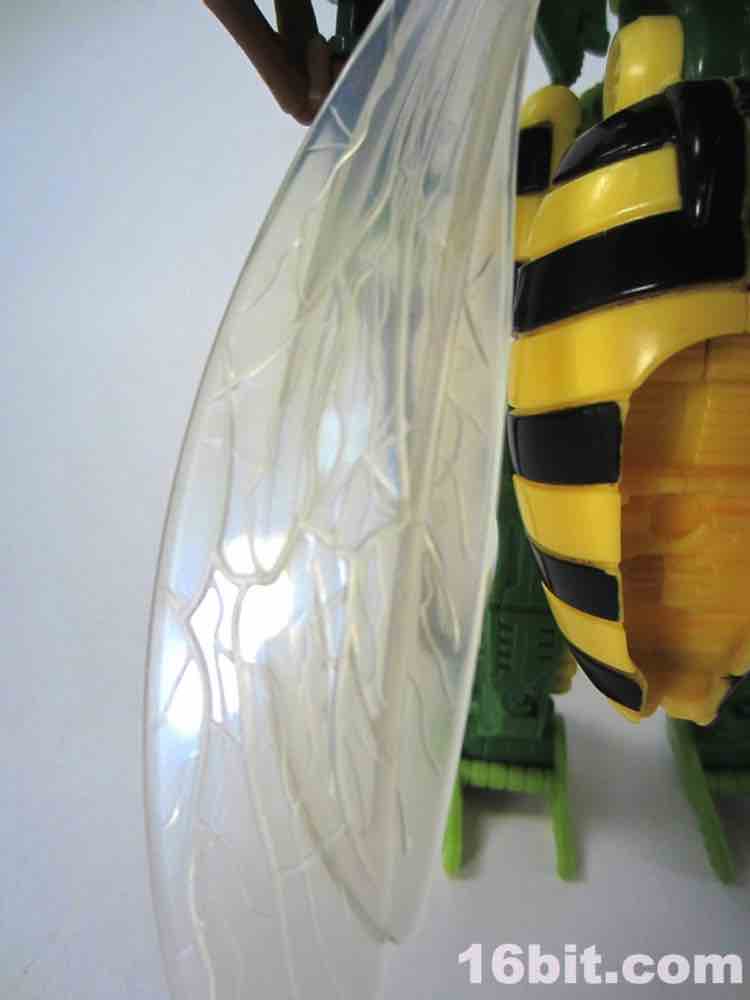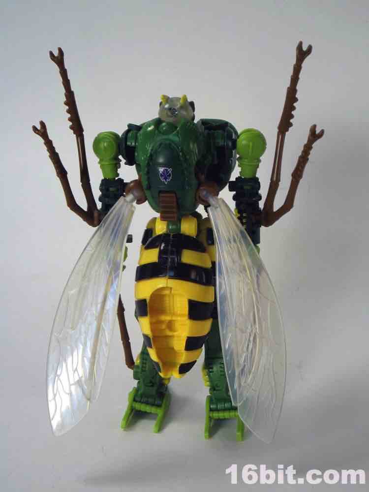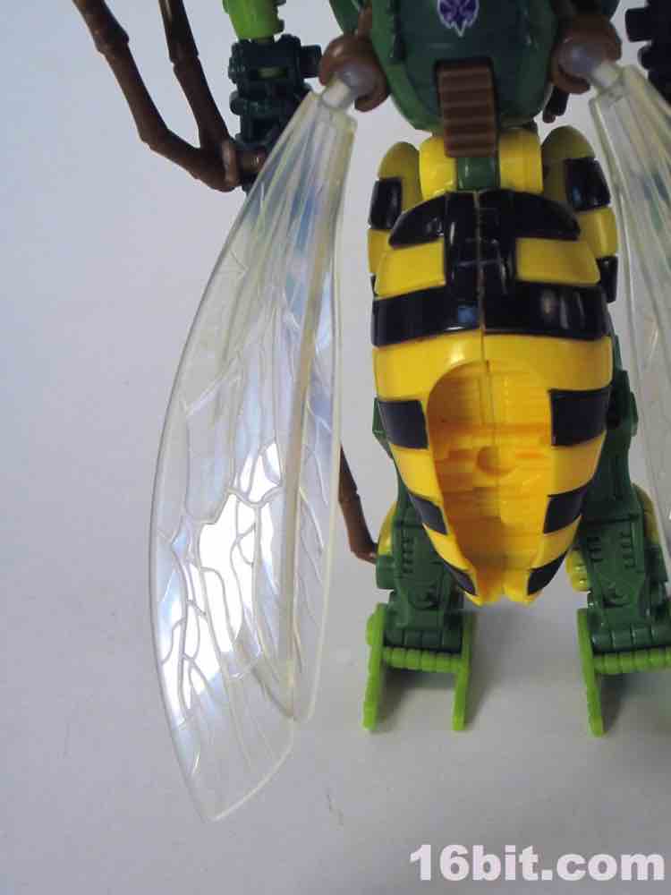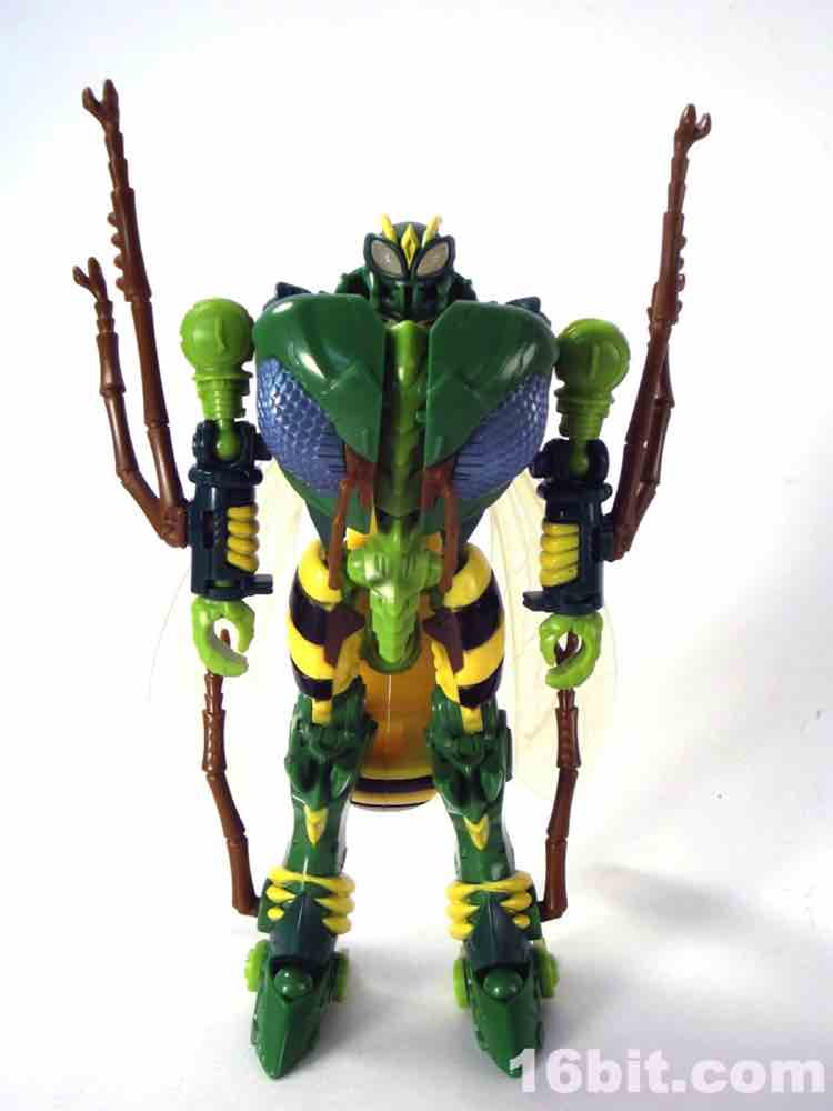 New sizable toys of Beast Wars characters are, to say the least, uncommon in North America. Hasbro hasn't put out new transforming versions of the characters in a while - we got Cheetor and Dinobot around 2009, Cybertron-era resculpts of Optimus Primal and Megatron around 2006, and a few repaints here and there. Waspinator is the first of two new releases in the "Thrilling 30" deluxe line from the series, along with a Voyager-class Rhinox released at about the same time. Much like the show from which he hails, the Predacon has a feverishly loyal following which is quite well-deserved. The writers had a lot of fun with a character that is little more than a dumb thug with a curious speech pattern. His personality is one of the most memorable in the entire Transformers mythos, so it makes sense he got two transforming toys in 2013.
