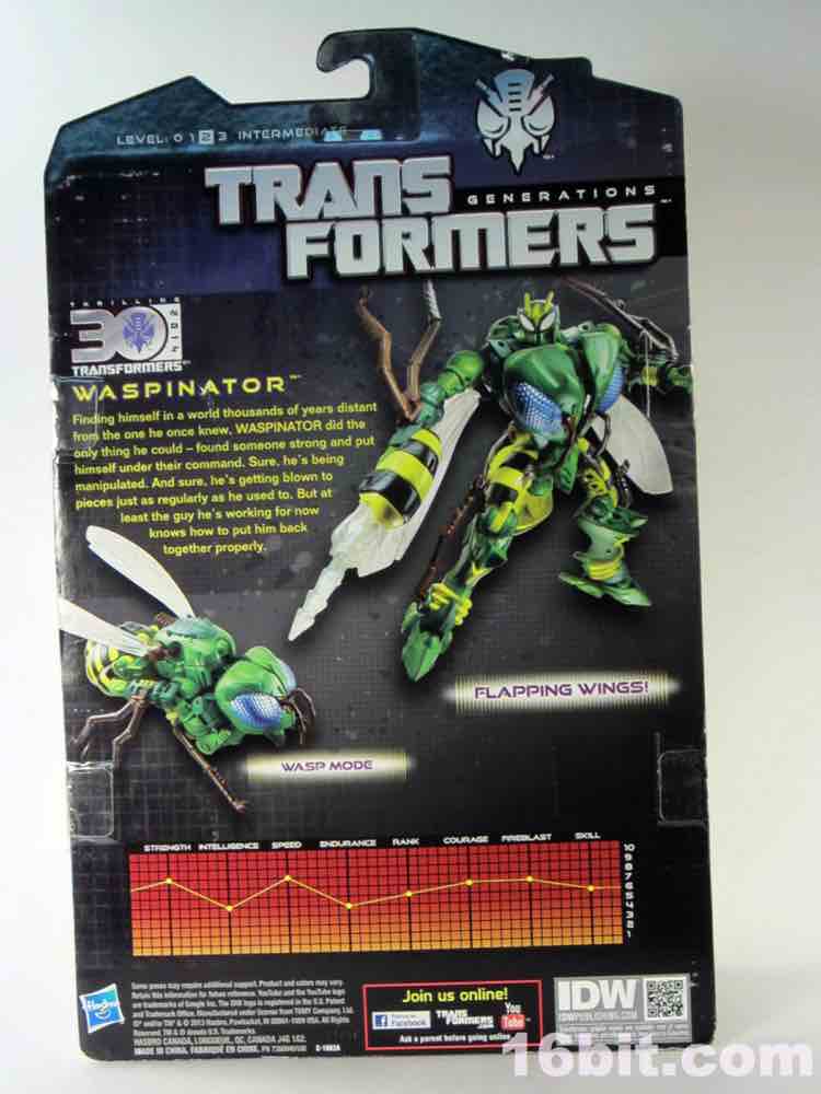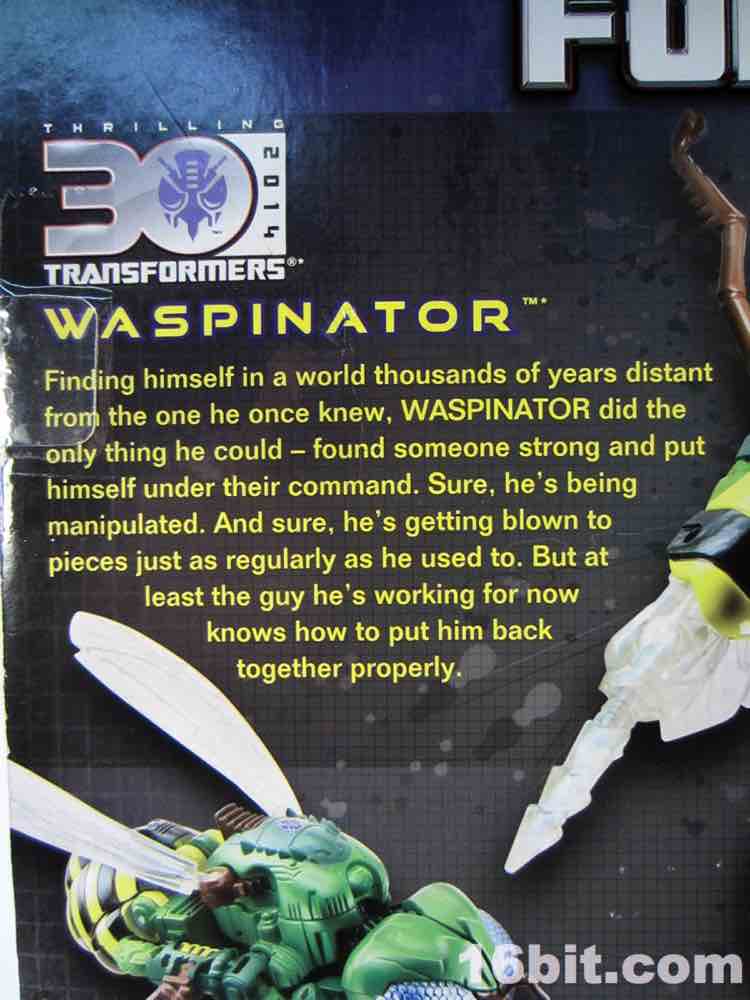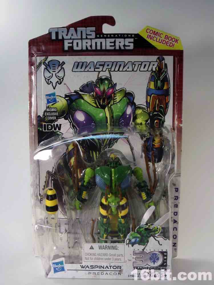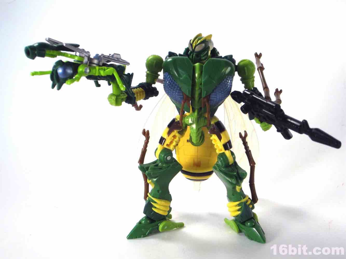 New sizable toys of Beast Wars characters are, to say the least, uncommon in North America. Hasbro hasn't put out new transforming versions of the characters in a while - we got Cheetor and Dinobot around 2009, Cybertron-era resculpts of Optimus Primal and Megatron around 2006, and a few repaints here and there. Waspinator is the first of two new releases in the "Thrilling 30" deluxe line from the series, along with a Voyager-class Rhinox released at about the same time. Much like the show from which he hails, the Predacon has a feverishly loyal following which is quite well-deserved. The writers had a lot of fun with a character that is little more than a dumb thug with a curious speech pattern. His personality is one of the most memorable in the entire Transformers mythos, so it makes sense he got two transforming toys in 2013.