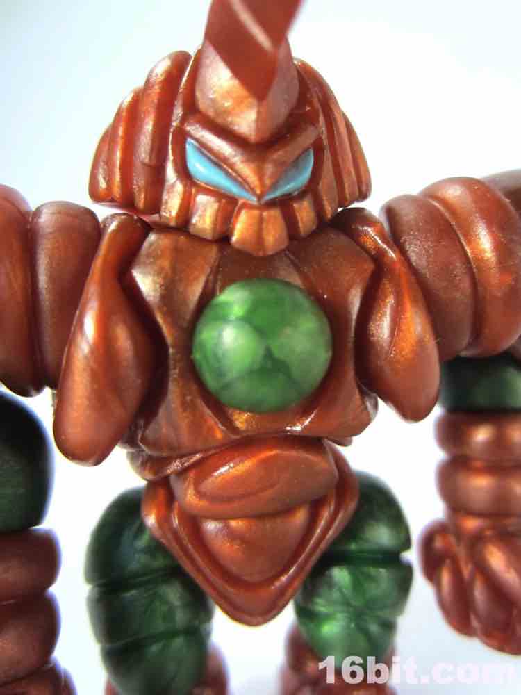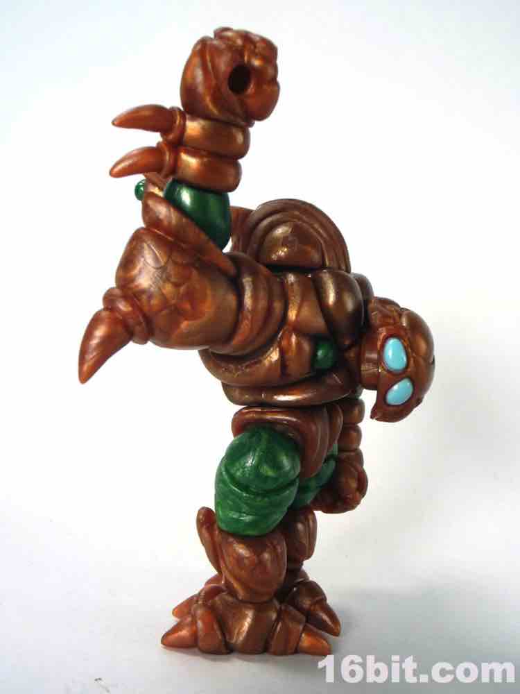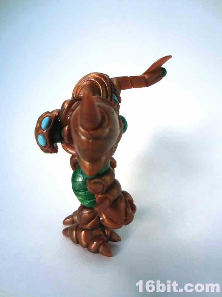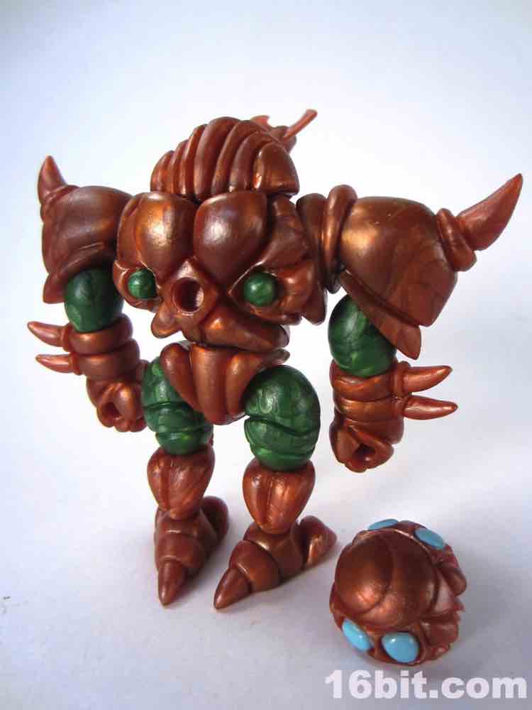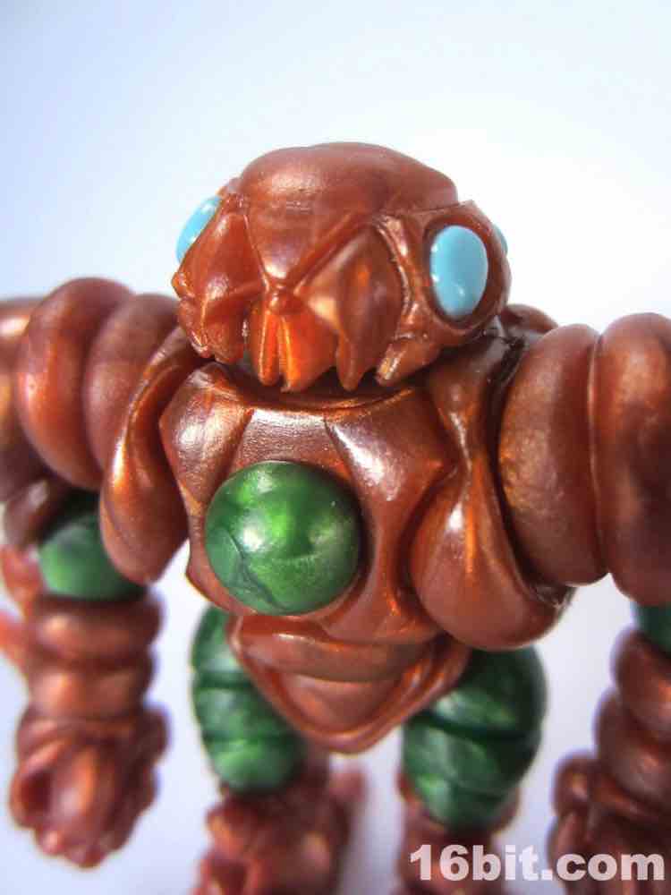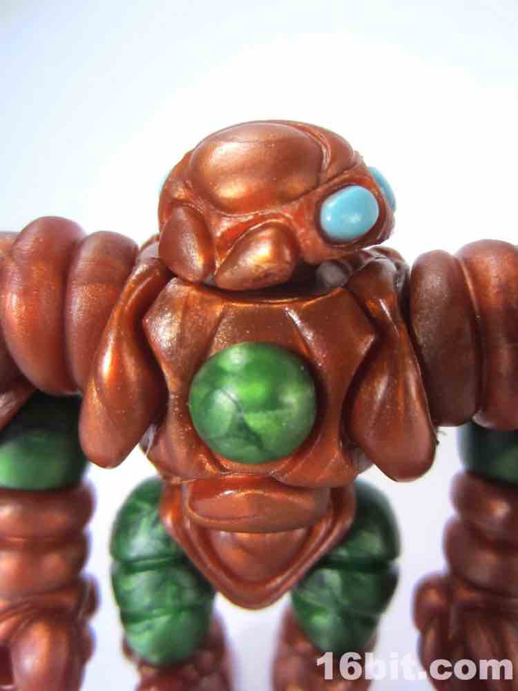 According to a trading card packed with the Mini-Mushi horde, Matt Doughty of Onell Design conceived of the design and Mr. Hansen did the sculpting, prototyping, and other production work. The end result is a gorgeous action figure that looks lively with its metallic finish, but at the same time gives me convulsions because I also collect Transformers and am keenly aware of problems as recently as 2000 with Gold Plastic Syndrome. We haven't heard of any reports of crumbling Glyos figures yet, but it's too soon to worry about that happening. It may never happen - it's just the kind of thing that makes me nervous, and will make me buy non-metallic brown Kabuto Mushi figures if those are ever produced. I'll play with those ones. Marty - consider MK II Kabuto Mushi figures in normal, boring brown and green plastics.