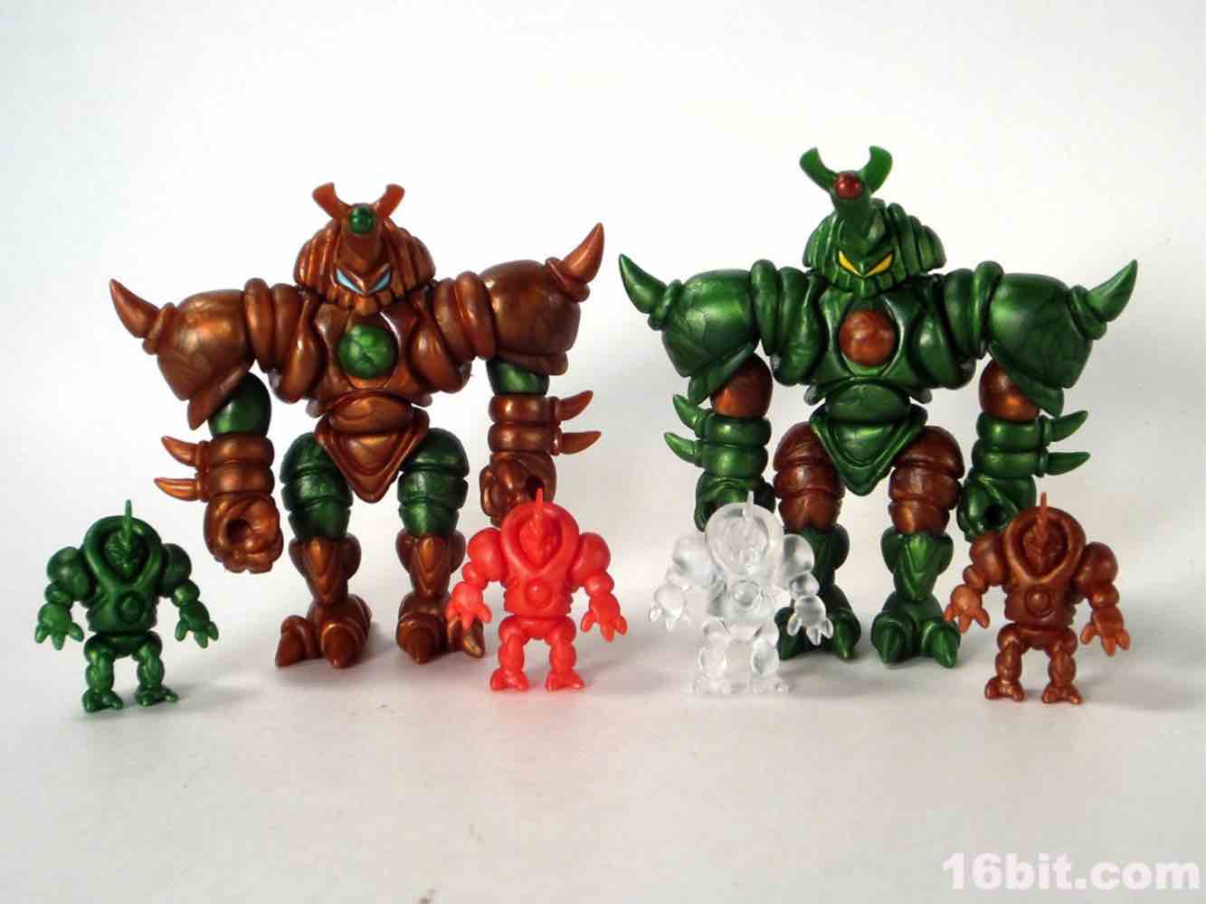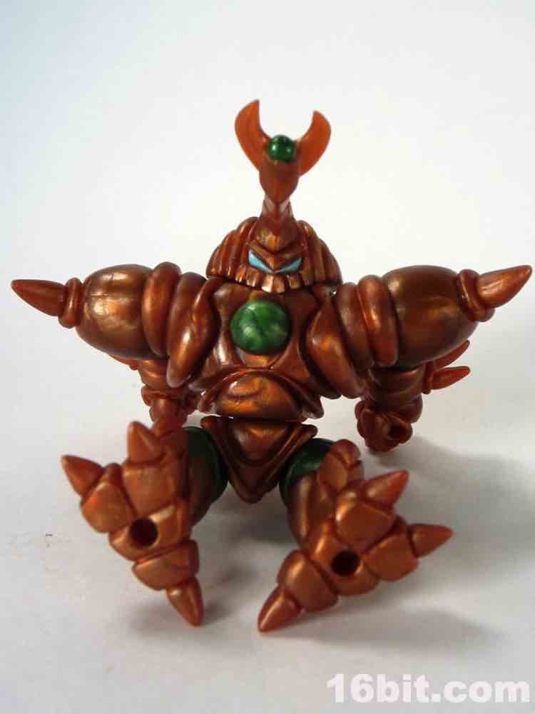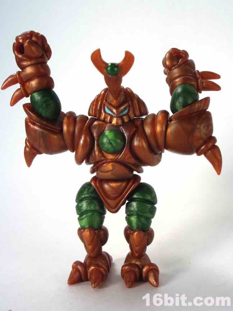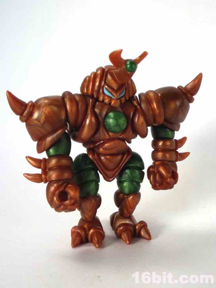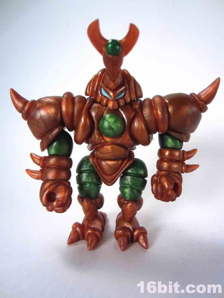 According to a trading card packed with the Mini-Mushi horde, Matt Doughty of Onell Design conceived of the design and Mr. Hansen did the sculpting, prototyping, and other production work. The end result is a gorgeous action figure that looks lively with its metallic finish, but at the same time gives me convulsions because I also collect Transformers and am keenly aware of problems as recently as 2000 with Gold Plastic Syndrome. We haven't heard of any reports of crumbling Glyos figures yet, but it's too soon to worry about that happening. It may never happen - it's just the kind of thing that makes me nervous, and will make me buy non-metallic brown Kabuto Mushi figures if those are ever produced. I'll play with those ones. Marty - consider MK II Kabuto Mushi figures in normal, boring brown and green plastics.