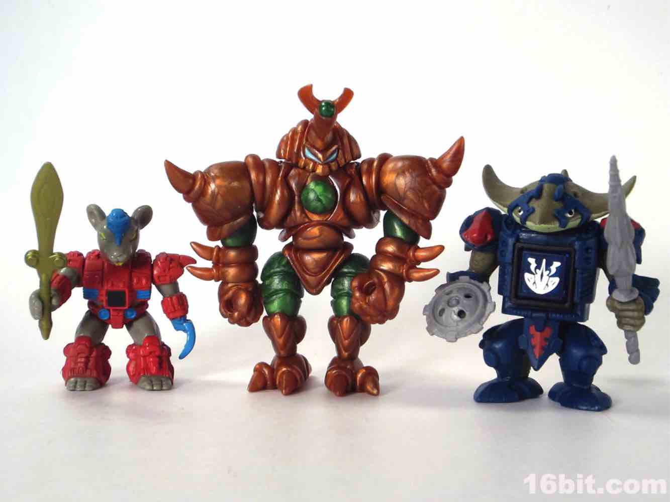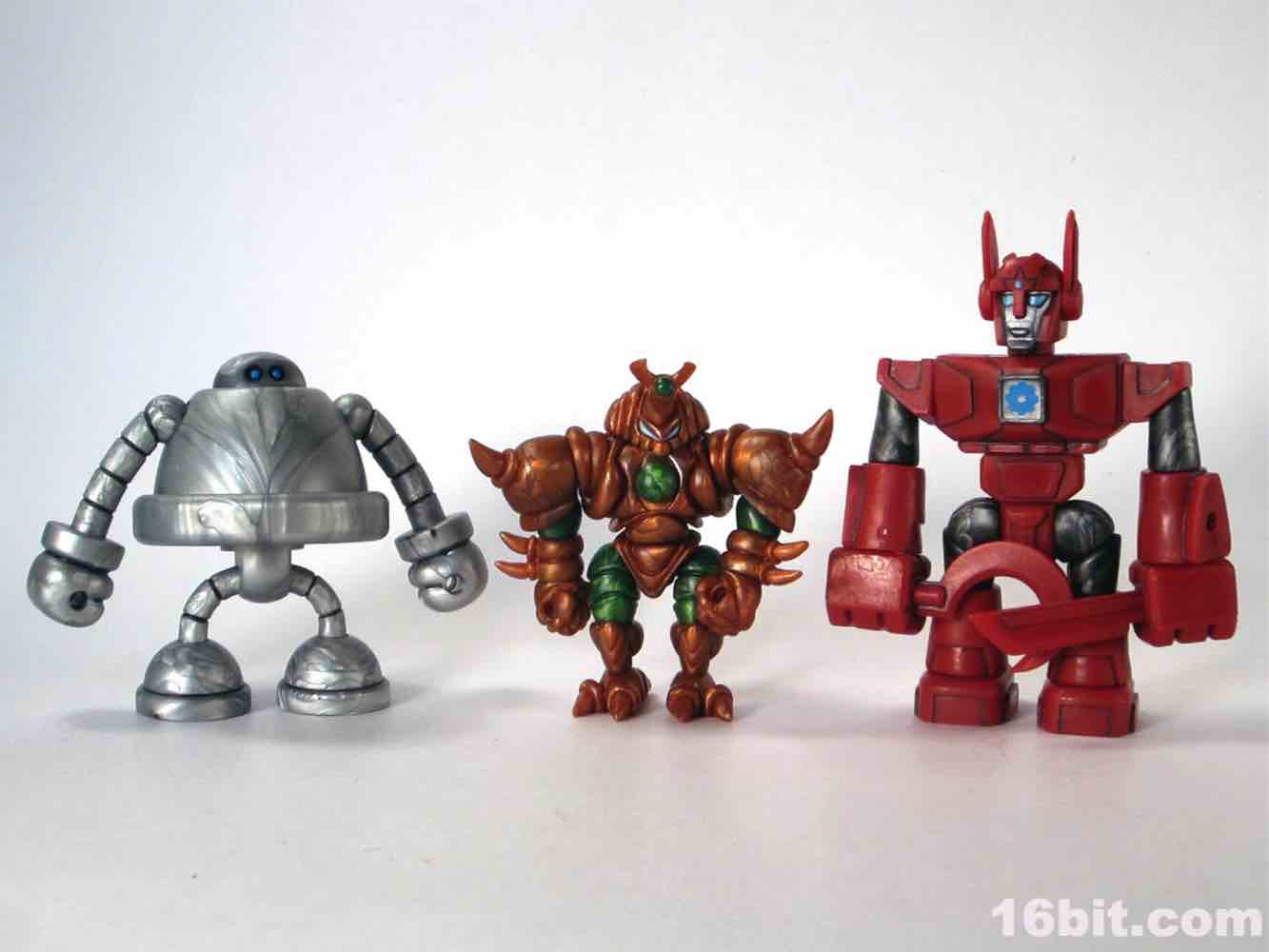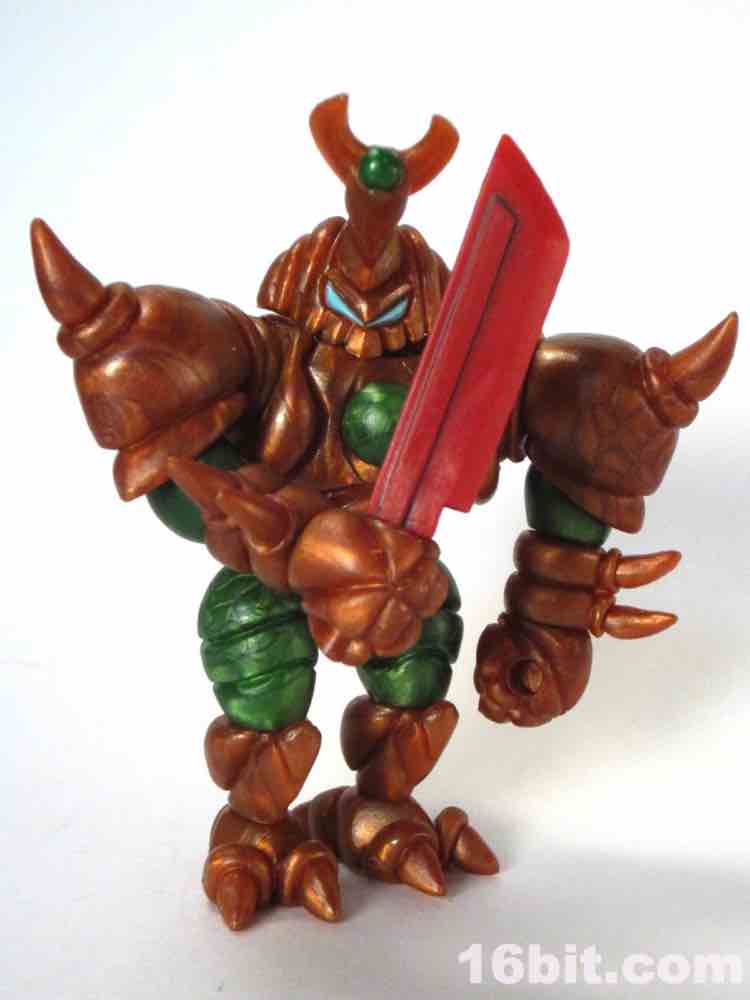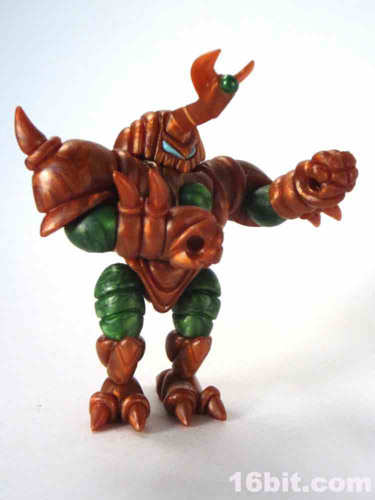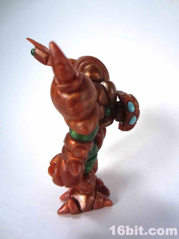 According to a trading card packed with the Mini-Mushi horde, Matt Doughty of Onell Design conceived of the design and Mr. Hansen did the sculpting, prototyping, and other production work. The end result is a gorgeous action figure that looks lively with its metallic finish, but at the same time gives me convulsions because I also collect Transformers and am keenly aware of problems as recently as 2000 with Gold Plastic Syndrome. We haven't heard of any reports of crumbling Glyos figures yet, but it's too soon to worry about that happening. It may never happen - it's just the kind of thing that makes me nervous, and will make me buy non-metallic brown Kabuto Mushi figures if those are ever produced. I'll play with those ones. Marty - consider MK II Kabuto Mushi figures in normal, boring brown and green plastics.