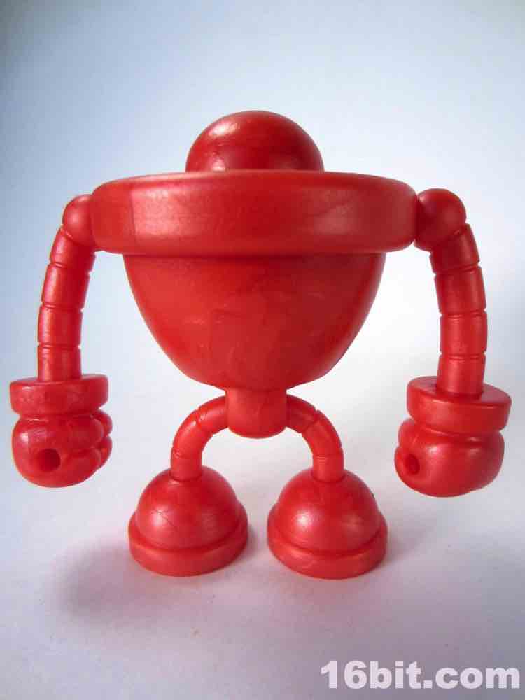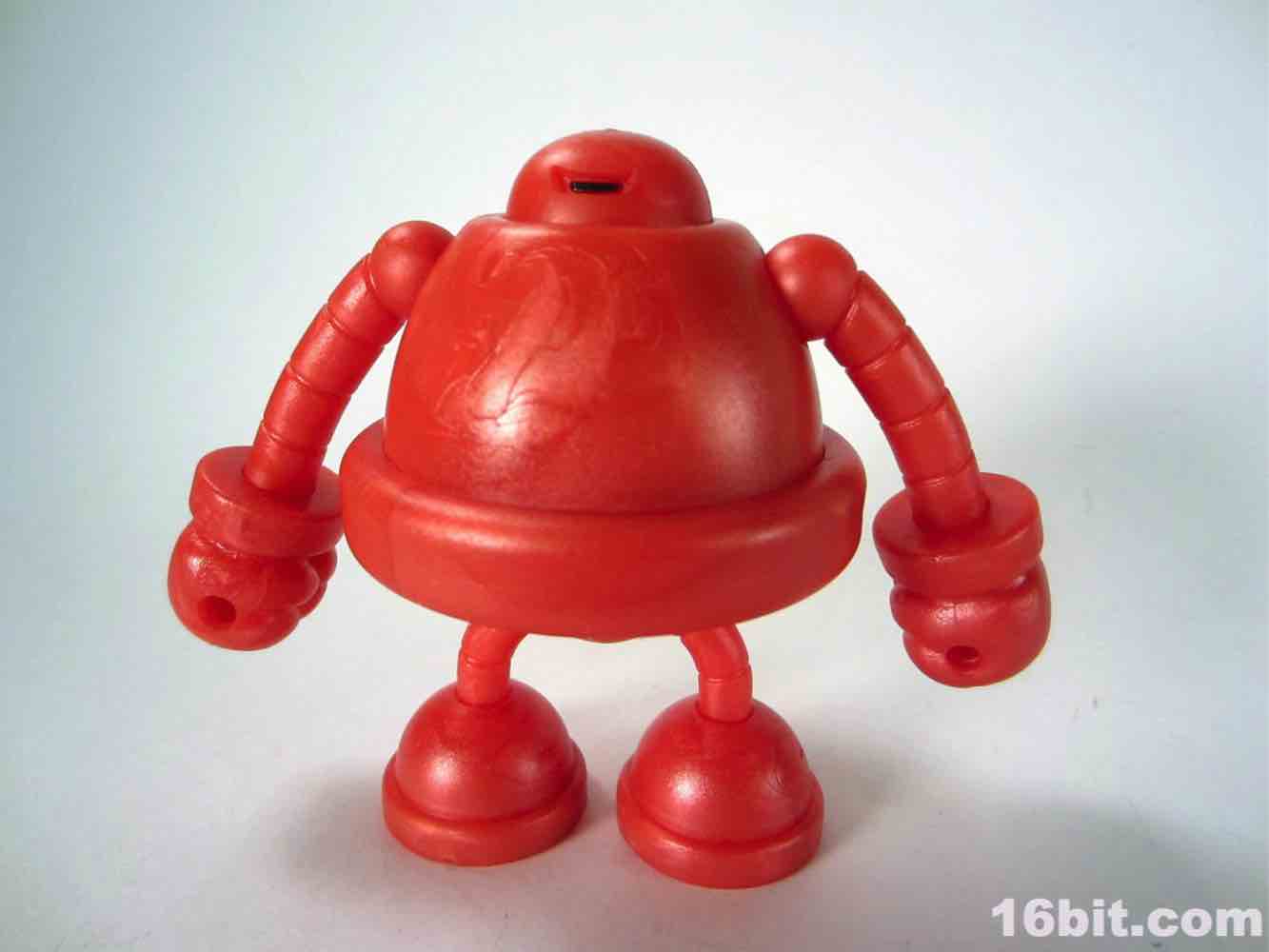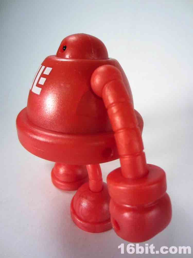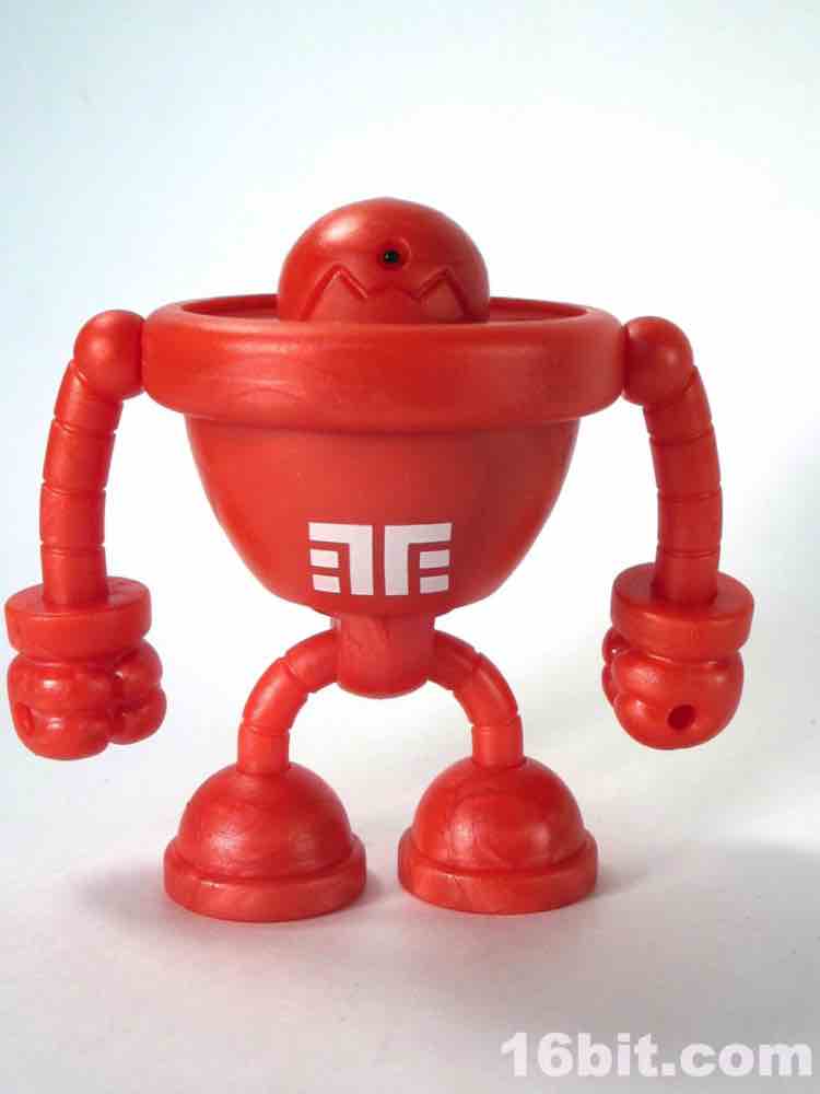 The big, boxing glove-like hands are likely to make this figure a gem for anyone who enjoys swapping around parts. Mixing and matching with other Gobon figures is always fun, particularly when Mr. Doughty cranks out a festive, candylike color such as this. (A year ago, we got a swell blue Gendrone Legion Gobon.) I prefer the default configuration of this one, mostly because I find the black dot eyes to be less compelling on the alternate head. The blue Gobon's red eye had a black outline, plus the added panel lines on the arms and mouth gave him some "oomph." It's not that this figure lacks oomph - but it could stand for a little something more to make it stand out. Well, perhaps that's silly or short-sighted of me to say - the pearlescent red is sure to pop on any toy shelf, and the design remains charming several years after its first release.