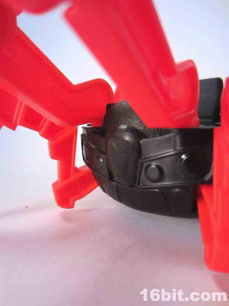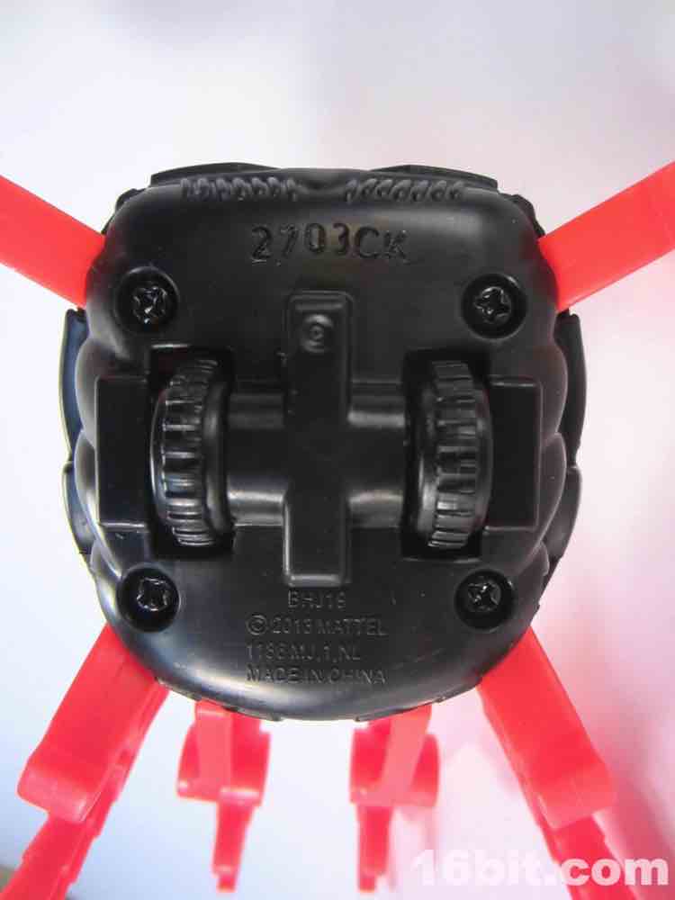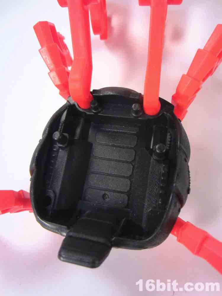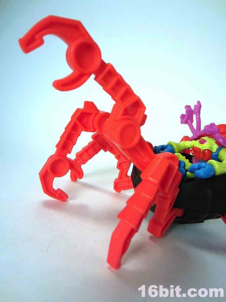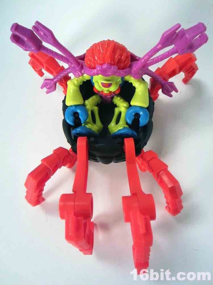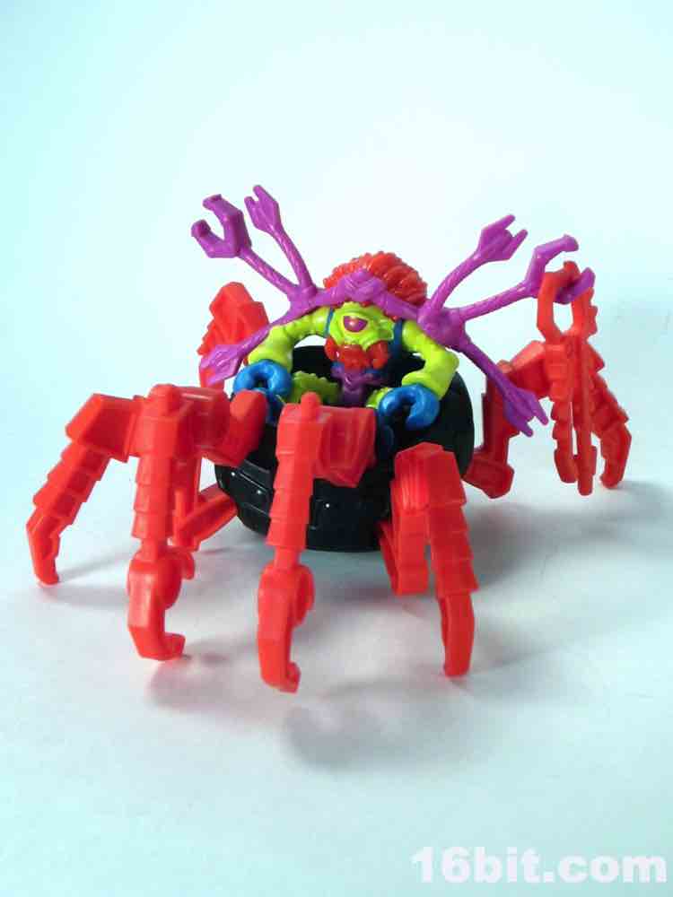 While the scorpion vehicle seemed small, the crab vehicle seems cheap. You get about a dozen plastic pieces slapped together with articulated claws, rolling wheels, and geared legs that "walk" as it goes along the carper or floor. The figure fits right in the seat and can easily grip the controls in his hands. There's a place to stick a weapon near his seat, but not this weapon - the lobster-cracker doesn't have a peg to fit in the hole, so it can hold it or you can set it aside. It's certainly a distinctive weapon, and the vehicle itself has a little "face" under the chair and no paint of any kind. Mattel really made sure costs were kept down here, but it's still a neat little thing for the price.
