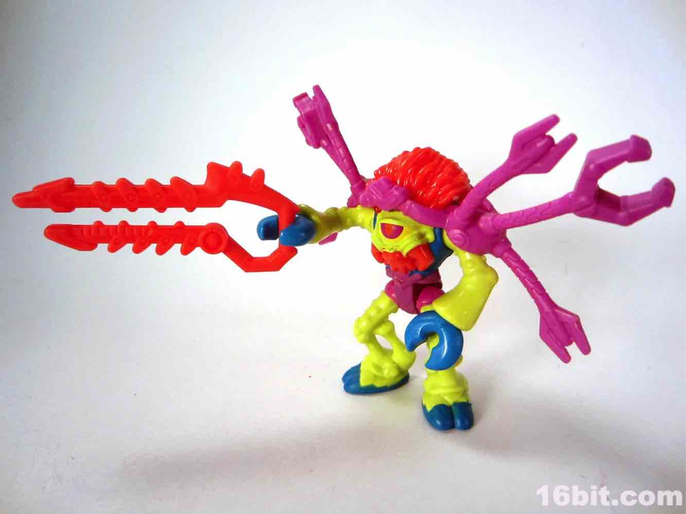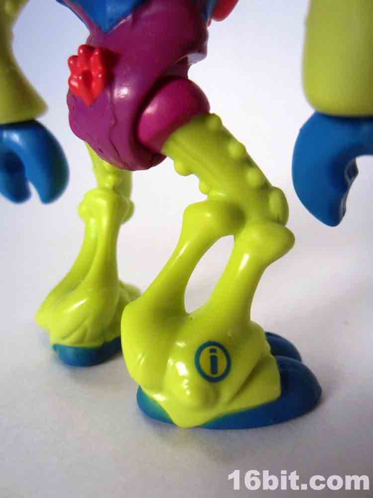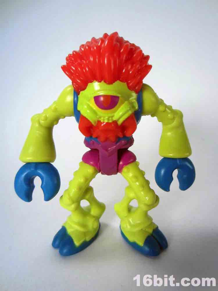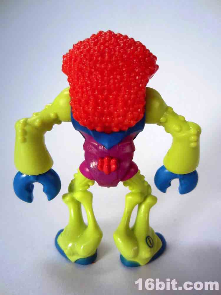 The 3-inch green figure has blue claws and red hair like Blanka from Street Fighter II. His legs are bony, but by and large he could pass as an alien crab. Sure, he's got a little red tail on his butt but who am I to judge? Sculpting is on par with or better than most Imaginext figures (in that it has original sculpting) and he's got a little "i" branded on his ankle. Compared to the creatures in the blind-bags or previous years of Space figures, this is pretty amazing. The detail is positively toylike and the bright, neon colors are sure to blind collectors from its greatness. It wouldn't stun me to see this mold redecorated in the future, warts and all. (It has warts.)
