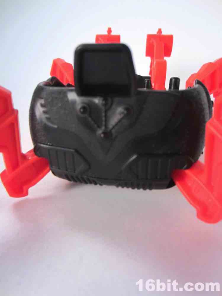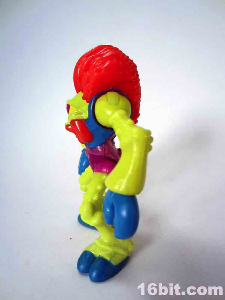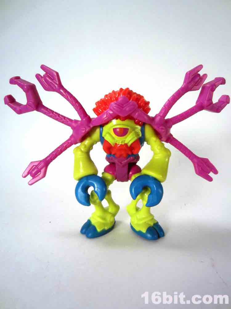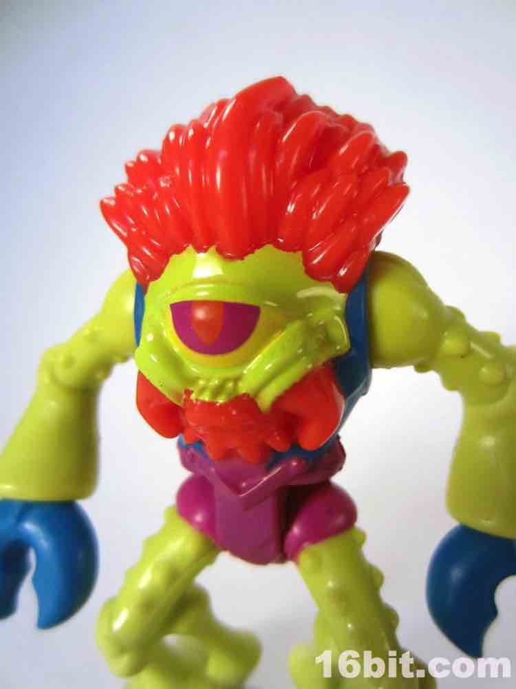 The 3-inch green figure has blue claws and red hair like Blanka from Street Fighter II. His legs are bony, but by and large he could pass as an alien crab. Sure, he's got a little red tail on his butt but who am I to judge? Sculpting is on par with or better than most Imaginext figures (in that it has original sculpting) and he's got a little "i" branded on his ankle. Compared to the creatures in the blind-bags or previous years of Space figures, this is pretty amazing. The detail is positively toylike and the bright, neon colors are sure to blind collectors from its greatness. It wouldn't stun me to see this mold redecorated in the future, warts and all. (It has warts.)