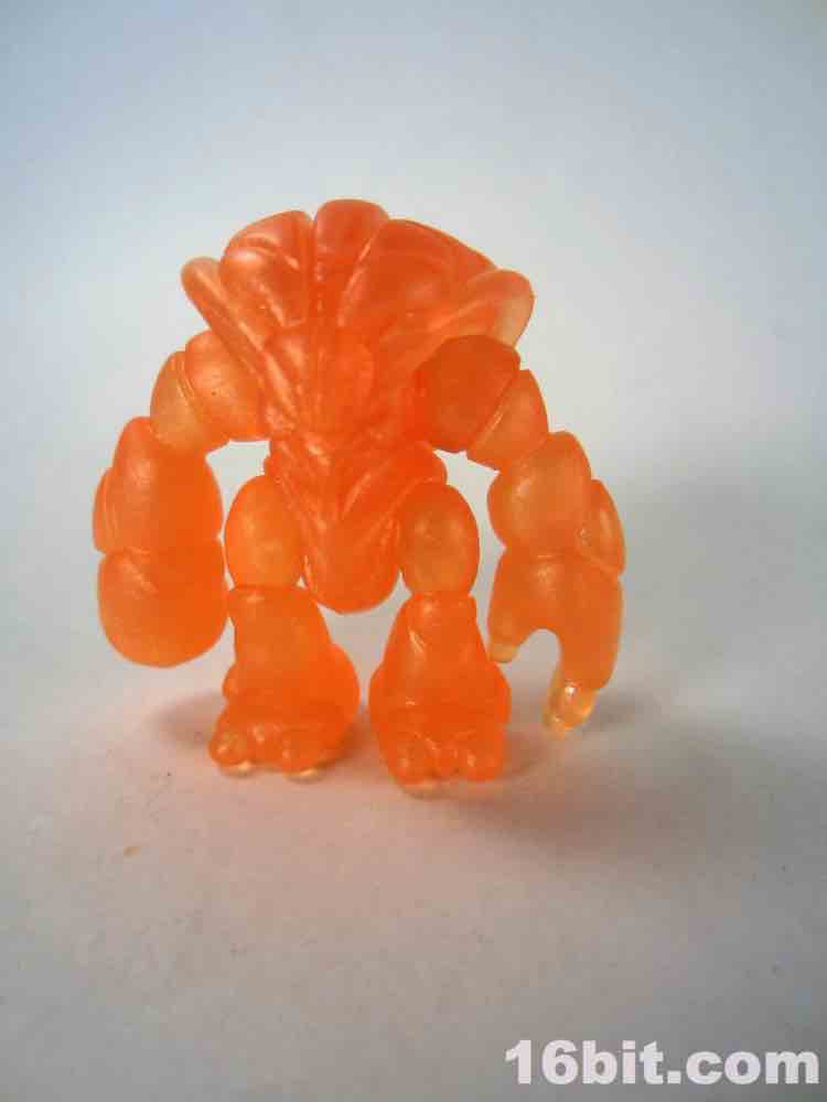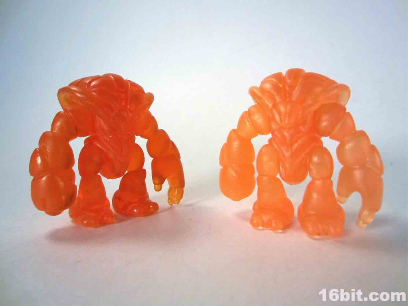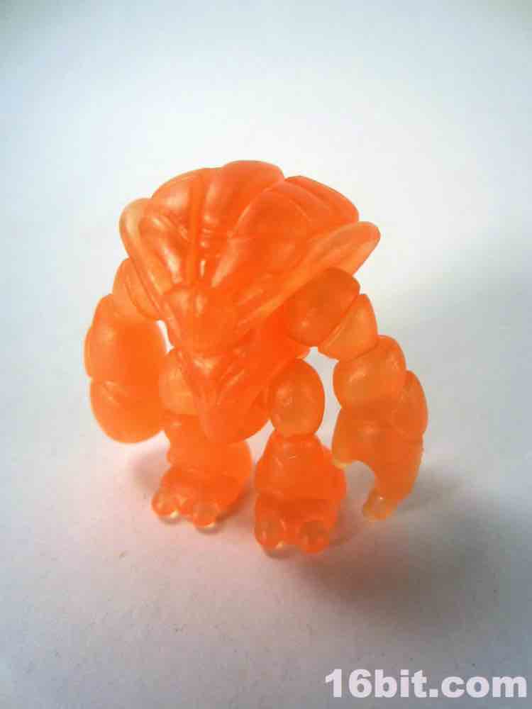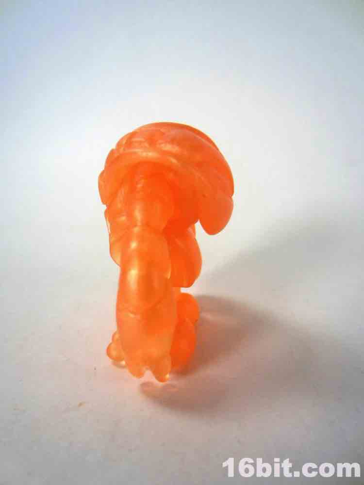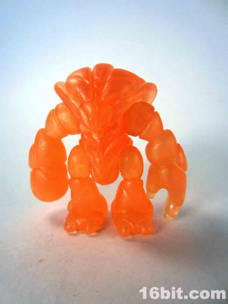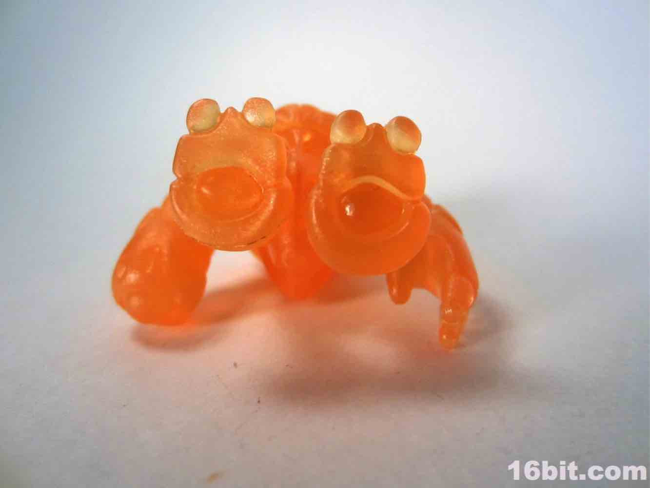 The newer orange figure is incredibly bright even in a dark room, thanks to the metallic, quasi-pearly finish. It's the middle of the night, and I'm in my basement, and a tiny glow from the screens lights up the figure so that I can make out the sculpted detail. The previous orange figure lights up around the edges, but most of the fine detail is lost in the shadows. As the clear Crayboth figures have yet to come with any painted highlights, it relies on how light bounces off its carapace - and I'm pleased to say that this color works quite well for the small, crablike design.