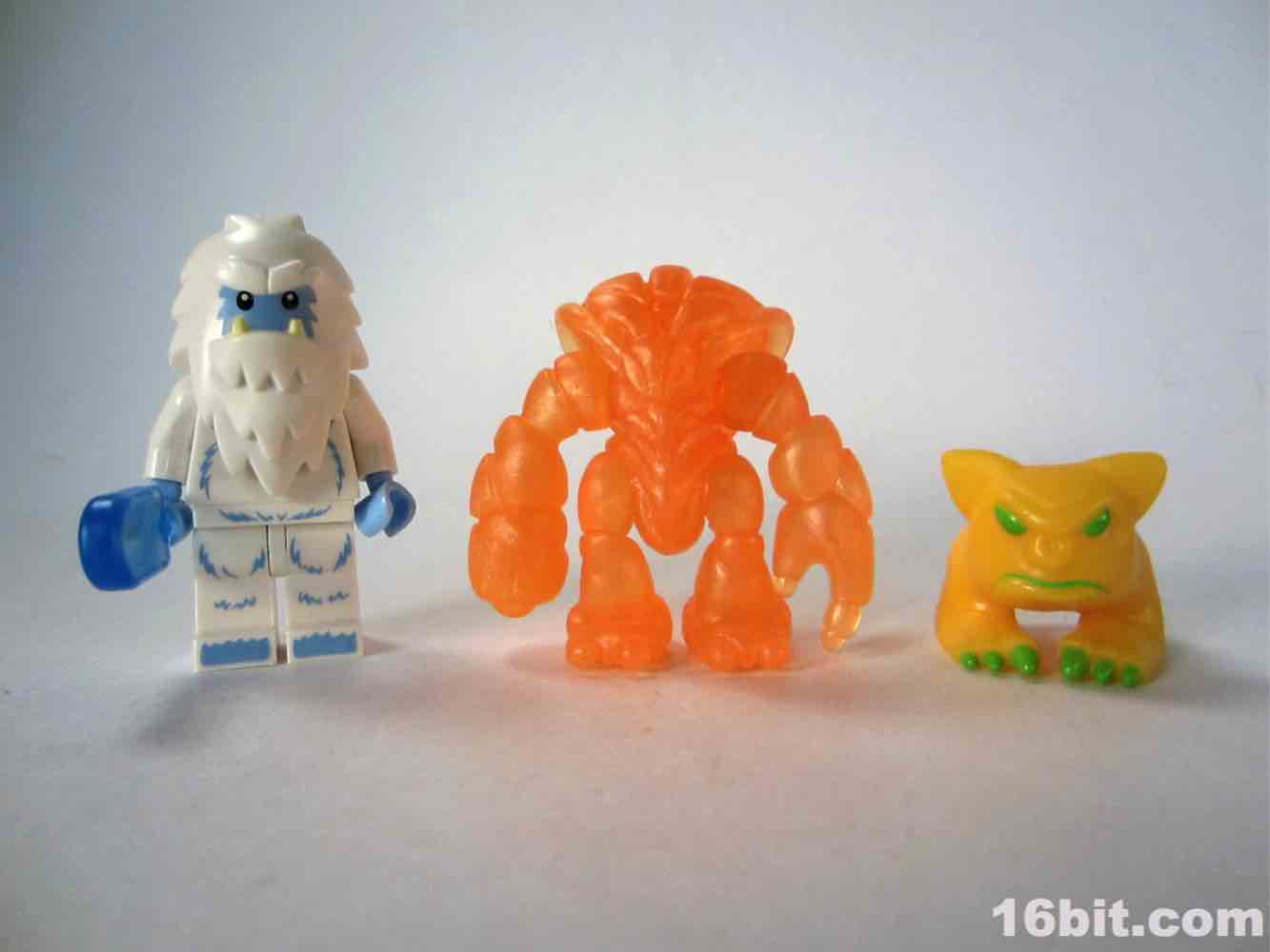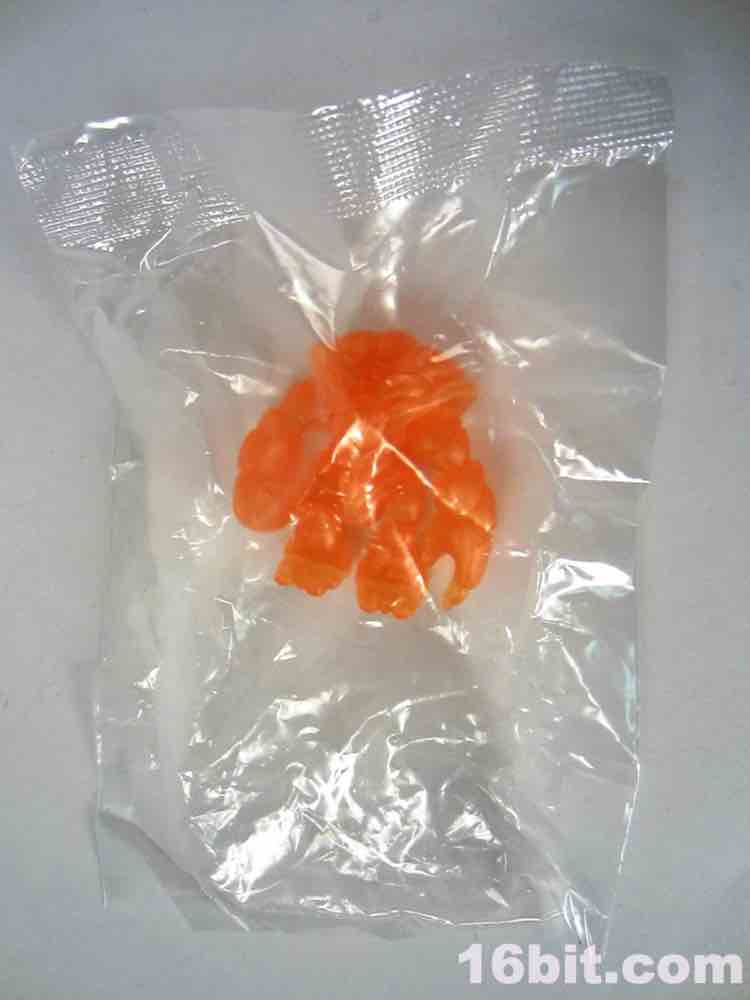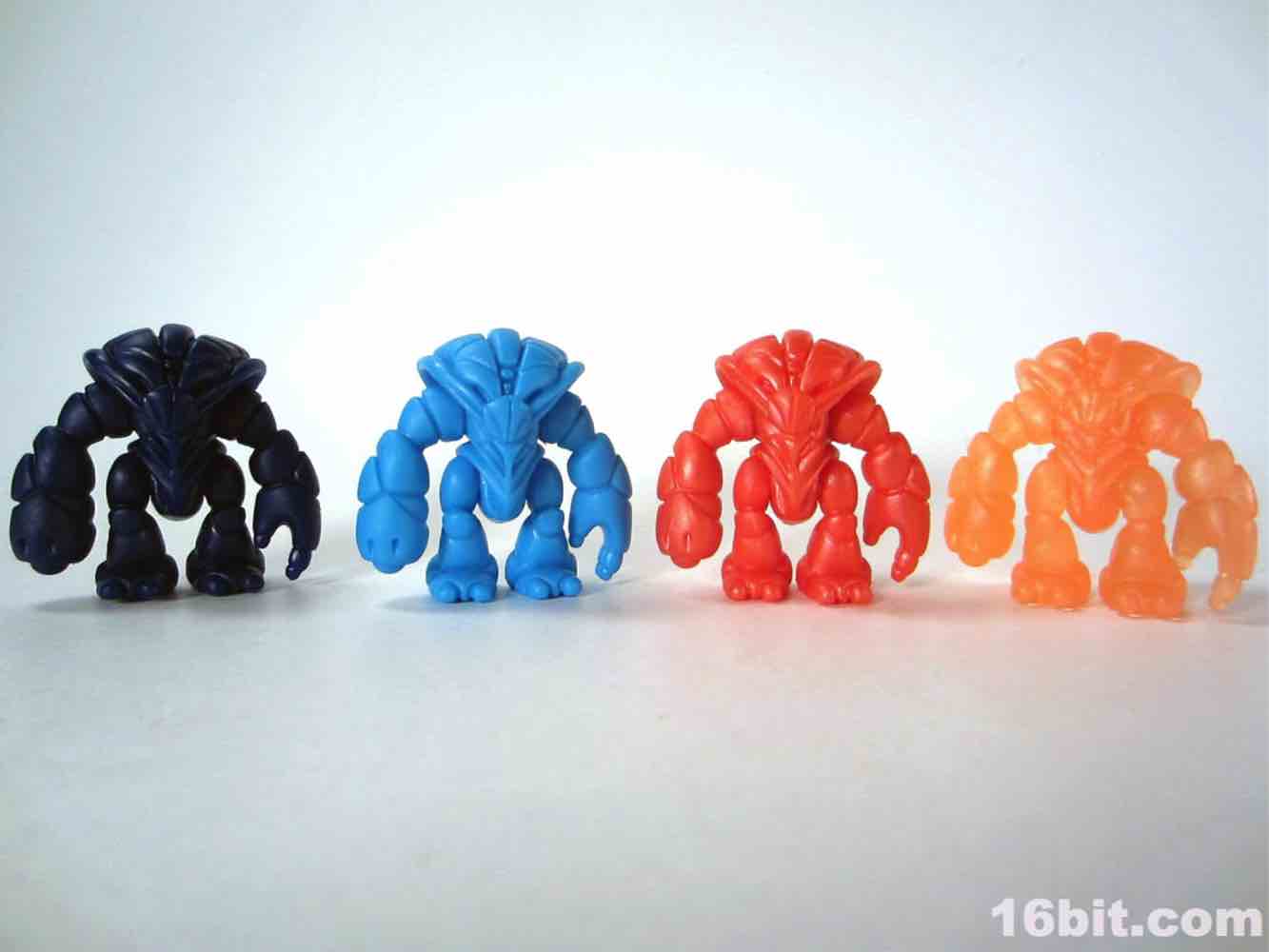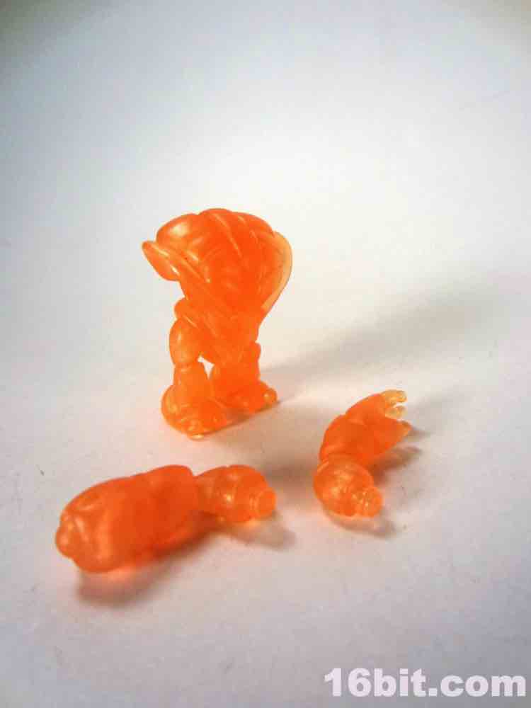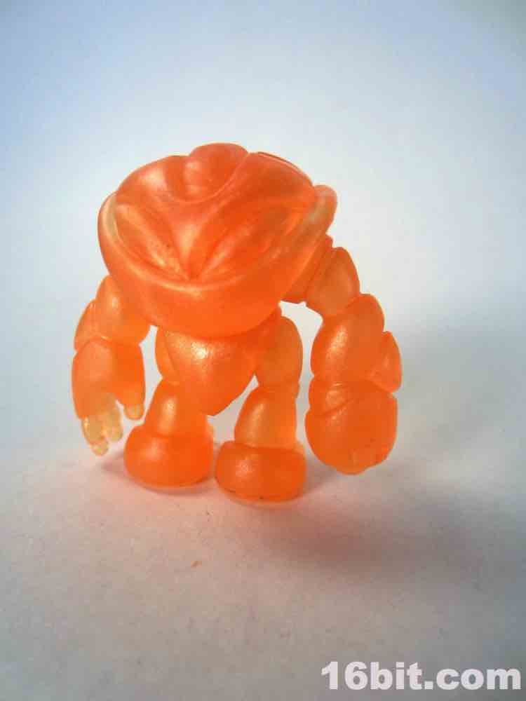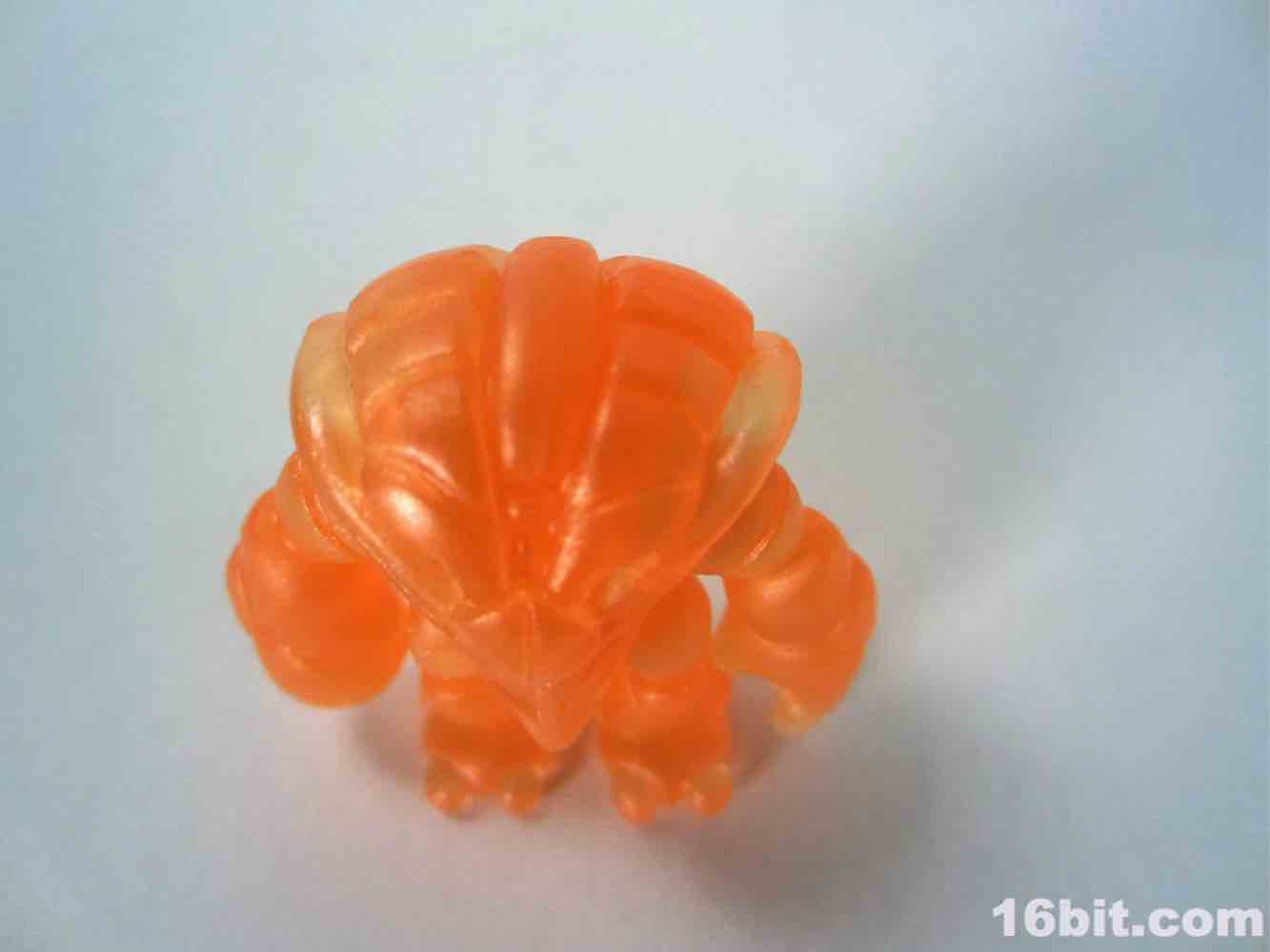 The newer orange figure is incredibly bright even in a dark room, thanks to the metallic, quasi-pearly finish. It's the middle of the night, and I'm in my basement, and a tiny glow from the screens lights up the figure so that I can make out the sculpted detail. The previous orange figure lights up around the edges, but most of the fine detail is lost in the shadows. As the clear Crayboth figures have yet to come with any painted highlights, it relies on how light bounces off its carapace - and I'm pleased to say that this color works quite well for the small, crablike design.