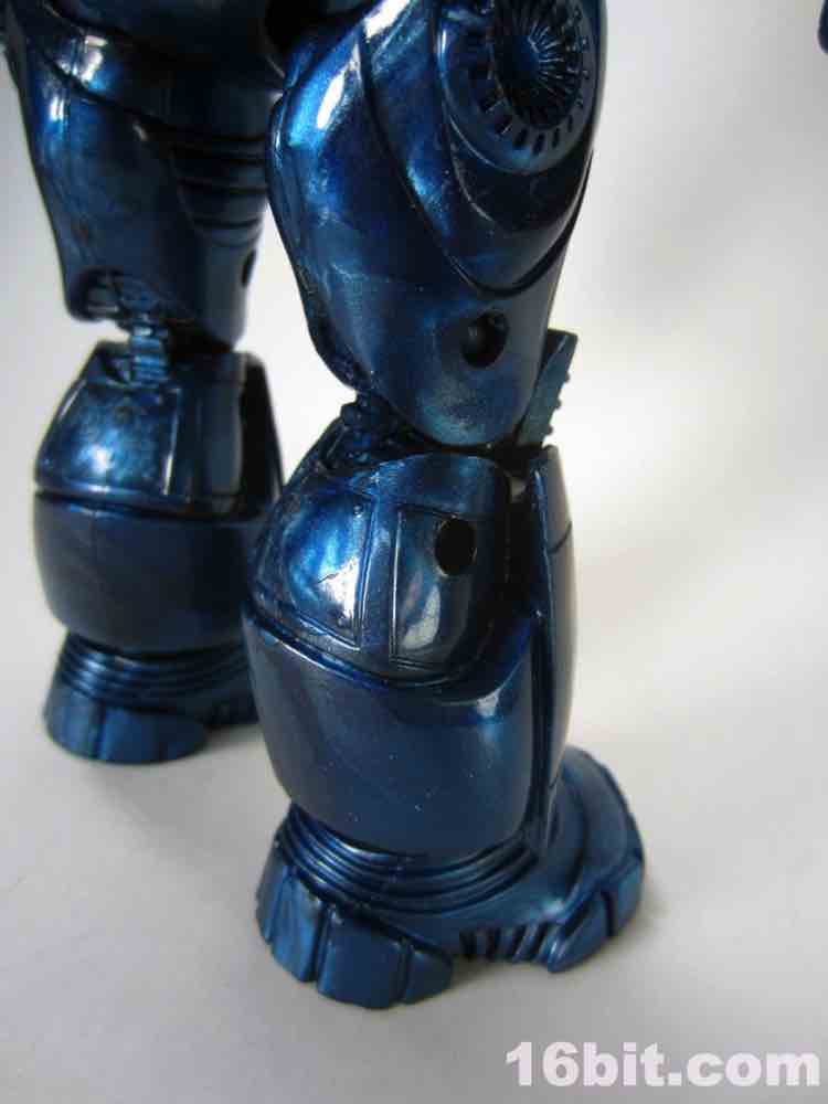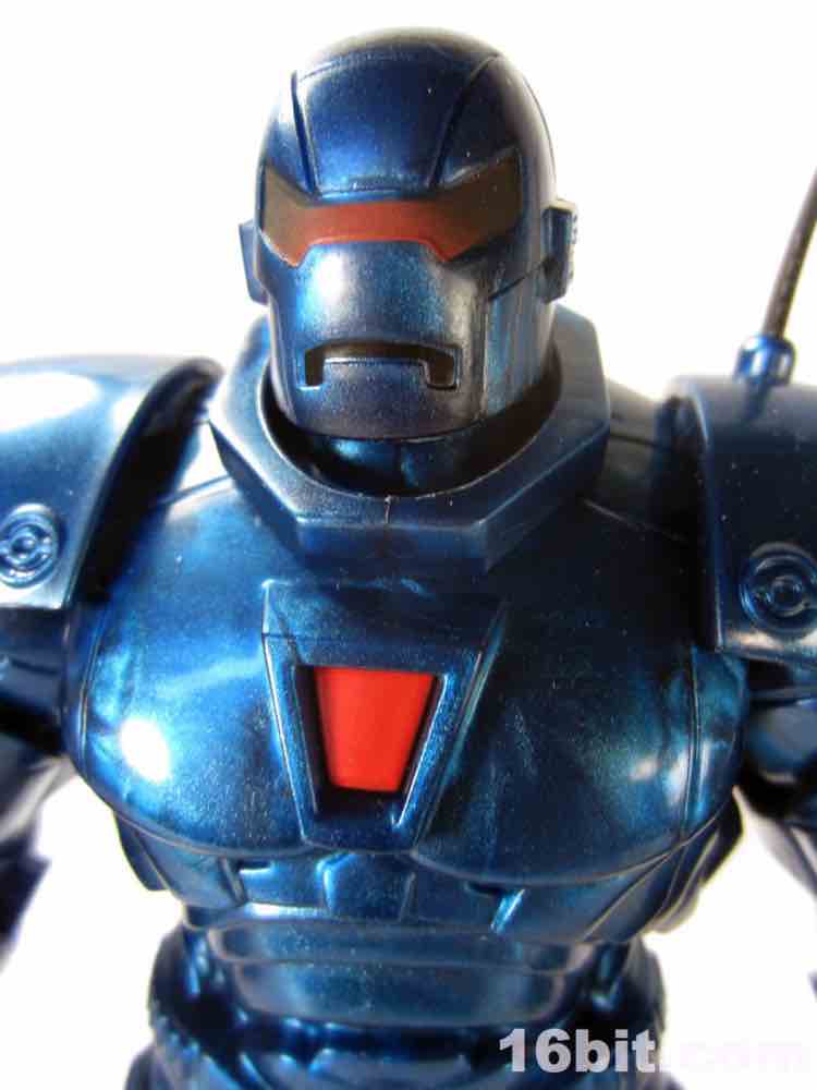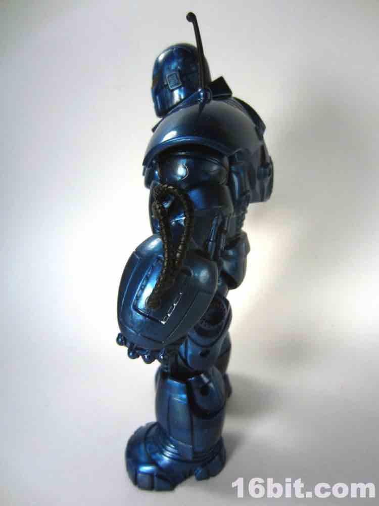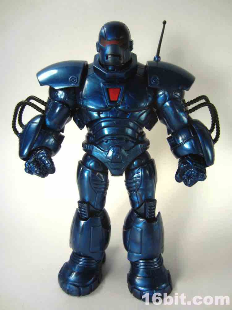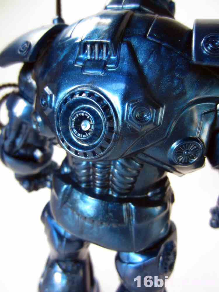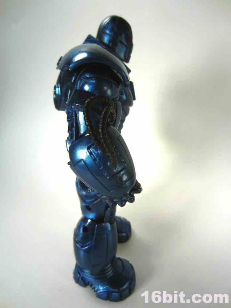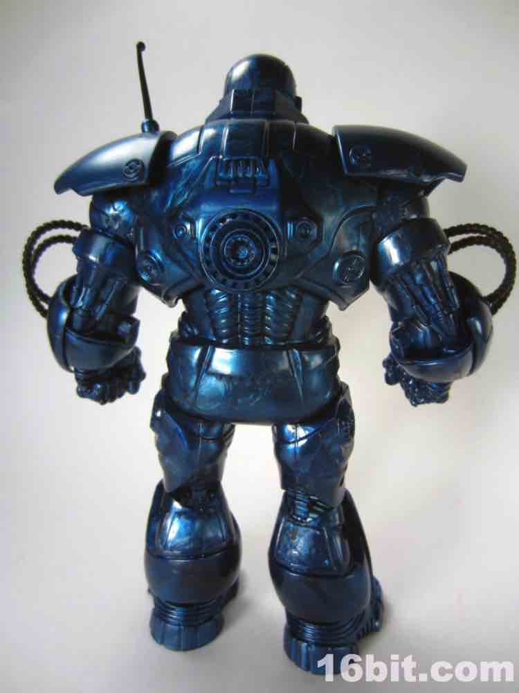 The figure itself - which is being retooled as 2014's Captain America Marvel Legends Mandroid - is really spiffy. With 20 points of articulation, Hasbro made this figure in swirly metallic blue plastic which has me nervous for its longevity - it's pretty gorgeous, assuming the swirls aren't in an ugly spot. At this size I'm sure this worked better than the flat-blue of the 3 3/4-inch Iron Monger, but here on my desk I am quite impressed. The figure has very little paint other than a couple of red highlights and a bit of black here and there, so I have no doubt Hasbro is really getting its money's worth out of this 8-inch behemoth. It is truly an impressive specimen, with a few similarities to the previously released smaller figure.