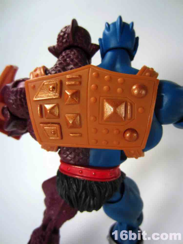 As always the 7-inch buck has been modified, although this time there are tons of new parts. The purple half is sculpted with incredibly scales, and it appears all of the purple bits are totally new. Badra's blue half reuses a few arm and leg pieces, but the double-headed torso, new glove, and new boot were probably still pretty expensive. The double-headed chest armor has some metallic orange markings on it that really make the details pop nicely.